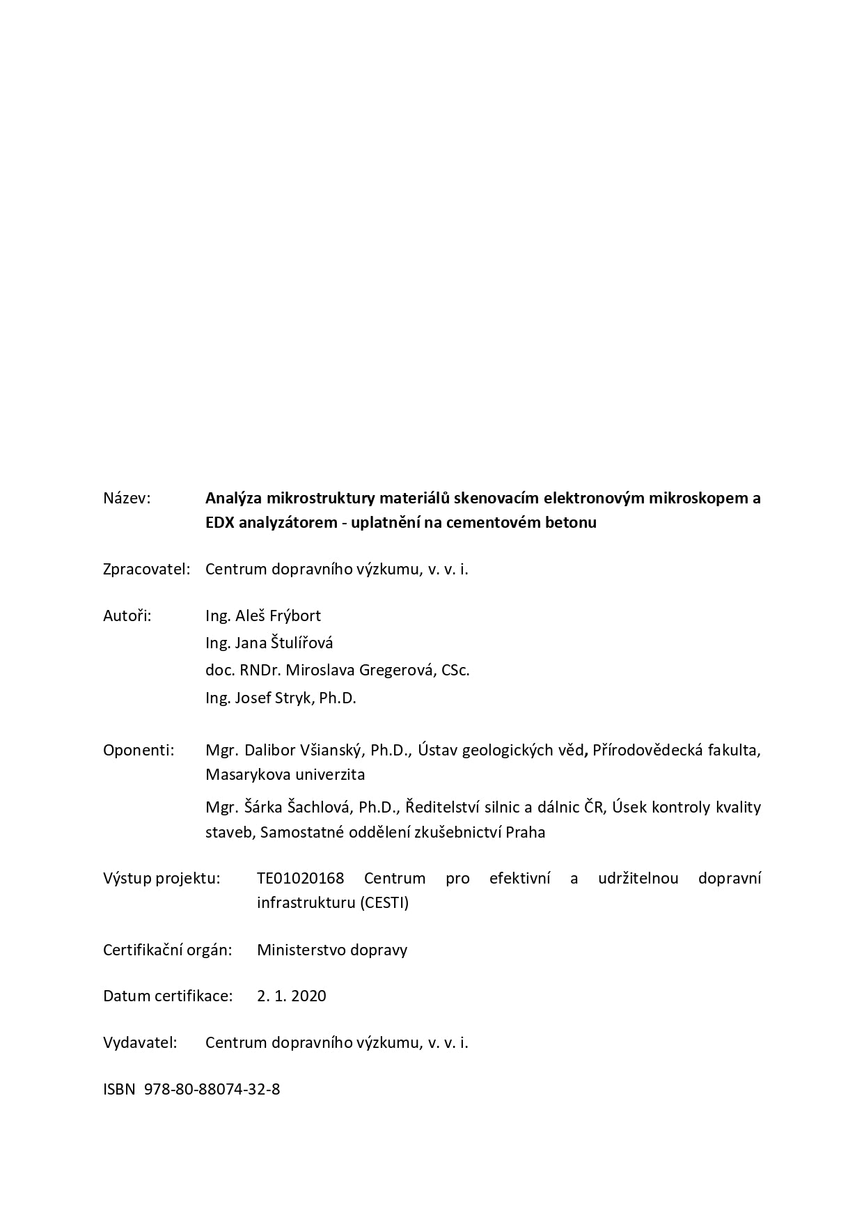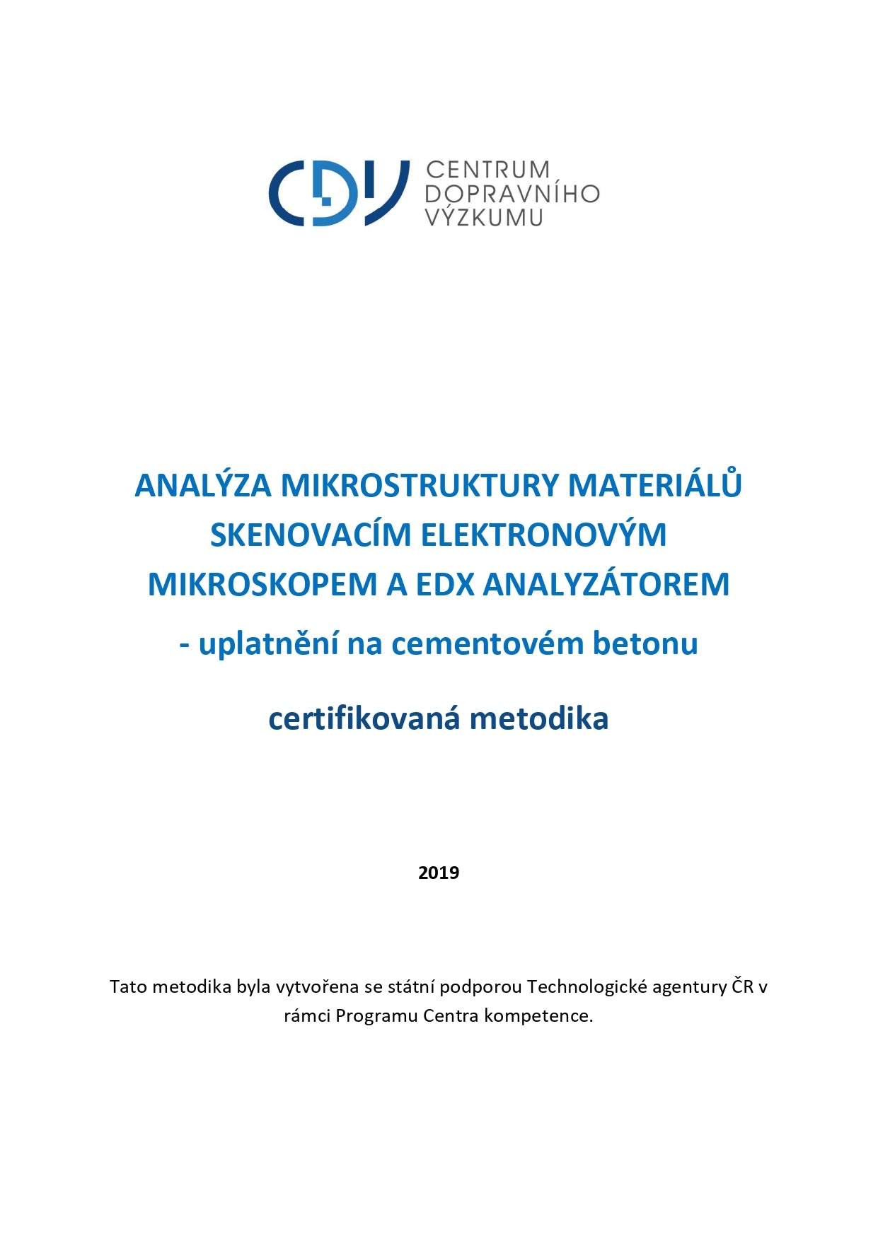 Metodika popisuje využití kombinace skenovacího elektronového mikroskopu (SEM - Scanning Electron Microscopy) a energiově-disperzního rentgenového analyzátoru (EDX - Energy Dispersive X-ray spectroscopy) při analýze mikrostruktury a degradačních procesů materiálů používaných v dopravní infrastruktuře, zejména betonu.