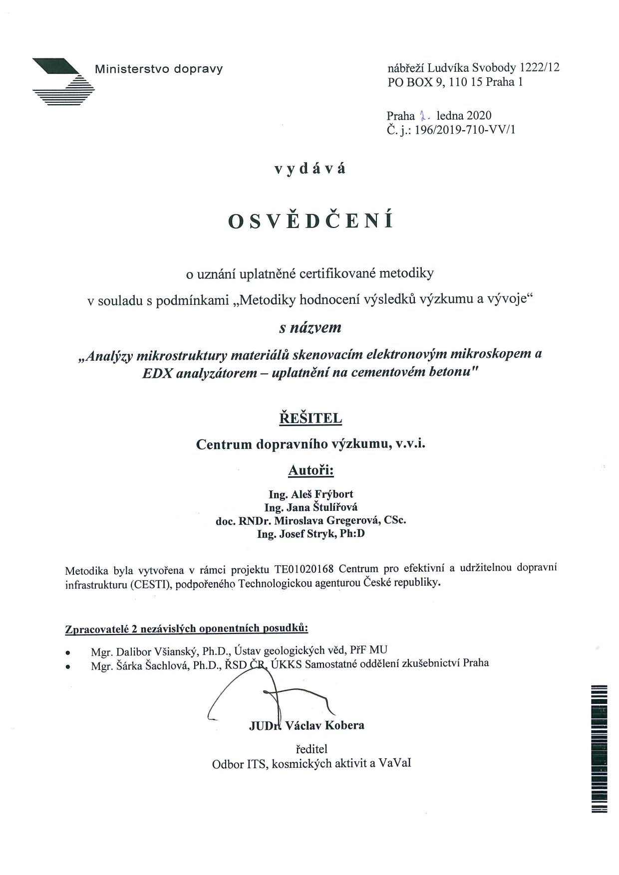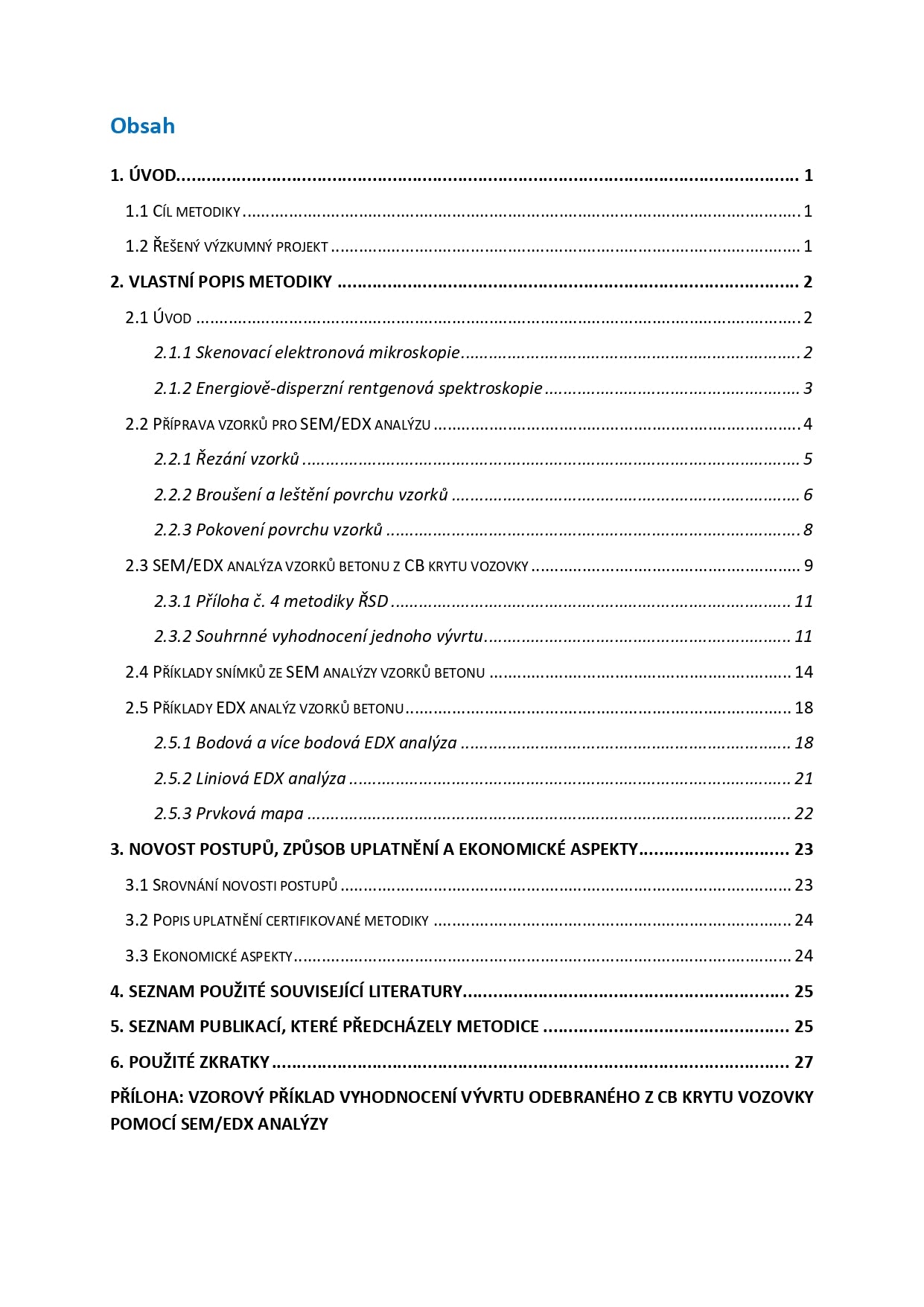 • stanovit konkrétní postup SEM/EDX analýz na vzorcích cementového betonu odebraného z dopravních staveb, zejména krytu vozovek,