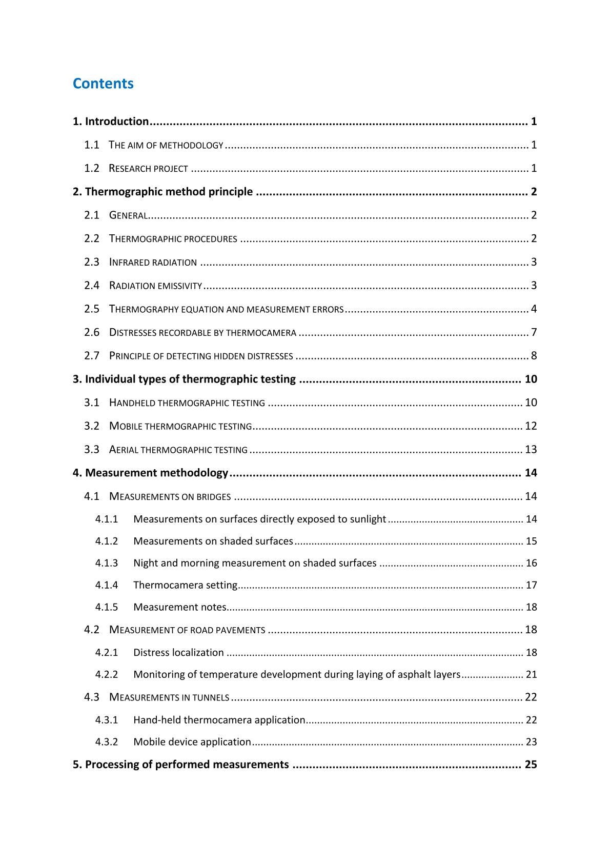The purpose of the methodology is to offer an effective tool that allows for fast assessment of transport infrastructure structure conditions and helps to identify spots where the visual inspection or detailed diagnostics needs to be focused on. The measurement is contactless and can be performed without road traffic exclusion. The methodology describes potential uses of infrared thermography, particularly during bridge, pavement, and tunnel condition diagnostics.