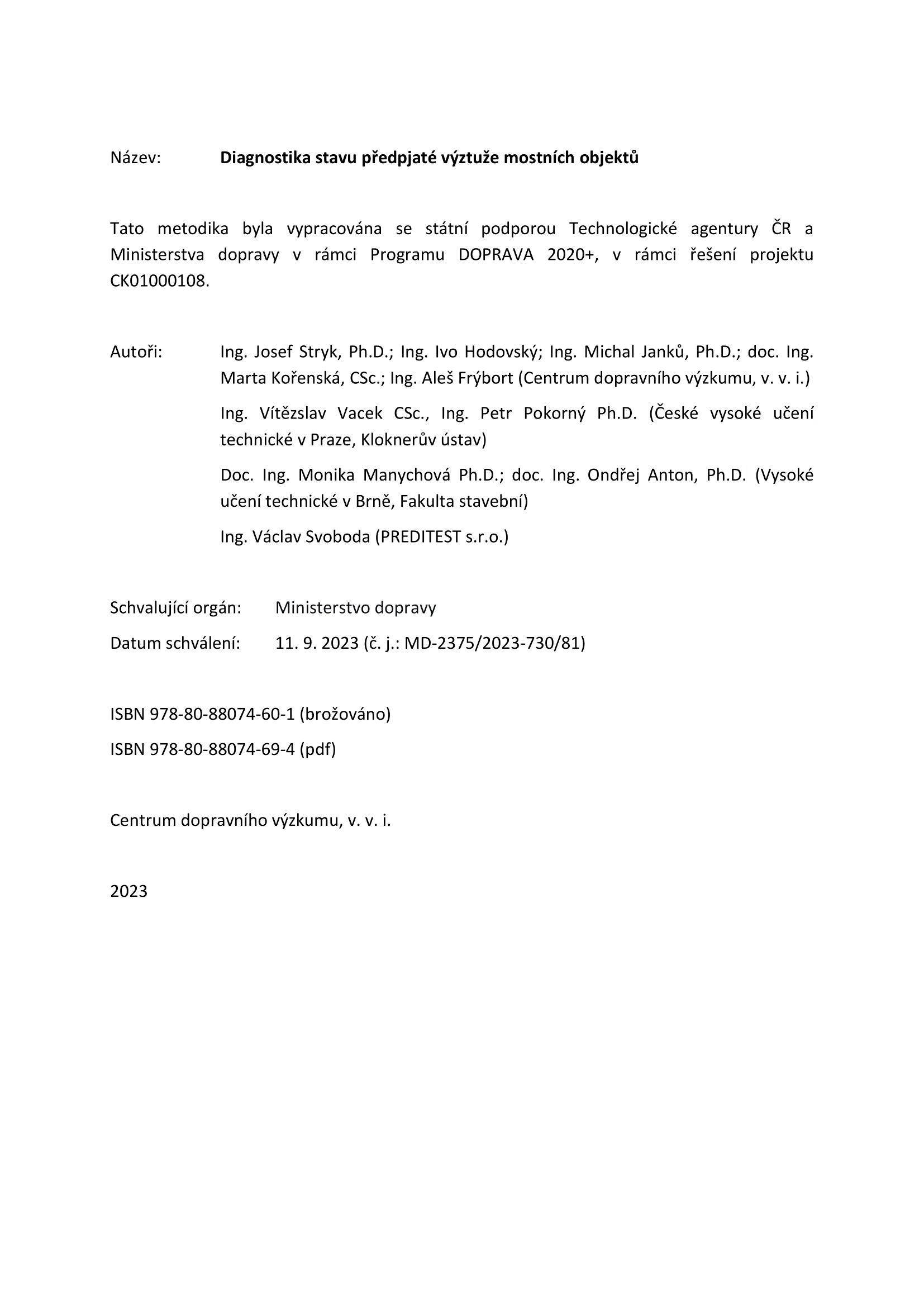 Tato metodika byla spolufinancován se státní podporou Technologické agentury ČR a Ministerstva dopravy v rámci programu Doprava 2020+, v rámci řešení projektu CK01000108 Nové přístupy při diagnostice stavu výztuže předpjatých mostních nosníků.