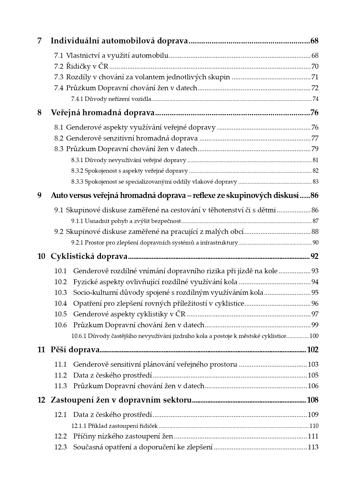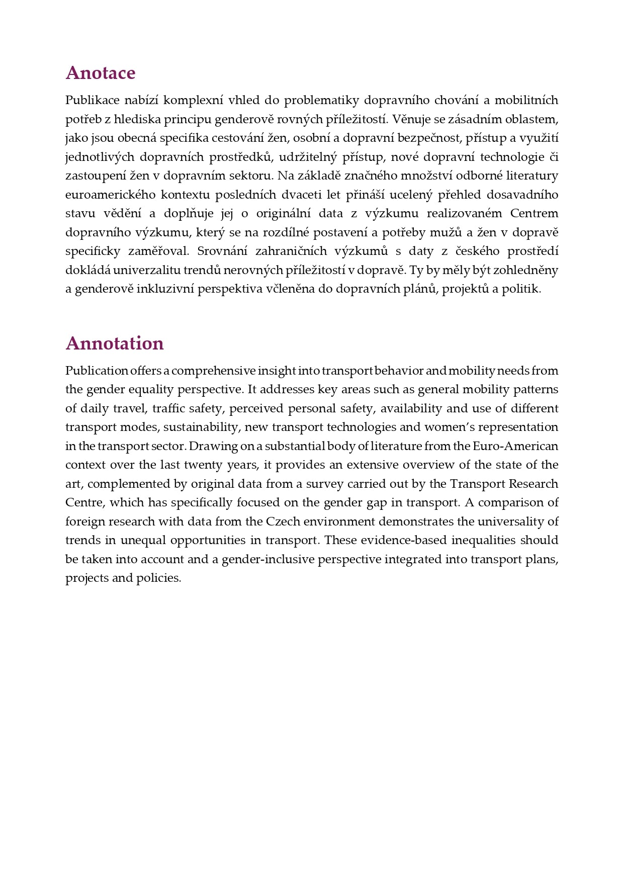 Publikace se zabývá genderově specifickými rozdíly v dopravním chování a mobilitních potřebách. Kniha zdůrazňuje důležitost genderové rovnosti při plánování a tvorbě dopravních politik. Pokrývá klíčové oblasti jako vzorce cestování, bezpečnost, přístup a využití dopravních prostředků, udržitelné přístupy a zastoupení žen v dopravním sektoru.