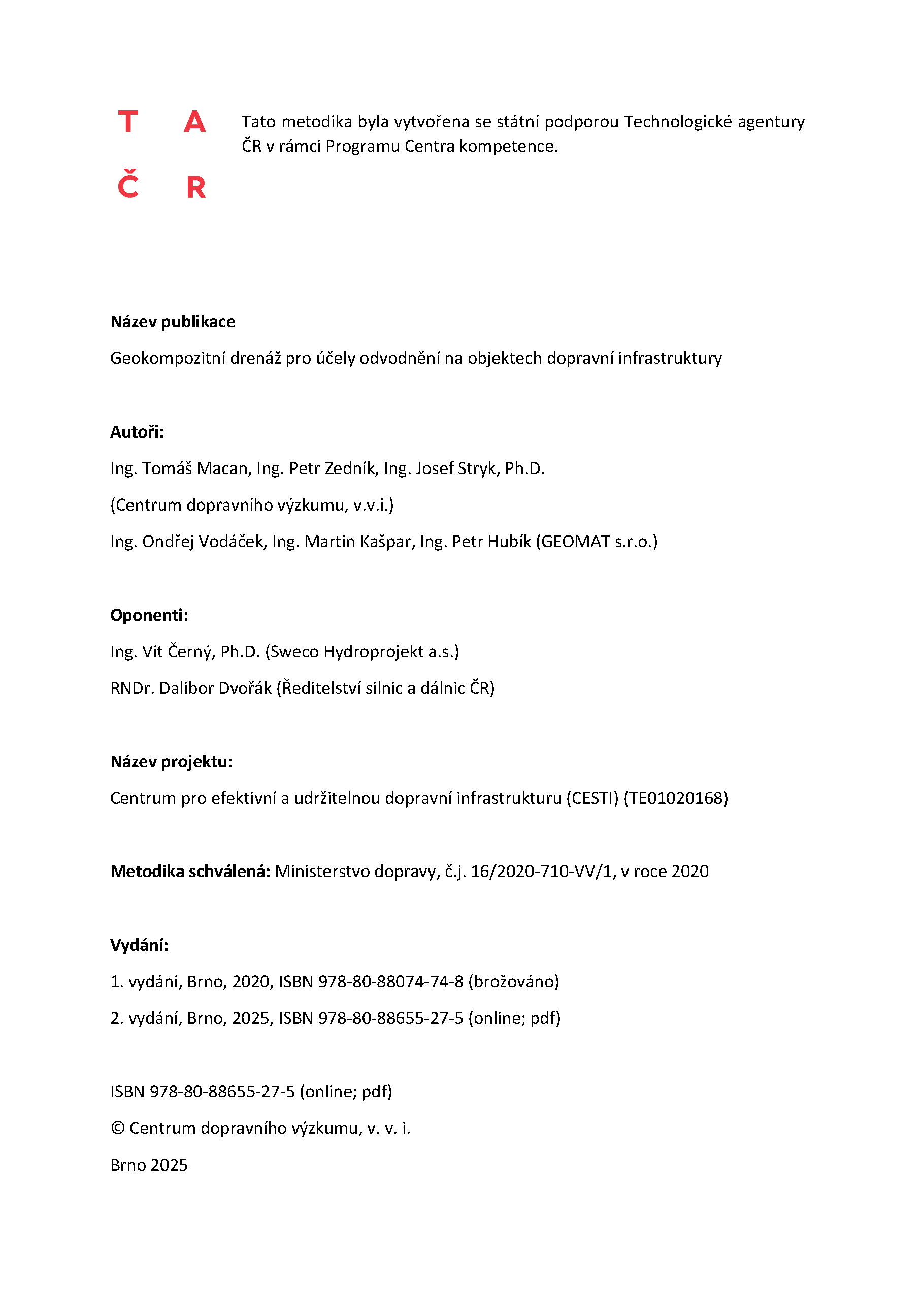 Tato metodika byla vypracována se státní podporou Technologické agentury ČR v rámci programu Centra kompetence, projektu CESTI (TE01020168: Centrum pro efektivní a udržitelnou dopravní infrastrukturu, pracovní skupiny WP1: Pozemní komunikace – inteligentní a trvanlivá technologická řešení s vysokou technickou účinností).