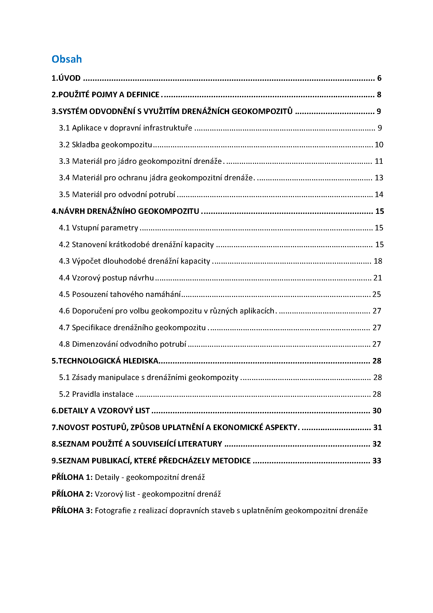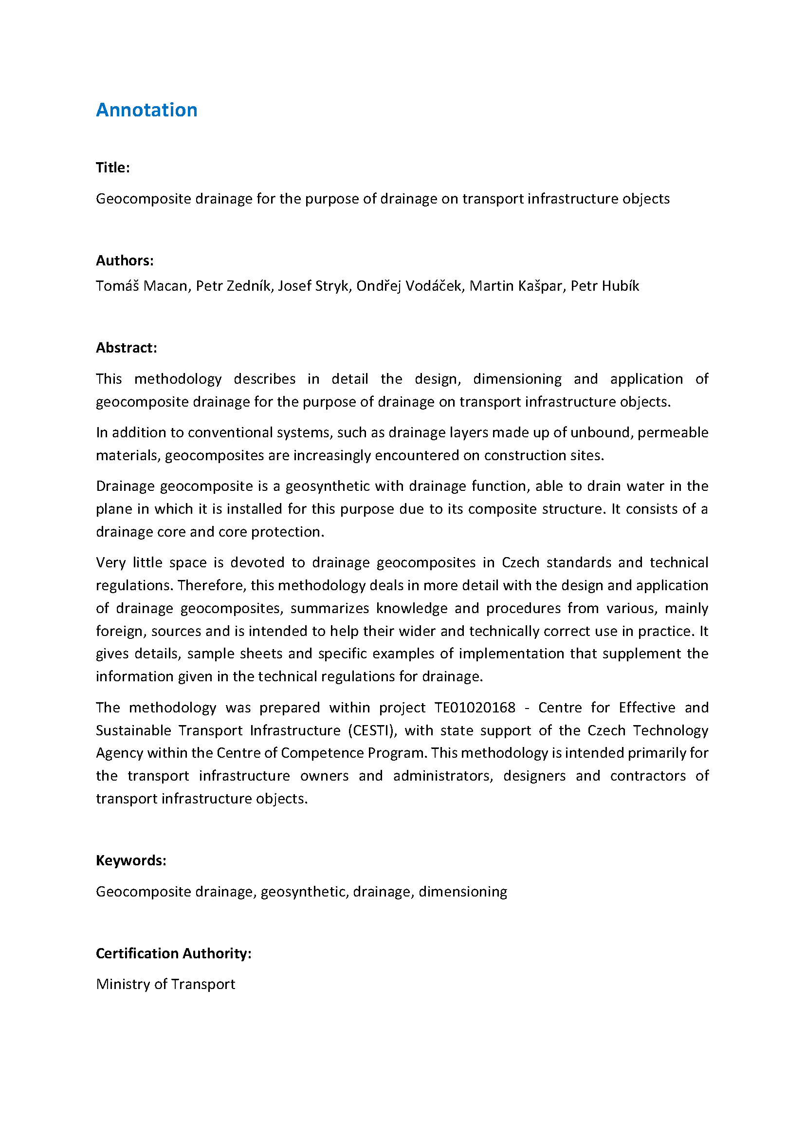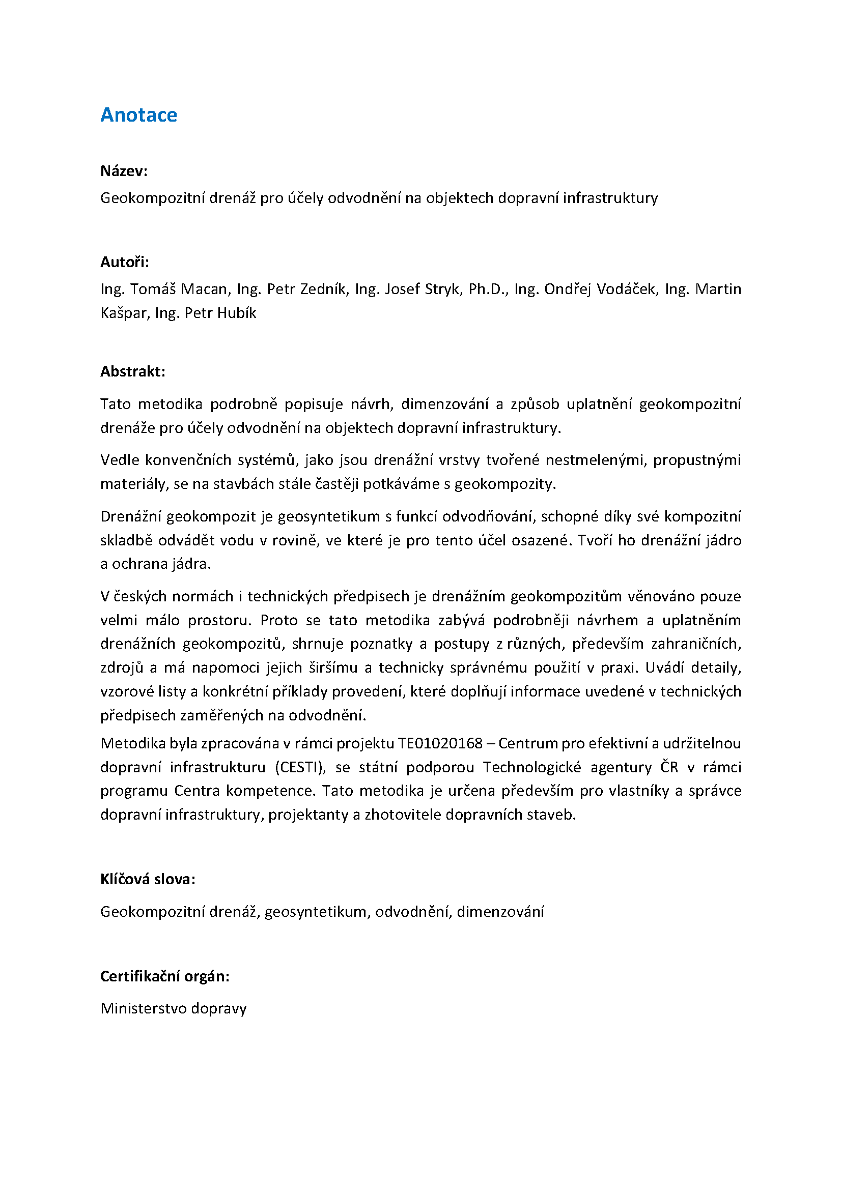 Vedle konvenčních systémů, jako jsou drenážní vrstvy tvořené nestmelenými, propustnými materiály, se na stavbách stále častěji potkáváme s geokompozity. Tato metodika podrobně popisuje návrh, dimenzování a způsob uplatnění geokompozitní drenáže pro účely odvodnění na objektech dopravní infrastruktury.