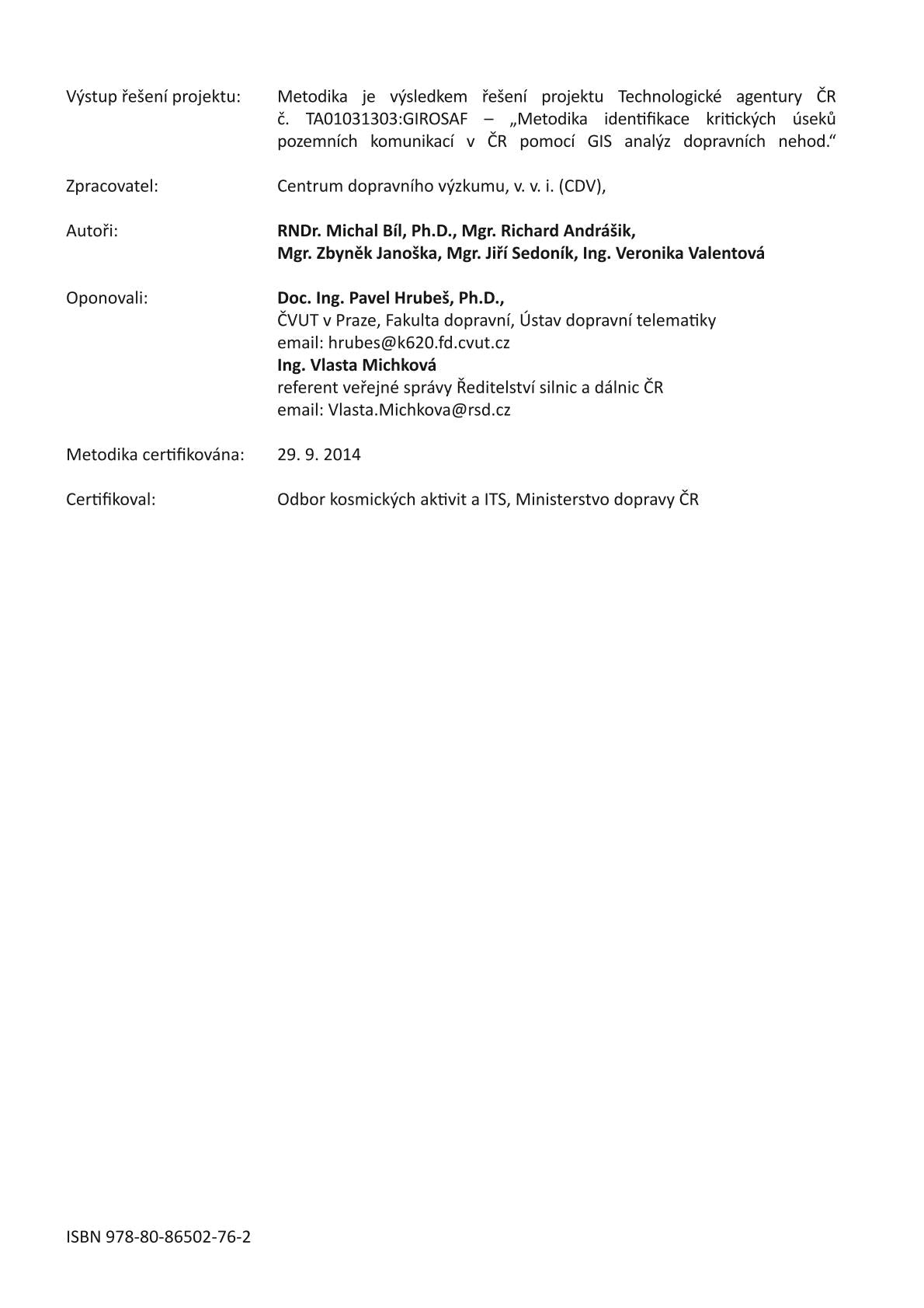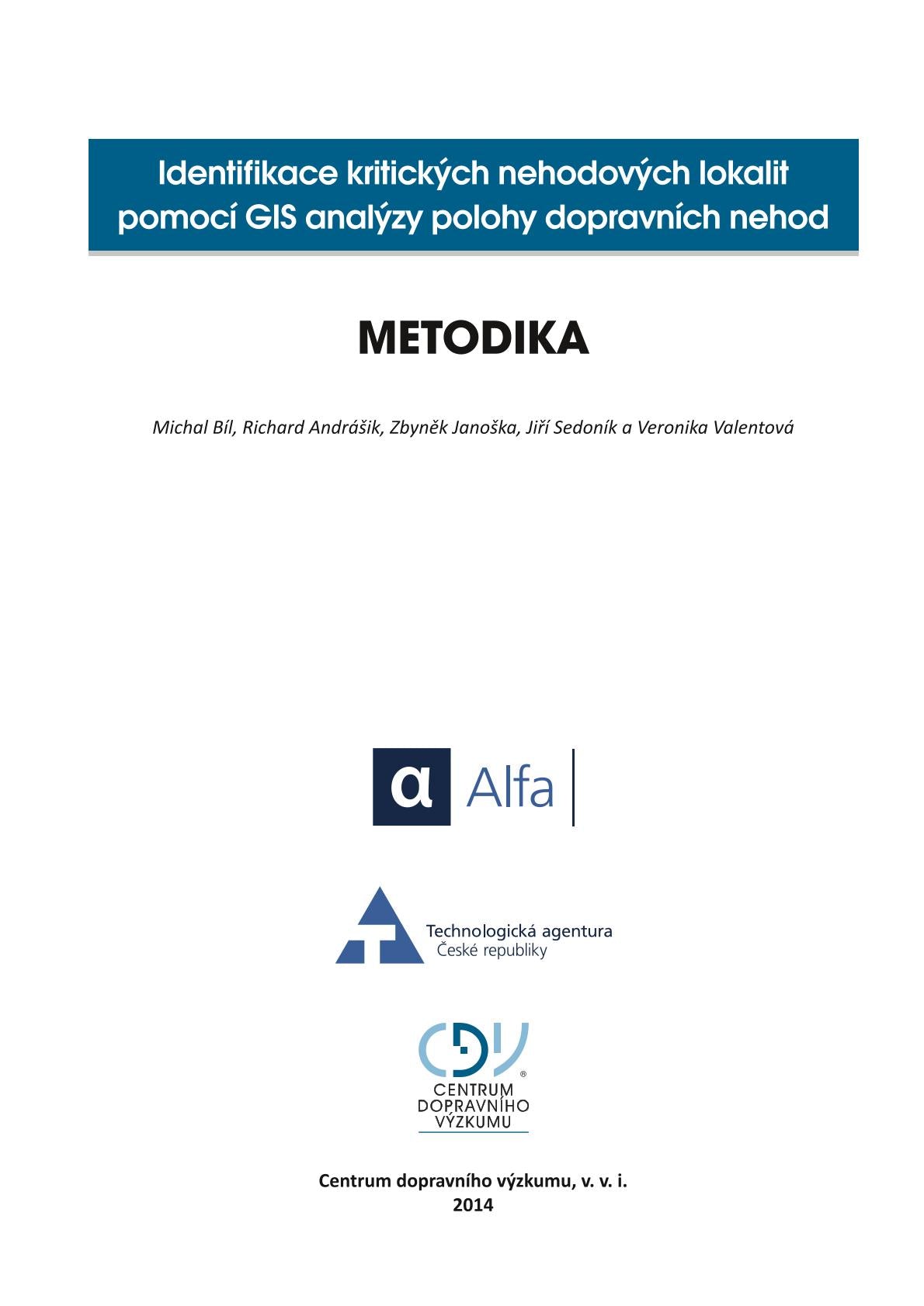 Tato metodika byla vytvořena se státní podporou Technologické agentury ČR v rámci Programu ALFA, v rámci řešení projektu TA01031581 Metodika identifikace kritických úseků pozemních komunikací v ČR pomocí GIS analýz dopravních nehod.
