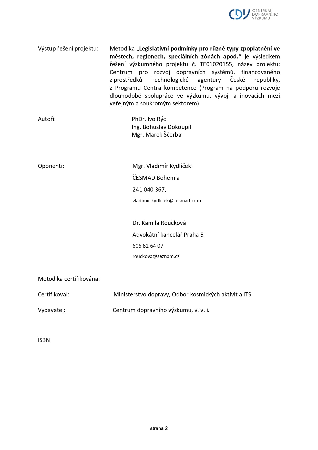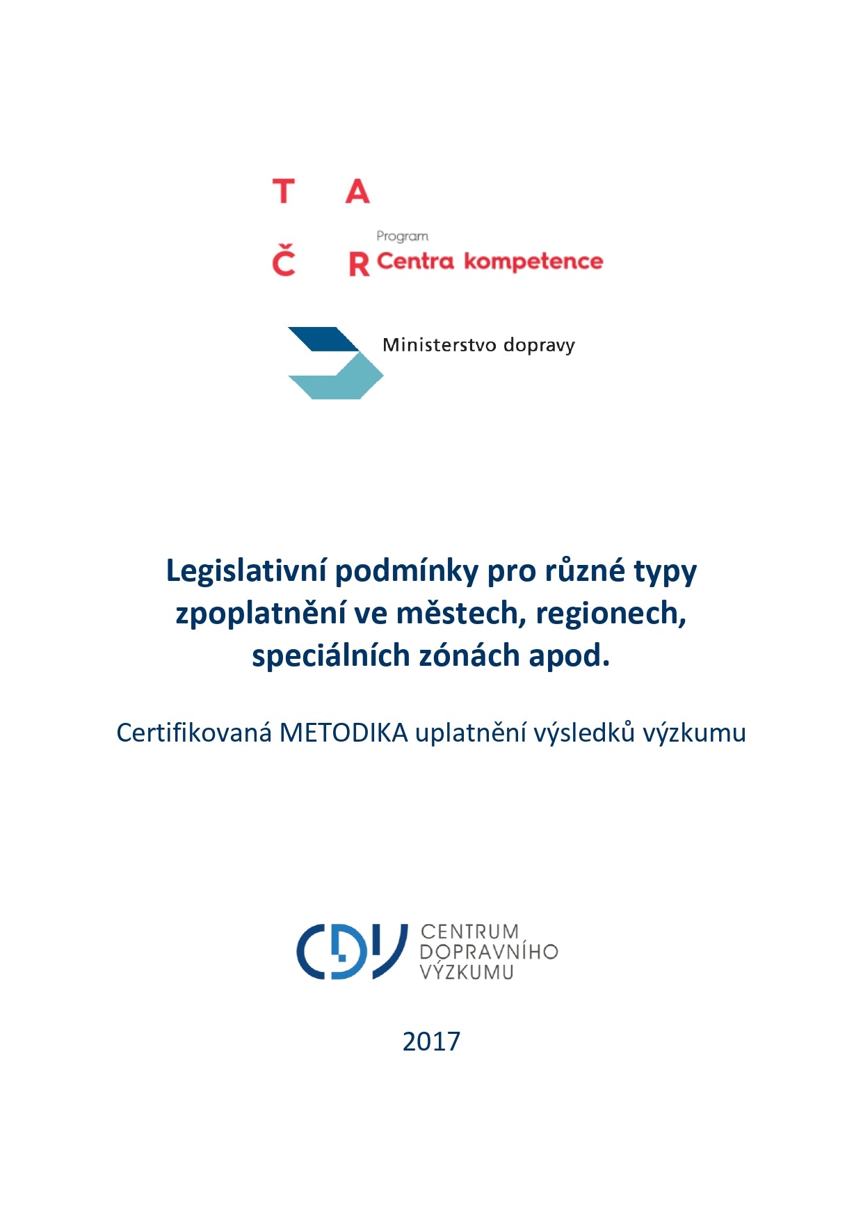 V rámci projektu TE01020155 Centrum pro rozvoj dopravních systémů (RODOS) financovaný Technologickou agenturou České republiky byl v rámci pracovního balíčku PB5 Nové modely financování dopravní infrastruktury“ naplánován výsledek (druh N - certifikované metodiky a postupy včetně specializovaných map) č. TE01020155-2016V001 s názvem „Legislativní podmínky pro různé typy zpoplatnění ve městech, regionech, speciálních zónách apod.“