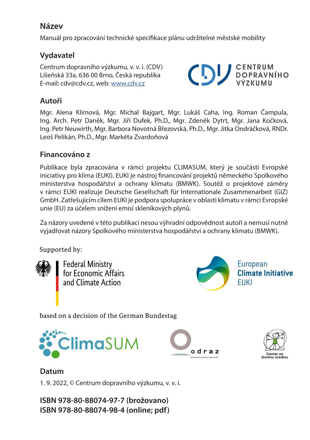 Manuál ke zpracování technické specifikace plánu udržitelné městské mobility by měl sloužit ke zvýšení a sjednocení kvality plánování v České (a připadně Slovenské) republice. Je určen pro města, která si chtějí nechat zpracovat či aktualizovat plán udržitelné městské mobility, i pro zpracovatele a další odborníky v oblasti městské dopravy a mobility, kteří se podílejí na zpracování a implementaci plánu.