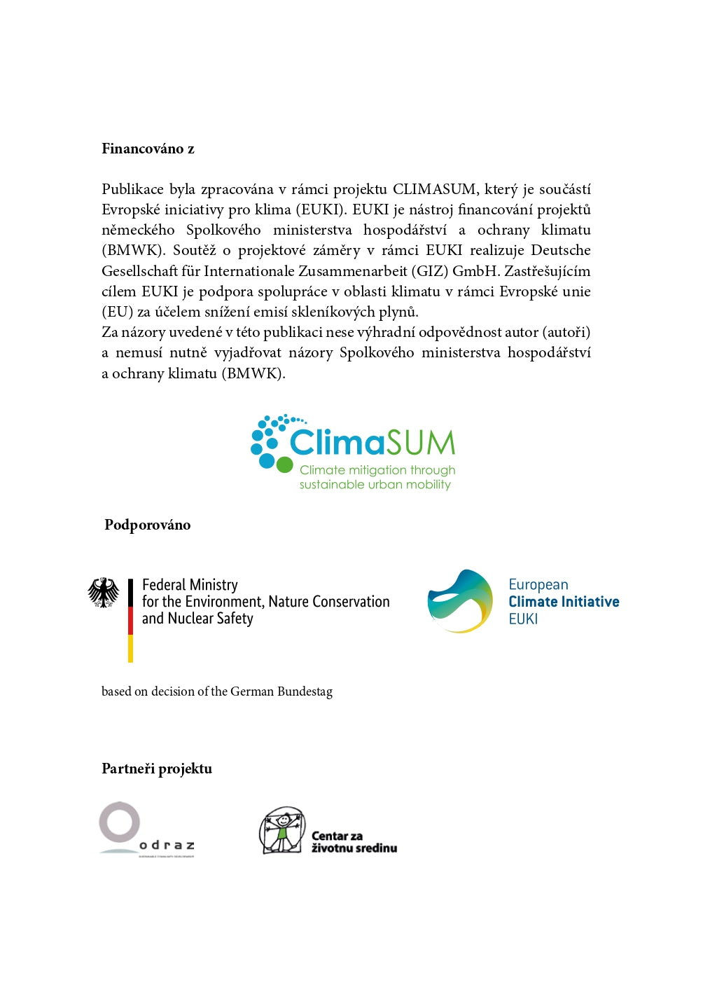 Tato publikace byla zpracována v rámci projektu CLIMASUM, který je součástí Evropské iniciativy pro klima (EUKI), EUKI je nástroj financování projektů něměckého Spolkového ministersva hospodářství a ochrany klimatu (BMWK). Soutěž o projektové záměry v rámci EUKI realizuje Deutsche Geselleschaft fur Internationale Zusammenarbeit (GIZ) GmbH.