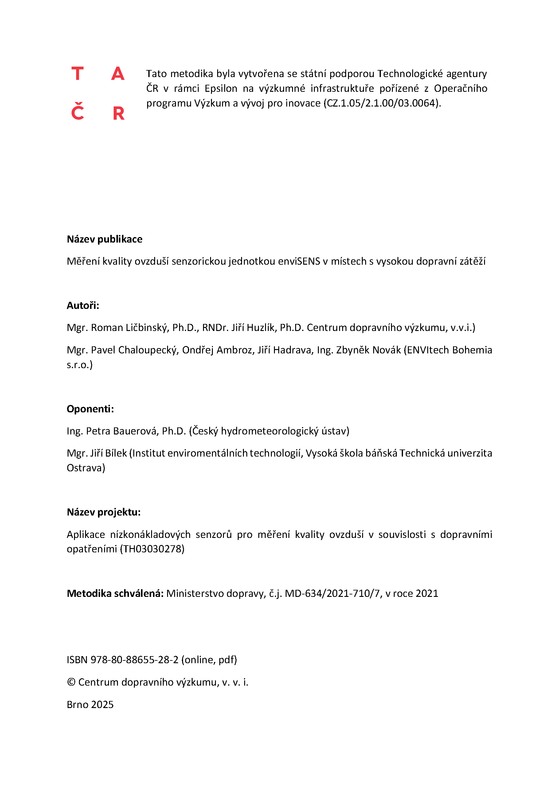 Tato metodika byla spolufinancován se státní podporou Technologické agentury ČR v rámci programu Epsilon v rámci řešení projektu TH03030278 Aplikace nízkonákladových senzorů pro měření kvality ovzduší v souvislosti s dopravními opatřeními.