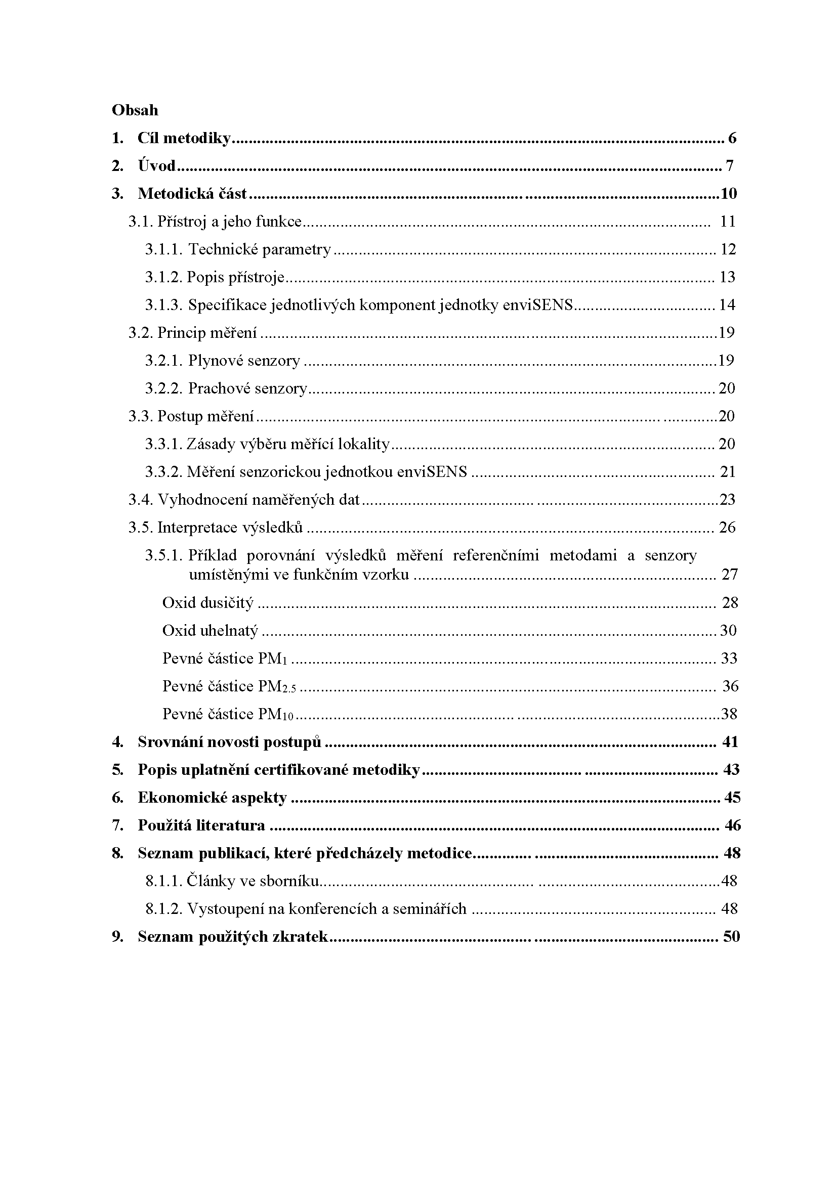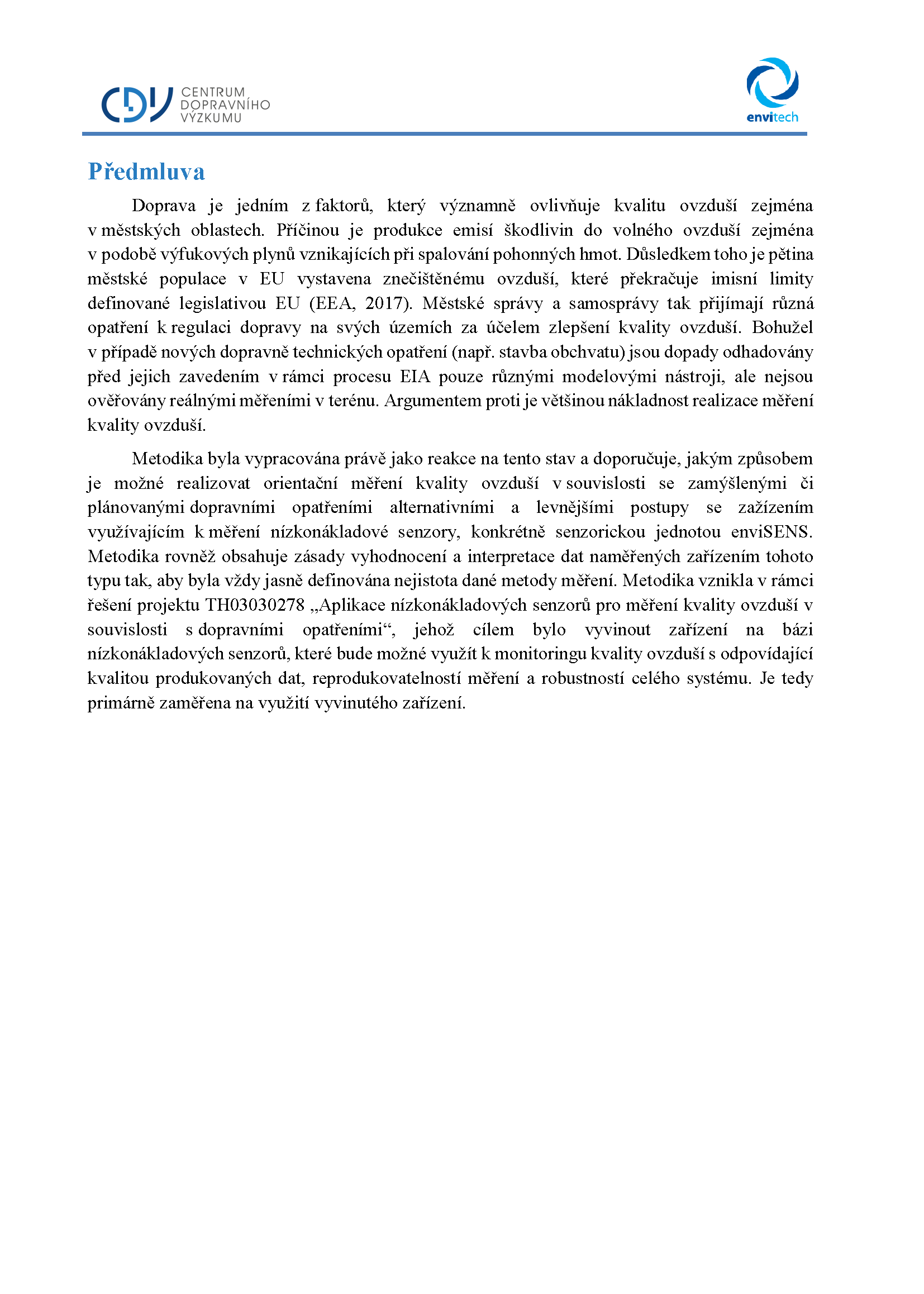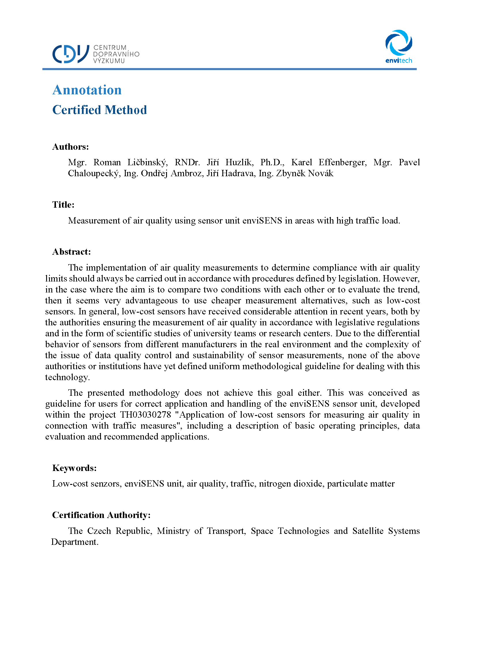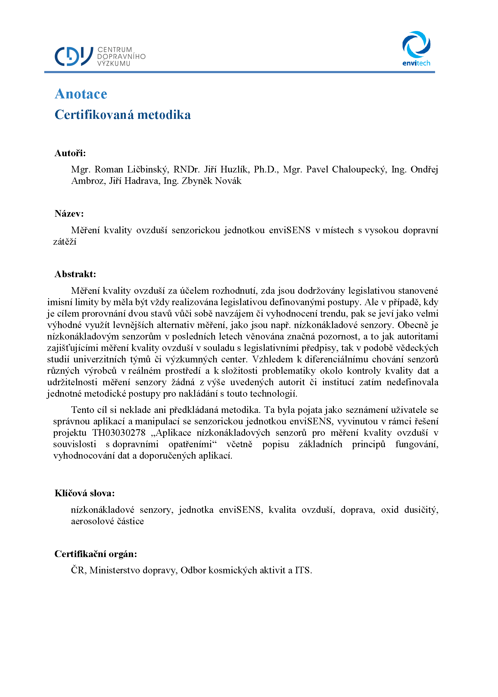 Metodika byla pojata jako seznámení uživatele se správnou aplikací a manipulací se senzorickou jednotkou enviSENS, vyvinutou v rámci řešení projektu TH03030278 „Aplikace nízkonákladových senzorů pro měření kvality ovzduší v souvislosti s dopravními opatřeními“ včetně popisu základních principů fungování, vyhodnocování dat a doporučených aplikací.