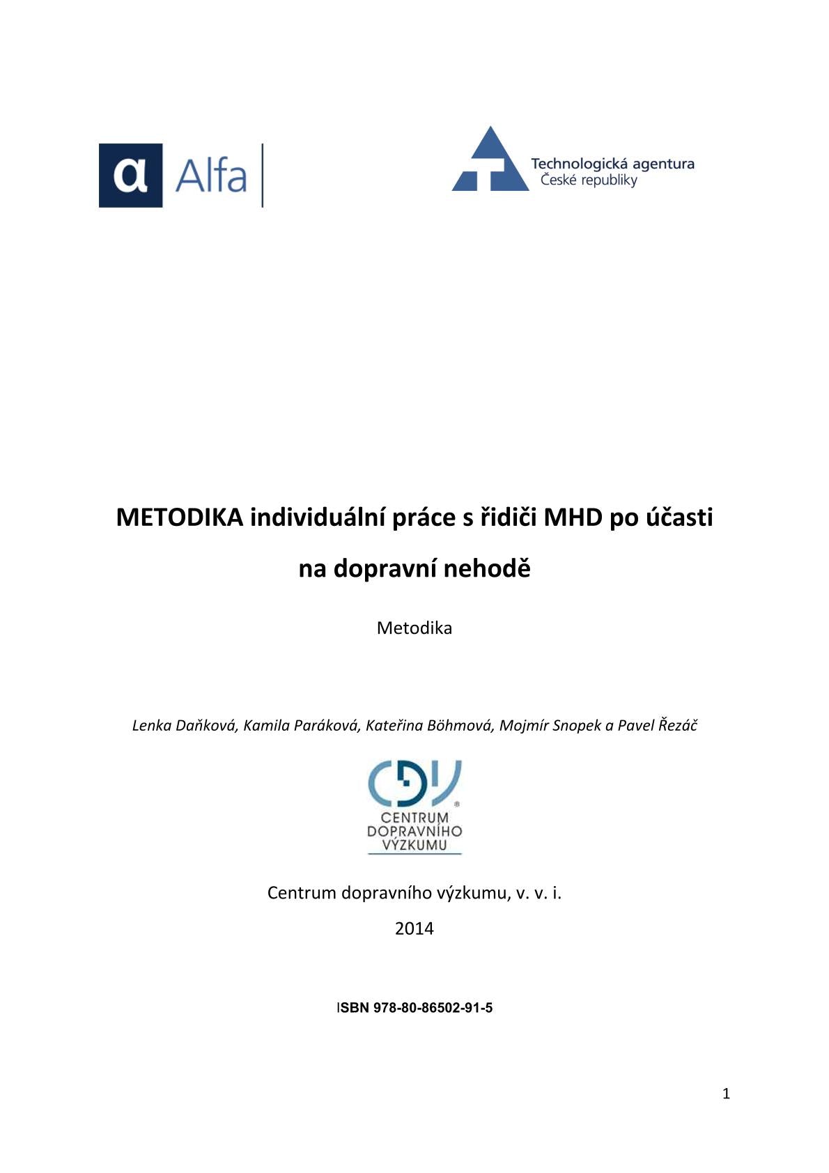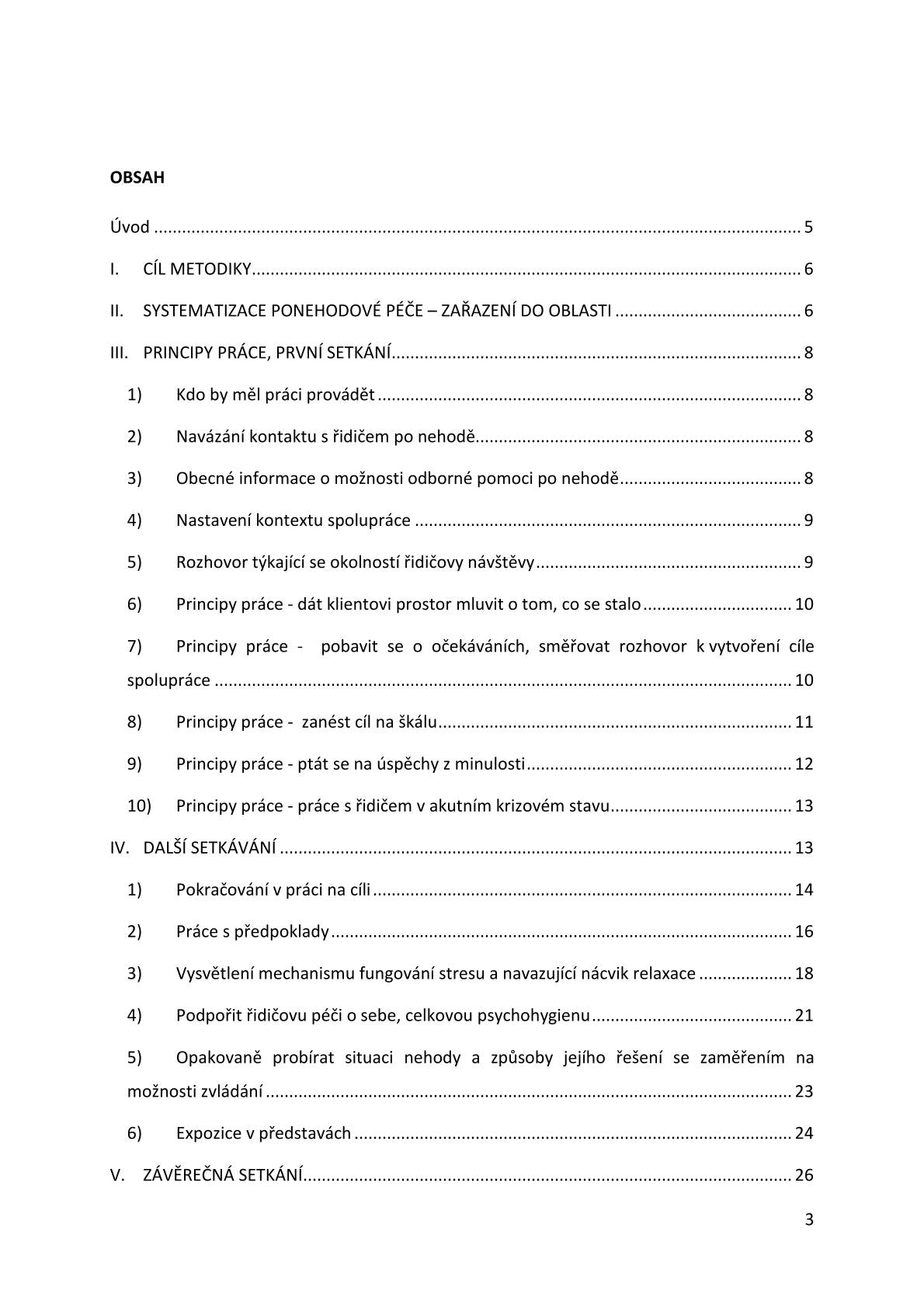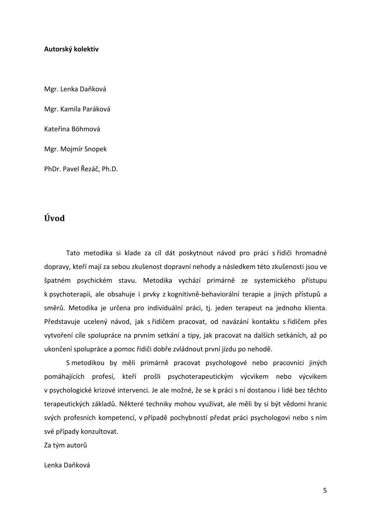 Tato metodika si klade za cíl dát poskytnout návod pro práci s řidiči hromadné dopravy, kteří mají za sebou zkušenost dopravní nehody a následkem této zkušenosti jsou ve špatném psychickém stavu. Metodika vychází primárně ze systemického přístupu k psychoterapii, ale obsahuje i prvky z kognitivně-behaviorální terapie a jiných přístupů a směrů. Metodika je určena pro individuální práci, tj. jeden terapeut na jednoho klienta.