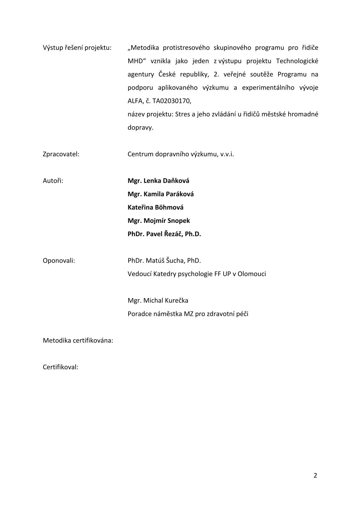 Tato metodika byla vytvořena se státní podporou Technologické agentury ČR v rámci Programu ALFA, v rámci řešení projektu TA02030170 Stres a jeho zvládání u řidičů městské hromadné dopravy.