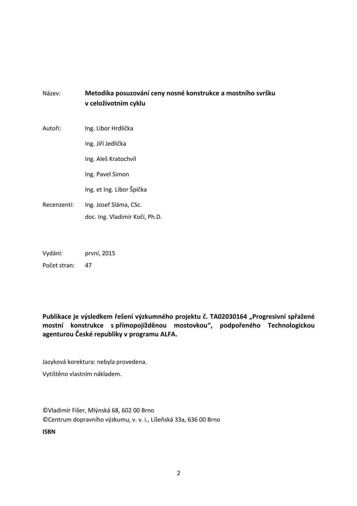 Tato metodika byla vytvořena se státní podporou Technologické agentury ČR v rámci Programu ALFA, v rámci řešení projektu TA02030164 Progresivní spřažené mostní konstrukce s přímopojížděnou mostovkou.