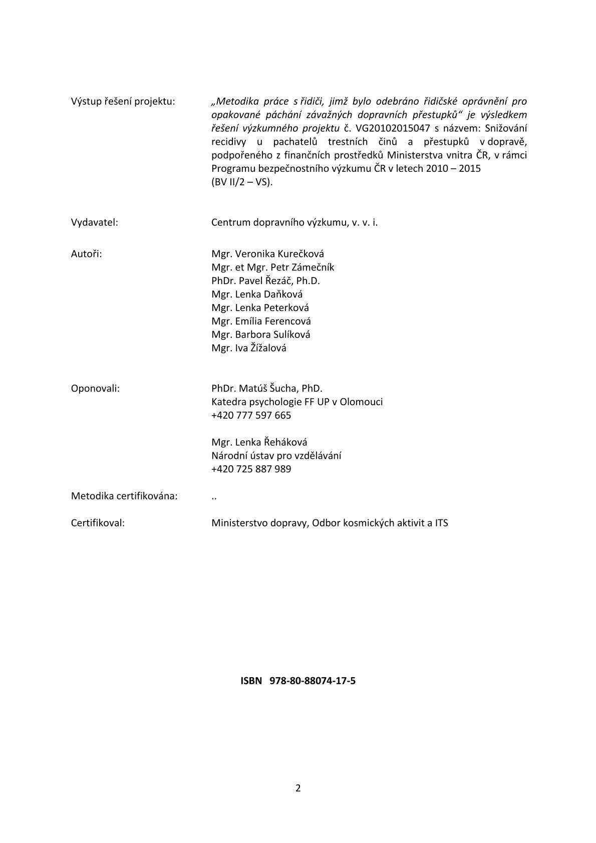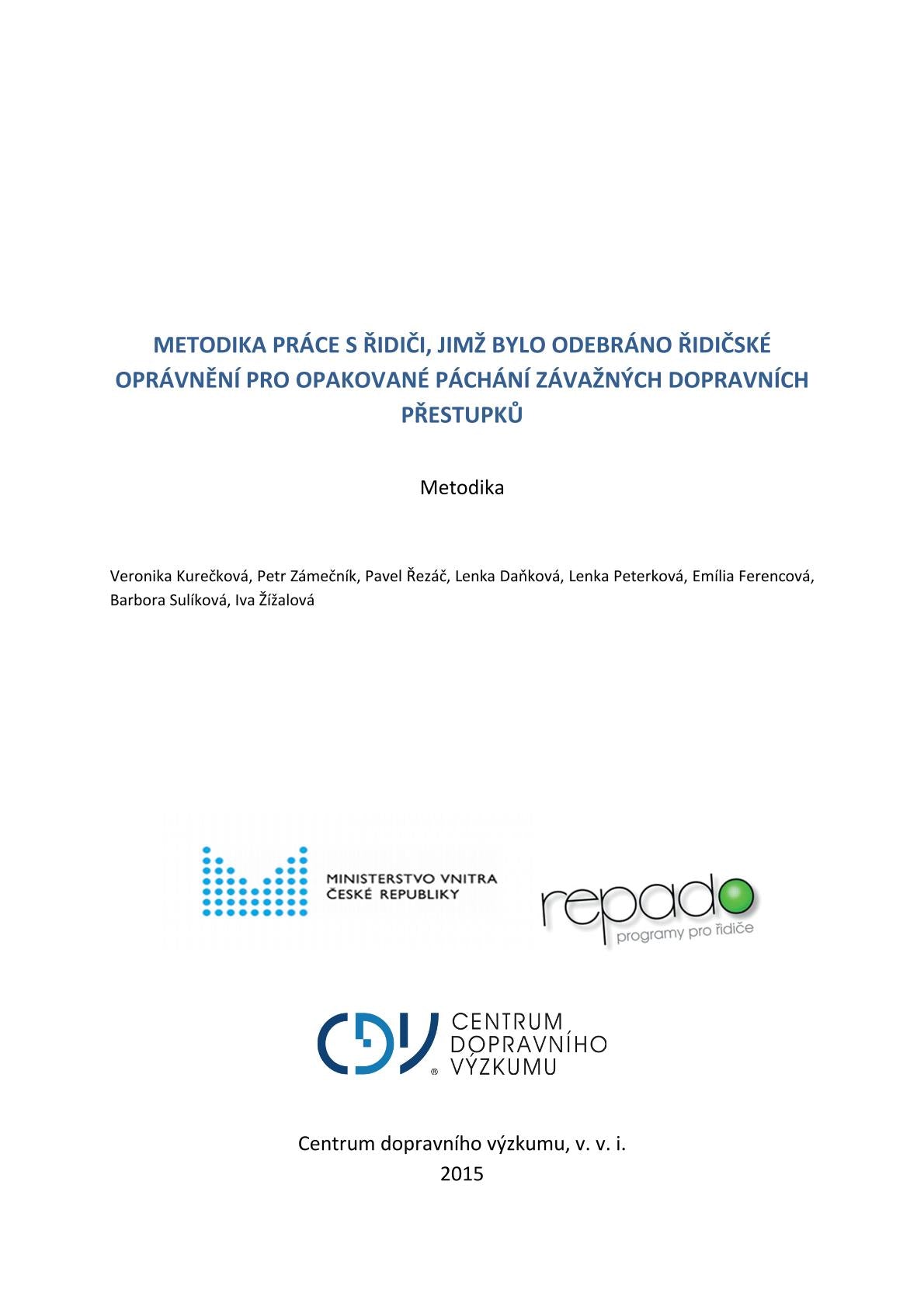 Tato metodika byla zpracována v rámci projektu Snižování recidivy u pachatelů trestních činů a přestupků v dopravě – REPADO (číslo výzkumného projektu VG20102015047), projekt programu bezpečnostního výzkumu ČR na léta 2010–2015 Ministerstva vnitra.