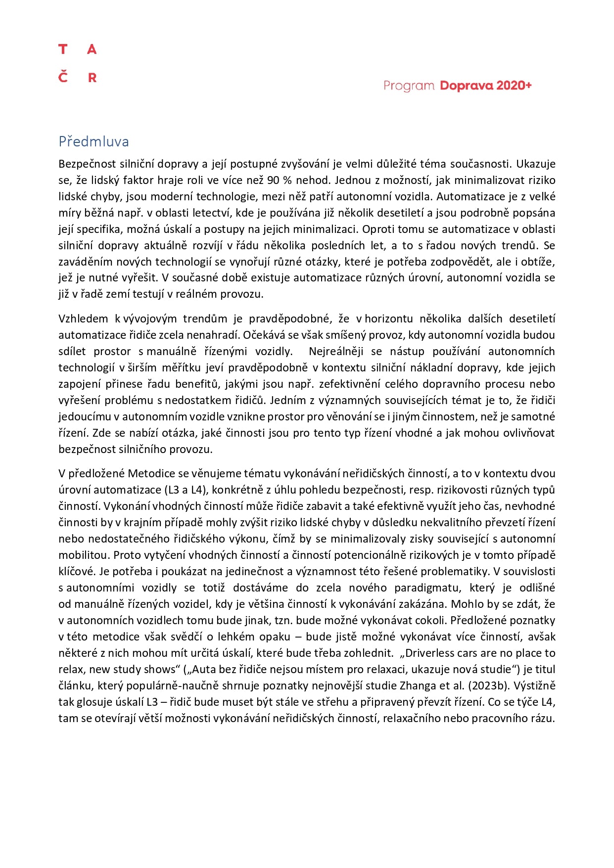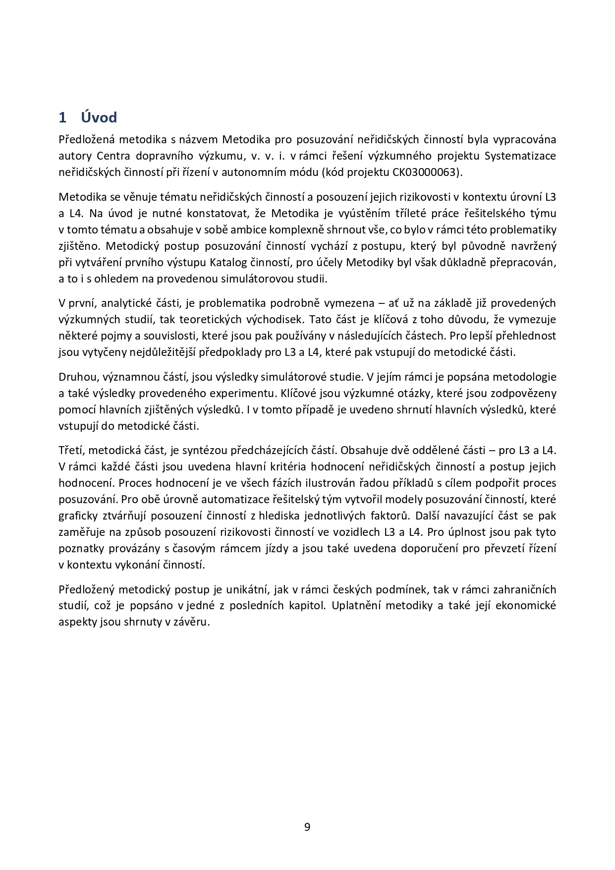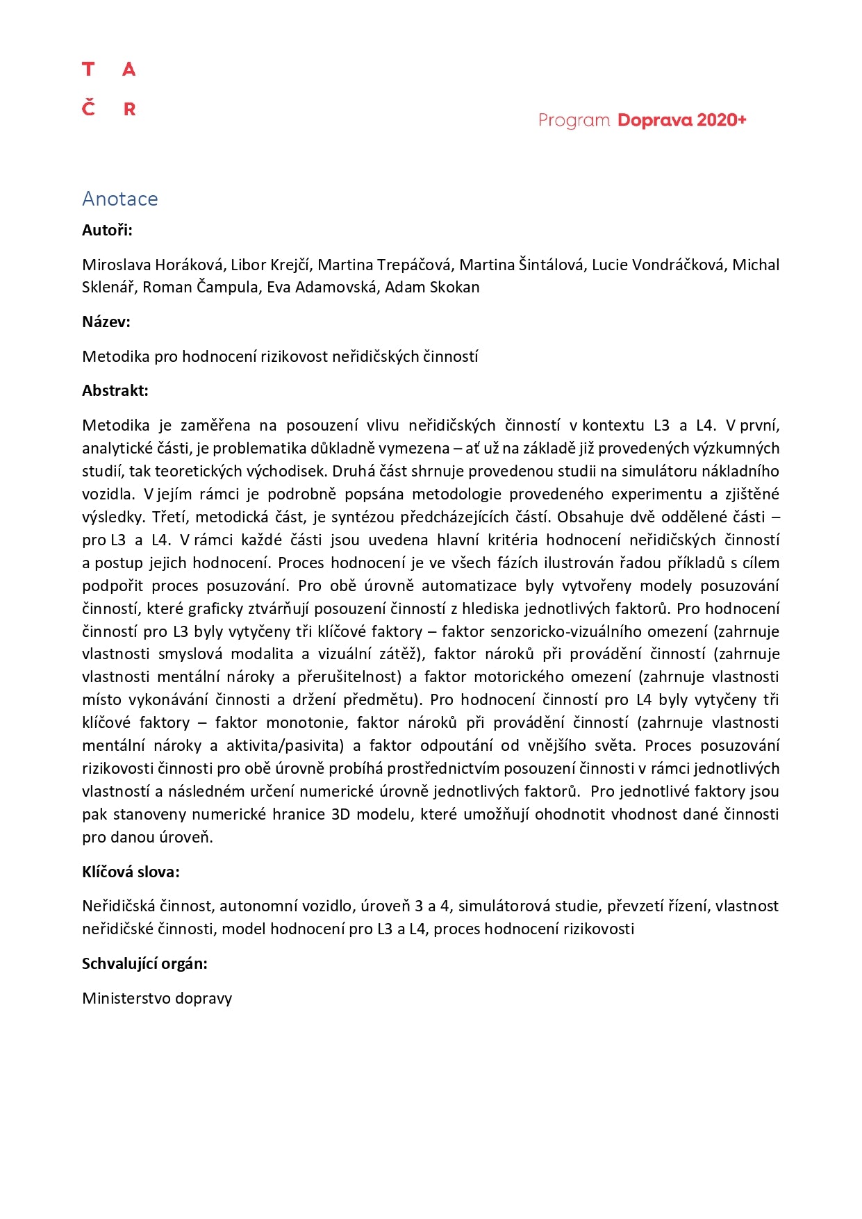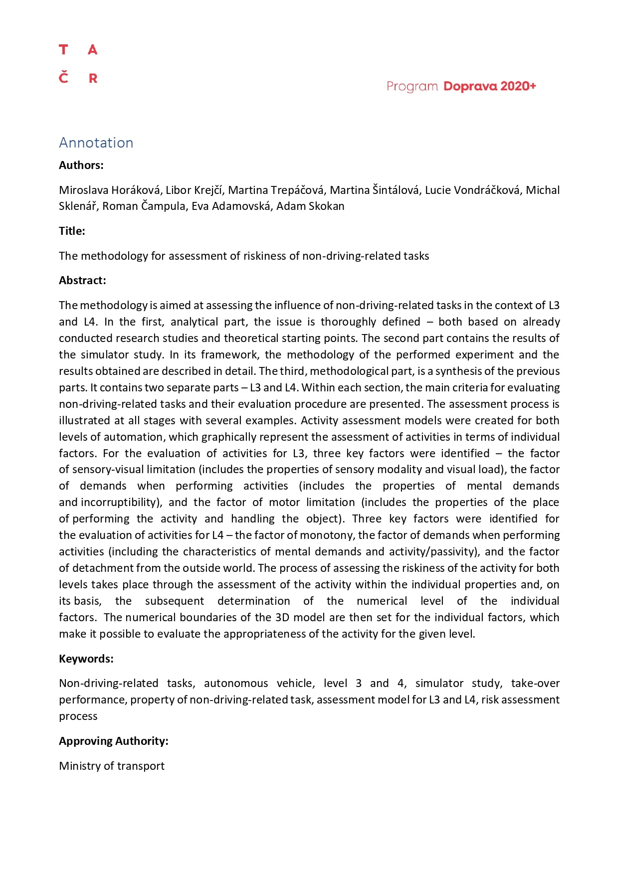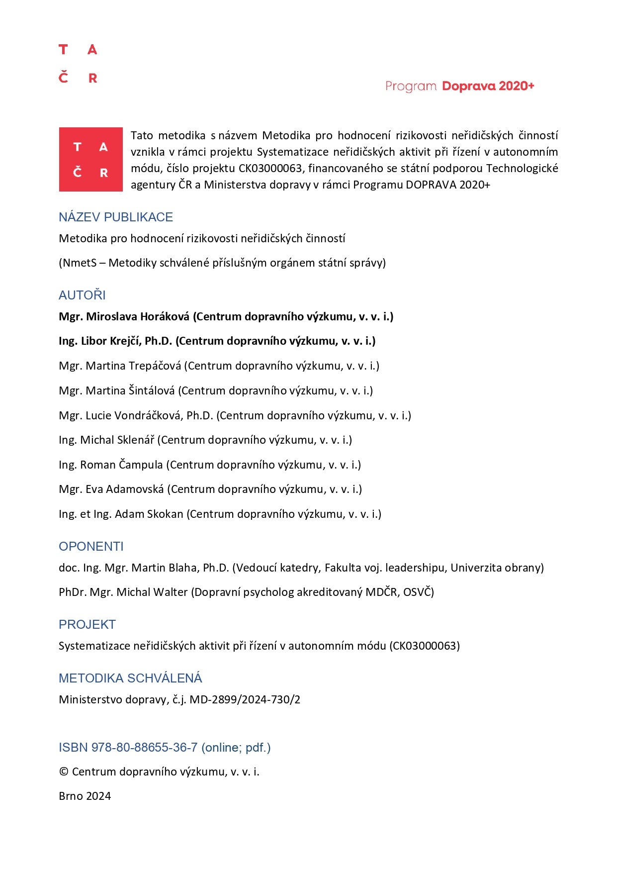 Tato metodika s názvem Metodika pro hodnocení rizikovosti neřidičských činností vznikla v rámci projektu Systematizace neřidičských aktivit při řízení v autonomním módu, číslo projektu CK03000063, financovaného se státní podporou Technologické agentury ČR a Ministerstva dopravy v rámci Programu DOPRAVA 2020+
