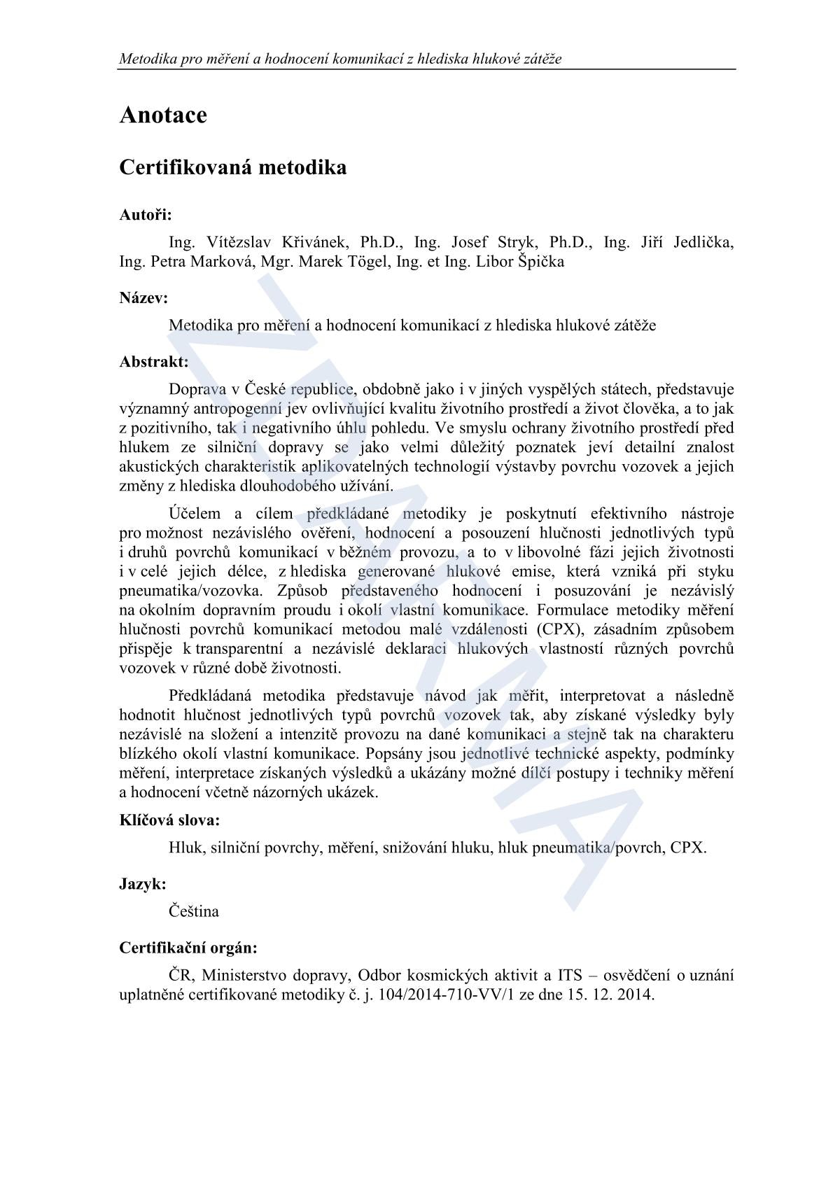 Tato metodika byla vytvořena se státní podporou Technologické agentury ČR v rámci Programu ALFA. www.tacr.cz Metodika představuje návod jak měřit, interpretovat a následně hodnotit hlučnost jednotlivých typů povrchů vozovek tak, aby získané výsledky byly nezávislé na složení a intenzitě provozu na dané komunikaci a stejně tak na charakteru blízkého okolí vlastní komunikace. Popsány jsou jednotlivé technické aspekty, podmínky měření, interpretace získaných výsledků a ukázány možné dílčí postupy i techniky měření a hodnocení včetně názorných ukázek.