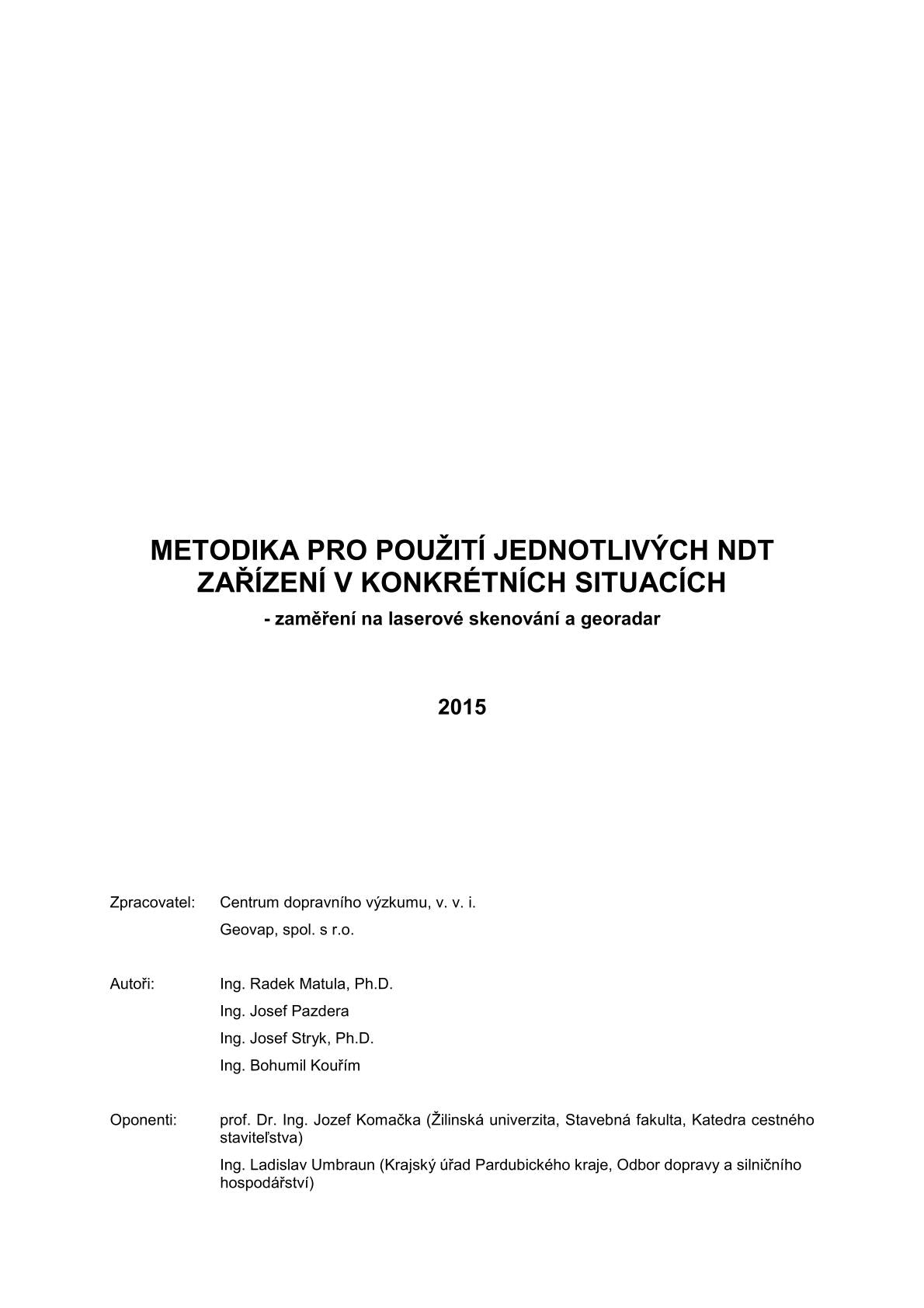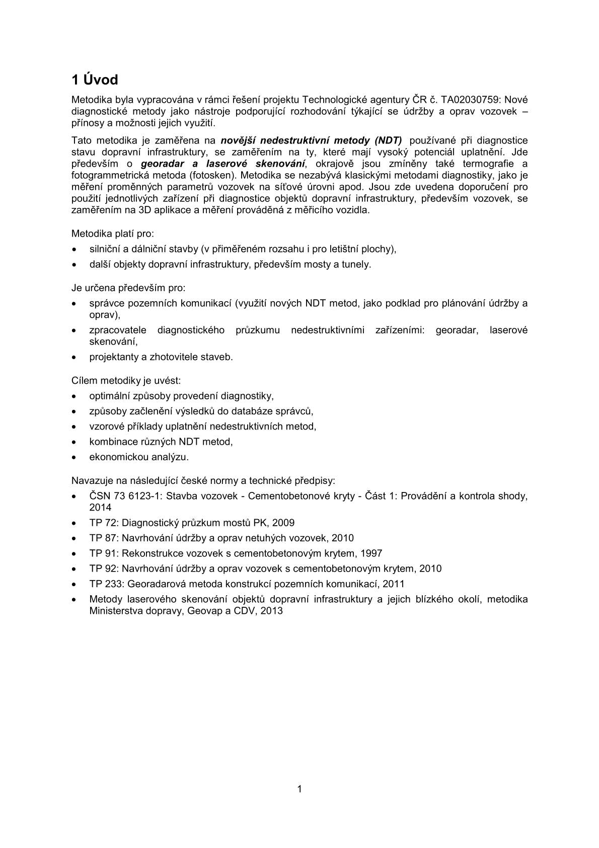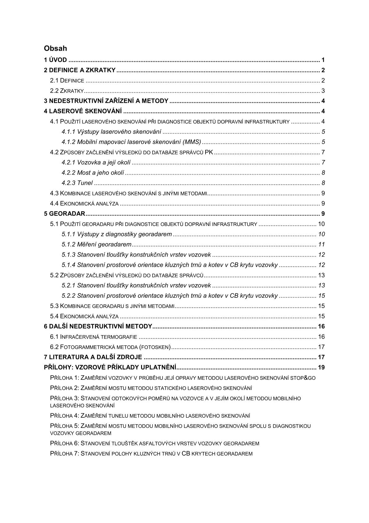 Tato metodika je zaměřena na novější nedestruktivní metody (NDT) používané při diagnostice stavu dopravní infrastruktury, se zaměřením na ty, které mají vysoký potenciál uplatnění. Jde především o georadar a laserové skenování, okrajově jsou zmíněny také termografie a fotogrammetrická metoda (fotosken). Metodika se nezabývá klasickými metodami diagnostiky, jako je měření proměnných parametrů vozovek na síťové úrovni apod. Jsou zde uvedena doporučení pro použití jednotlivých zařízení při diagnostice objektů dopravní infrastruktury, především vozovek, se zaměřením na 3D aplikace a měření prováděná z měřicího vozidla.