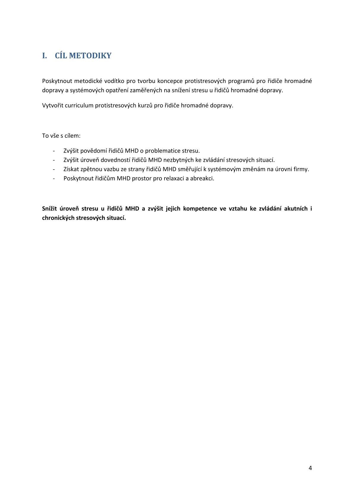 Cílem metodiky je poskytnout metodické vodítko pro tvorbu koncepce protistresových programů pro řidiče hromadné dopravy a systémových opatření zaměřených na snížení stresu u řidičů hromadné dopravy. Vytvořit curriculum protistresových kurzů pro řidiče hromadné dopravy.