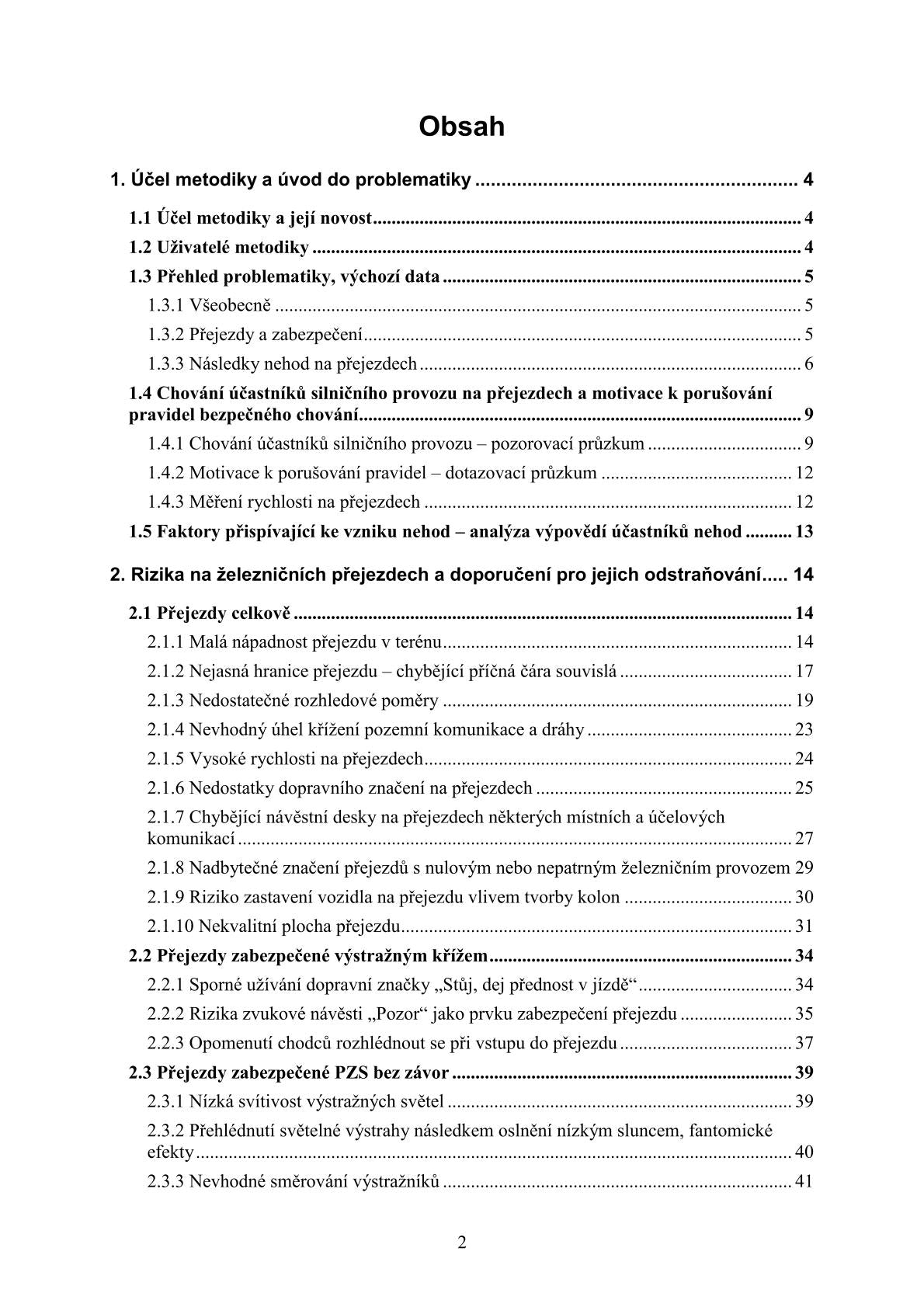 Účelem metodiky je shrnout a komentovat nejběžnější rizikové faktory, které vyplynuly z níže popsaných průzkumů chování uživatelů pozemních komunikací na železničních přejezdech a analýz nehod, a nabídnout opatření k eliminaci či zmírnění protiprávního chování. Přitom je snaha přednostně využívat opatření pro správce infrastruktury ekonomicky dostupná, která jsou hlavně otázkou potřebného know-how. Zejména jde o doplnění nových či dosud netradičních prvků vodorovného dopravního značení, jejichž možnosti byly dosud velmi podceněny a nabízejí se tak k využití velké rezervy ve prospěch bezpečnosti provozu.