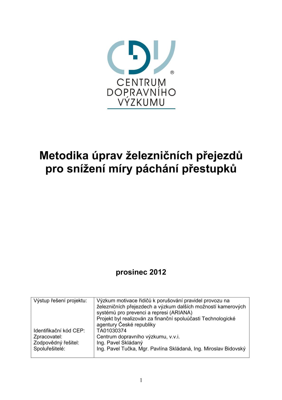 Tato metodika byla vytvořena se státní podporou Technologické agentury ČR v rámci Programu ALFA, v rámci řešení projektu TA01030374 Výzkum motivace řidičů k porušování pravidel provozu na železničních přejezdech a výzkum dalších možností kamerových systémů pro prevenci a represi.