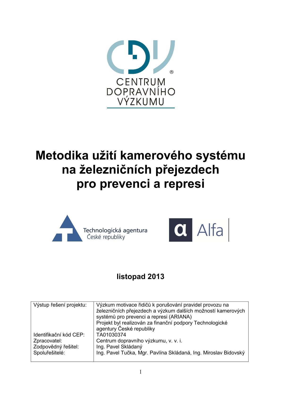 Tato metodika byla vytvořena se státní podporou Technologické agentury ČR v rámci Programu ALFA, v rámci řešení projektu TA01030374 Výzkum motivace řidičů k porušování pravidel provozu na železničních přejezdech a výzkum dalších možností kamerových systémů pro prevenci a represi.
