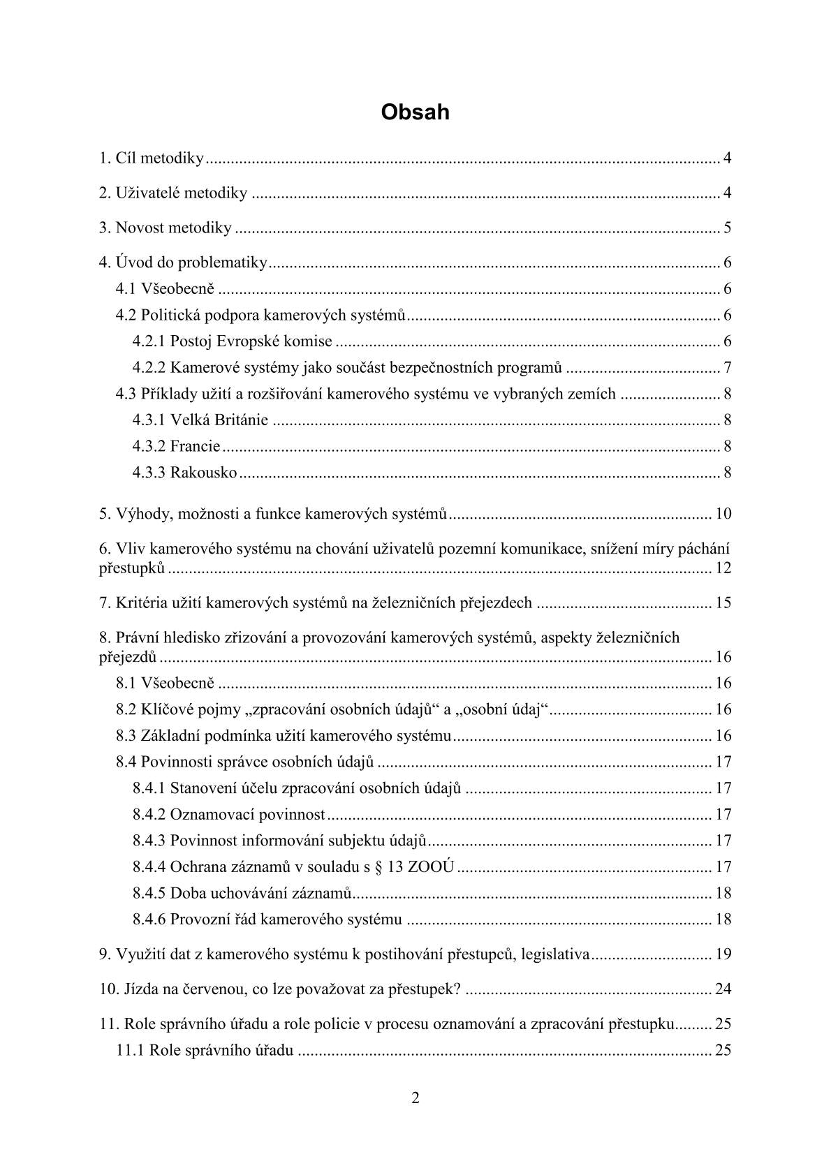 Metodika přináší shrnutí nejdůležitějších dostupných informací týkajících se zřizování, provozování a využívání kamerových systémů na železničních přejezdech, především za účelem identifikace a sankcionování pachatelů dopravních přestupků na přejezdech, ale i další funkce (dohled, informační materiál pro vyšetřování nehod, materiál pro řešení sporných případů, např. stížností na nefunkčnost zabezpečovacího zařízení, apod.). Na základě vlastních průzkumů, zkušeností i studia literatury lze přesvědčivě konstatovat, že kamerové systémy jsou účinným prostředkem, jak kladně ovlivnit chování účastníků provozu na pozemních komunikacích a zároveň poskytnout řadu doplňkových užitečných funkcí dalším stranám. Cílem této metodiky je podpořit jejich efektivní praktický rozvoj v zájmu zvýšení bezpečnosti provozu na železničních přejezdech a snížení rizika vzniku mimořádných událostí.