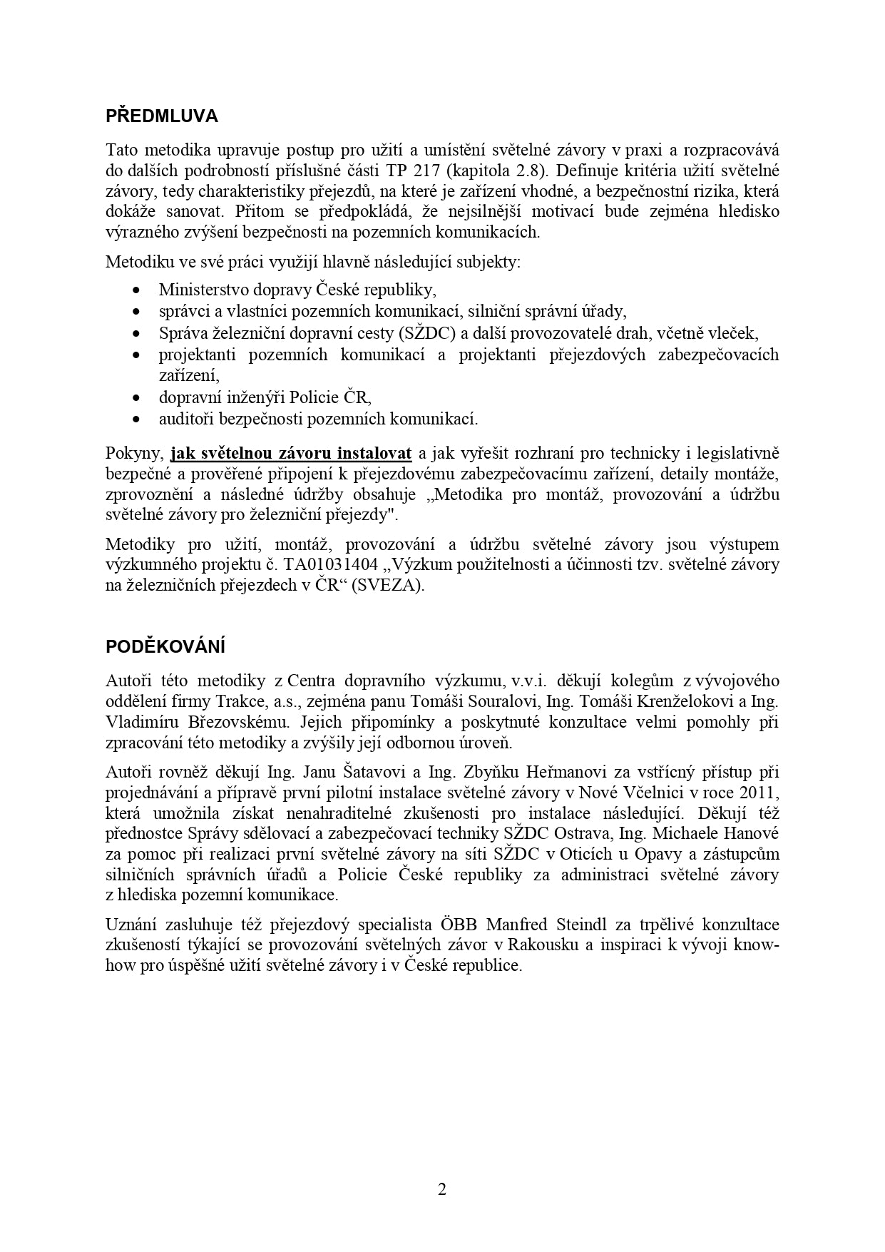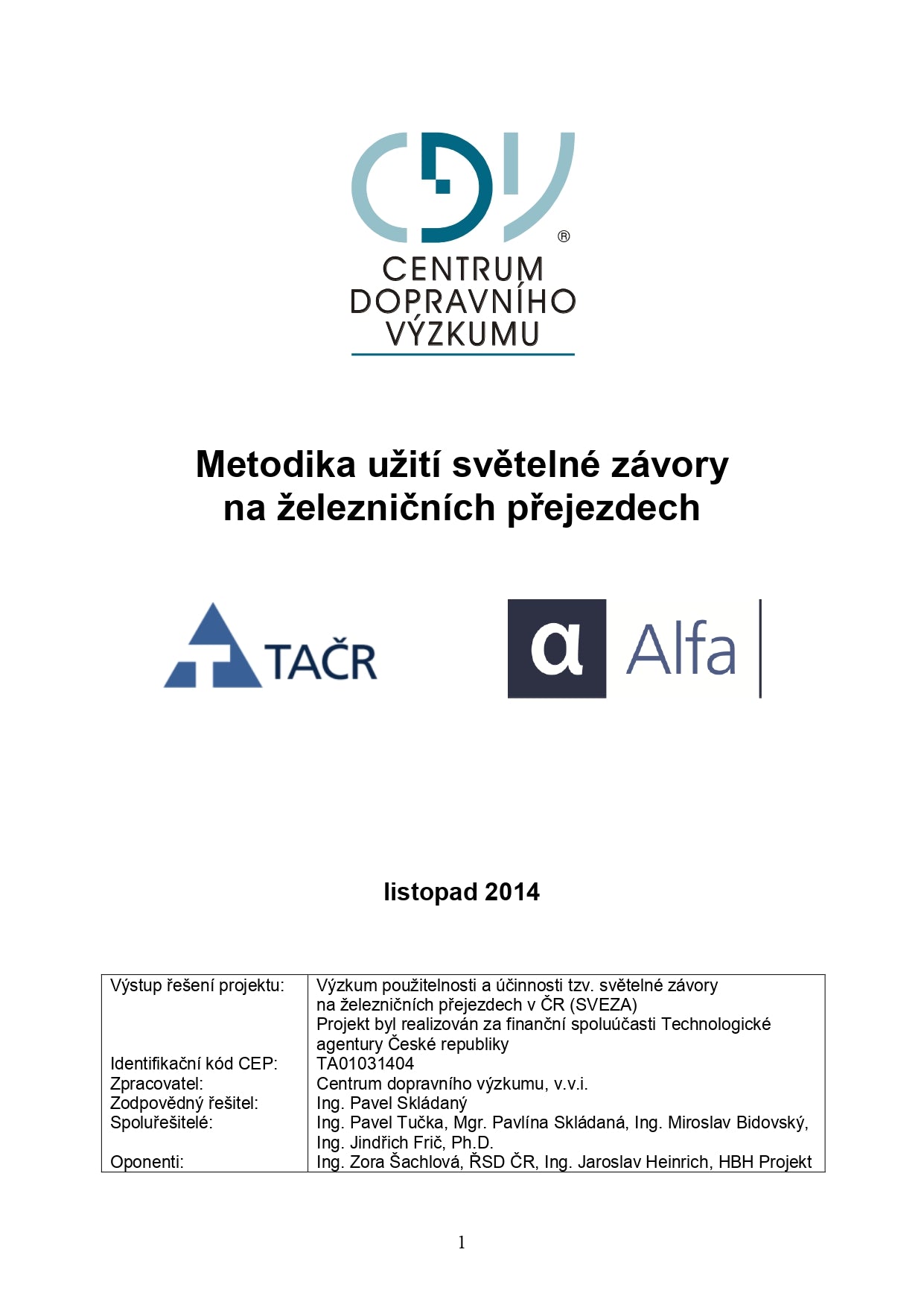 Tato metodika byla vytvořena se státní podporou Technologické agentury ČR v rámci Programu ALFA, v rámci řešení projektu TA01031404 Výzkum použitelnosti a účinnosti tzv. světelné závory na železničních přejezdech v ČR