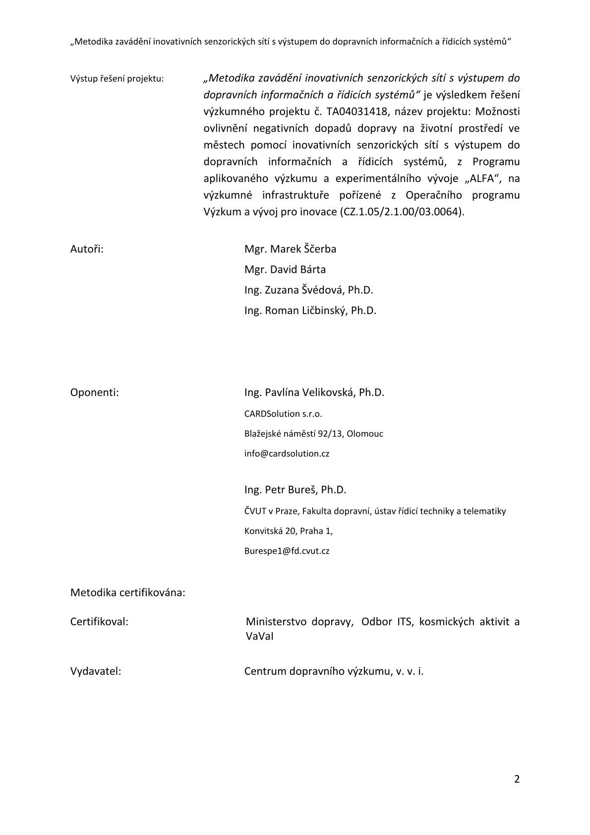 Tato metodika byla vytvořena se státní podporou Technologické agentury ČR v rámci Programu ALFA, v rámci řešení projektu TA04031418 Možnosti ovlivnění negativních dopadů dopravy na životní prostředí ve městech pomocí inovativních senzorických sítí s výstupem do dopravních informačních a řídicích systémů.