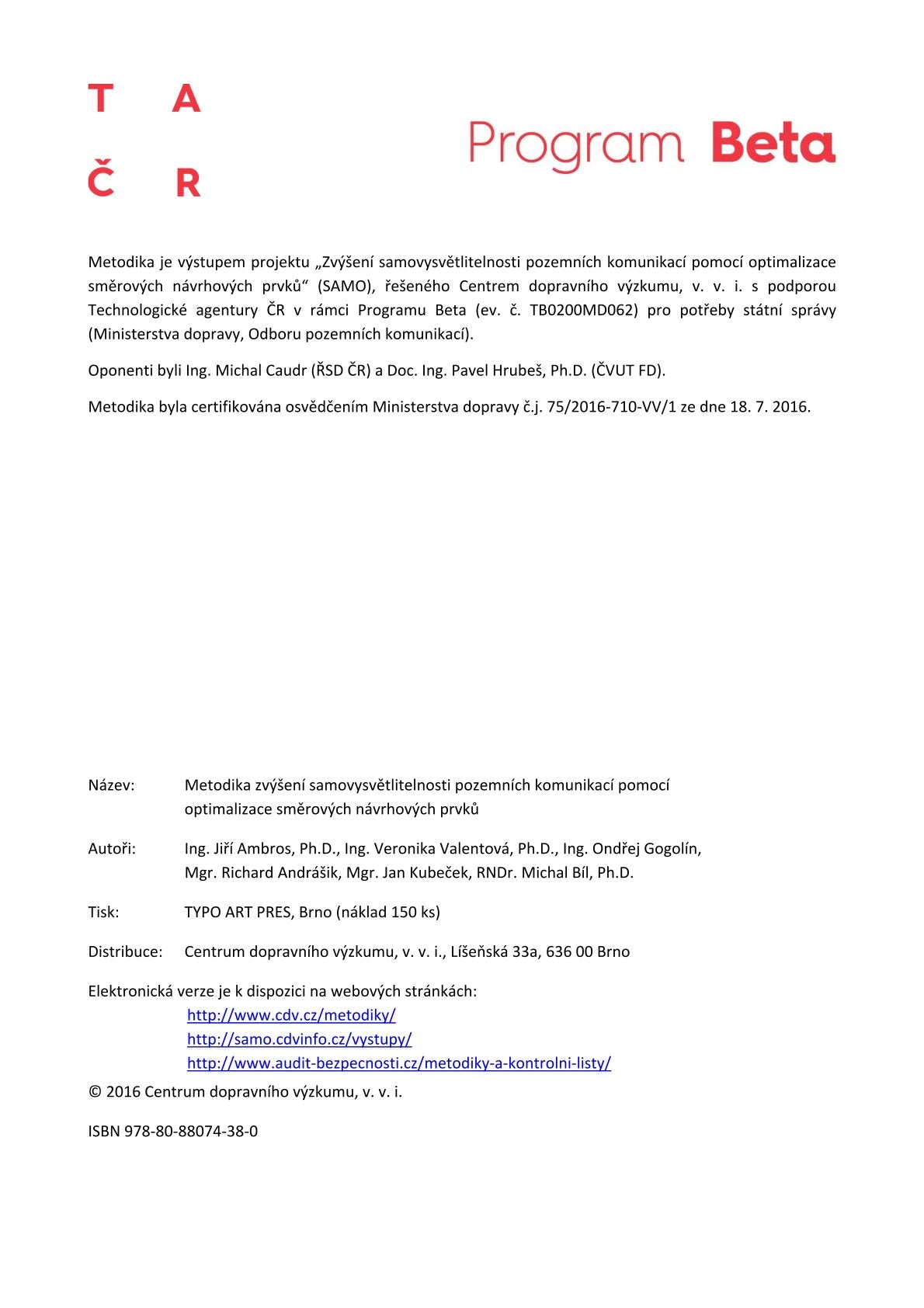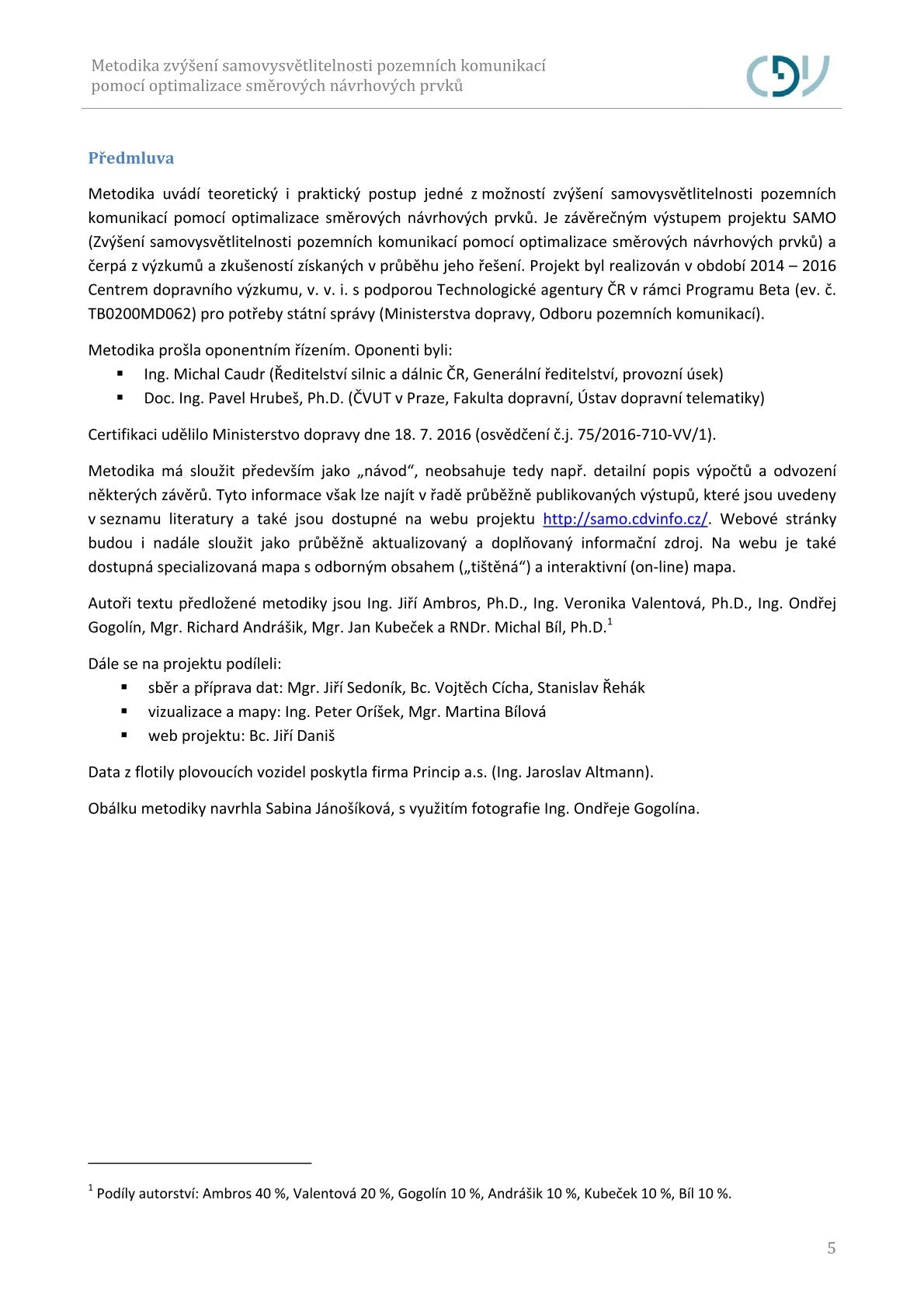 Metodika je výstupem projektu „Zvýšení samovysvětlitelnosti pozemních komunikací pomocí optimalizace směrových návrhových prvků“ (SAMO), řešeného Centrem dopravního výzkumu, v. v. i. s podporou