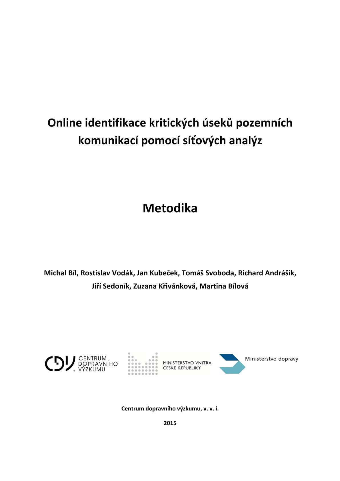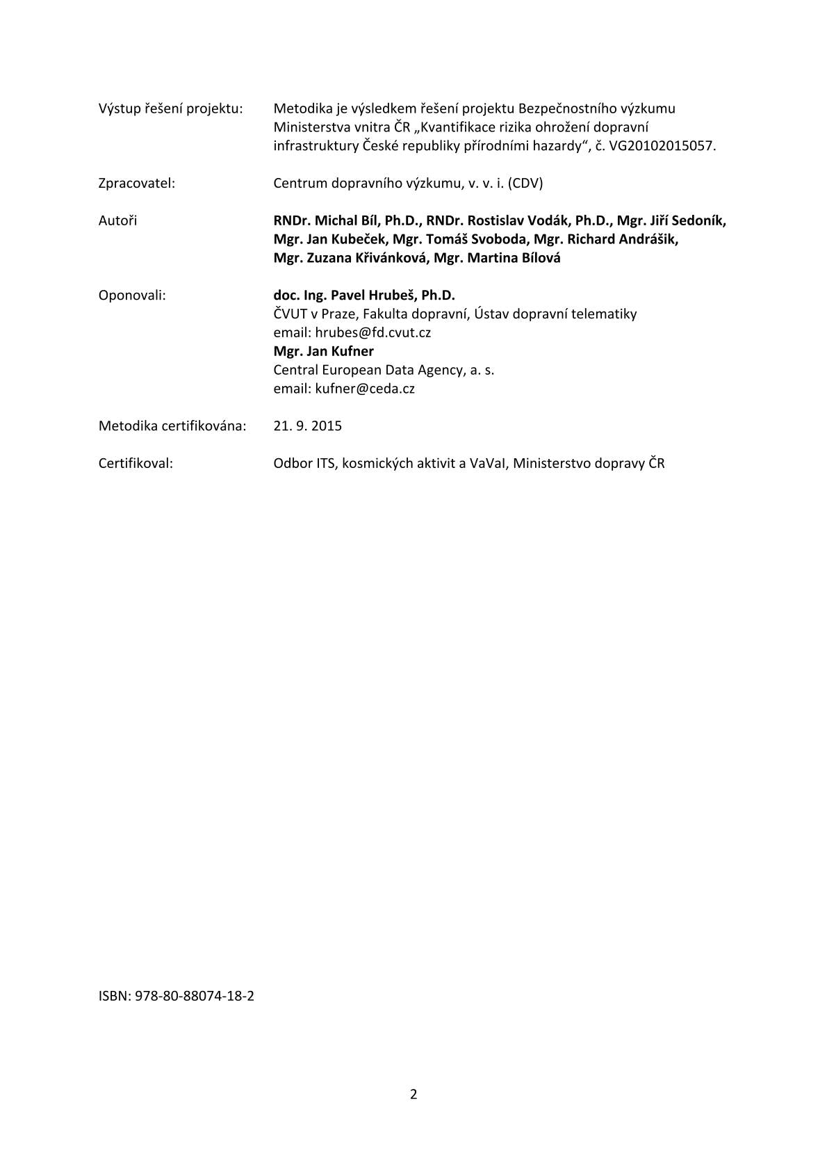 Metodika je výsledkem řešení projektu Bezpečnostního výzkumu Ministerstva vnitra ČR „Kvantifikace rizika ohrožení dopravní infrastruktury České republiky přírodními hazardy“, č. VG20102015057.