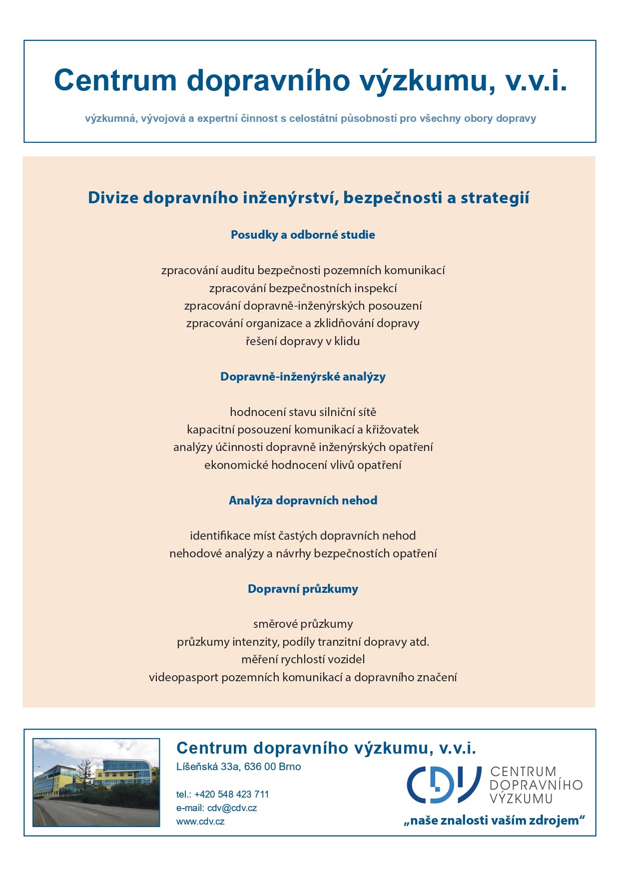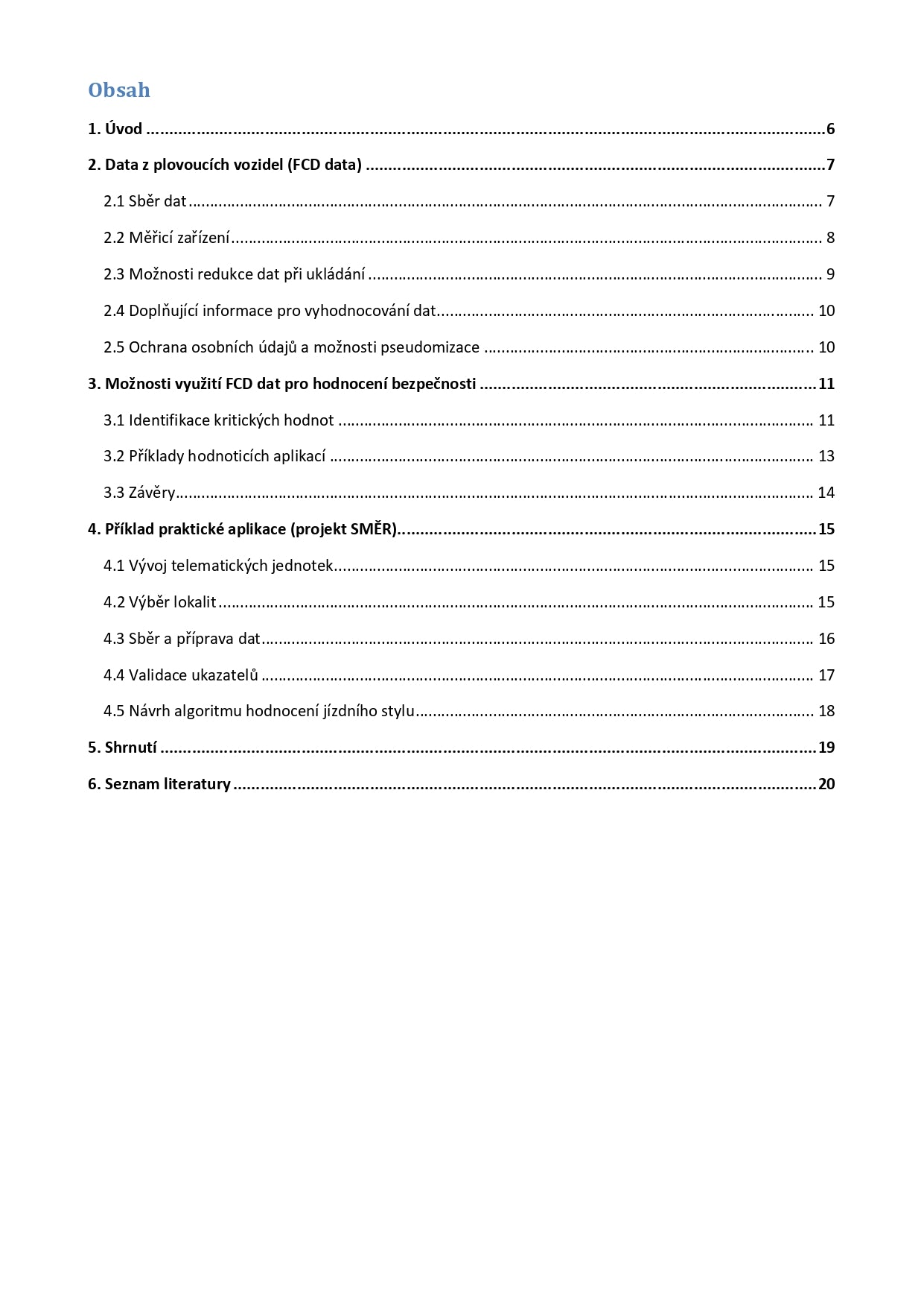 Metodika se zaměřuje na hodnocení bezpečnosti s využitím dat z plovoucích vozidel. Metodika je určena pro výzkumné pracovníky, kteří se zabývají problematikou hodnocení bezpečnosti silničního provozu a uvažují o využití dat z plovoucích vozidel; dále pro pracovníky státní správy a samosprávy, kteří se s touto problematikou setkávají v roli zadavatele výběrových řízení na dodávku dat o dopravě. Obě tyto skupiny metodika seznamuje s dostupnými daty, způsoby sběru a potenciální využitelností pro hodnocení bezpečnosti silničního provozu. Metodika také obsahuje rešerši způsobů vyhodnocení těchto dat a obsahuje i konkrétní příklad sběru a vyhodnocení, využitelného jak pro hodnocení jízdního stylu řidičů, tak pro identifikaci kritických míst silniční sítě.