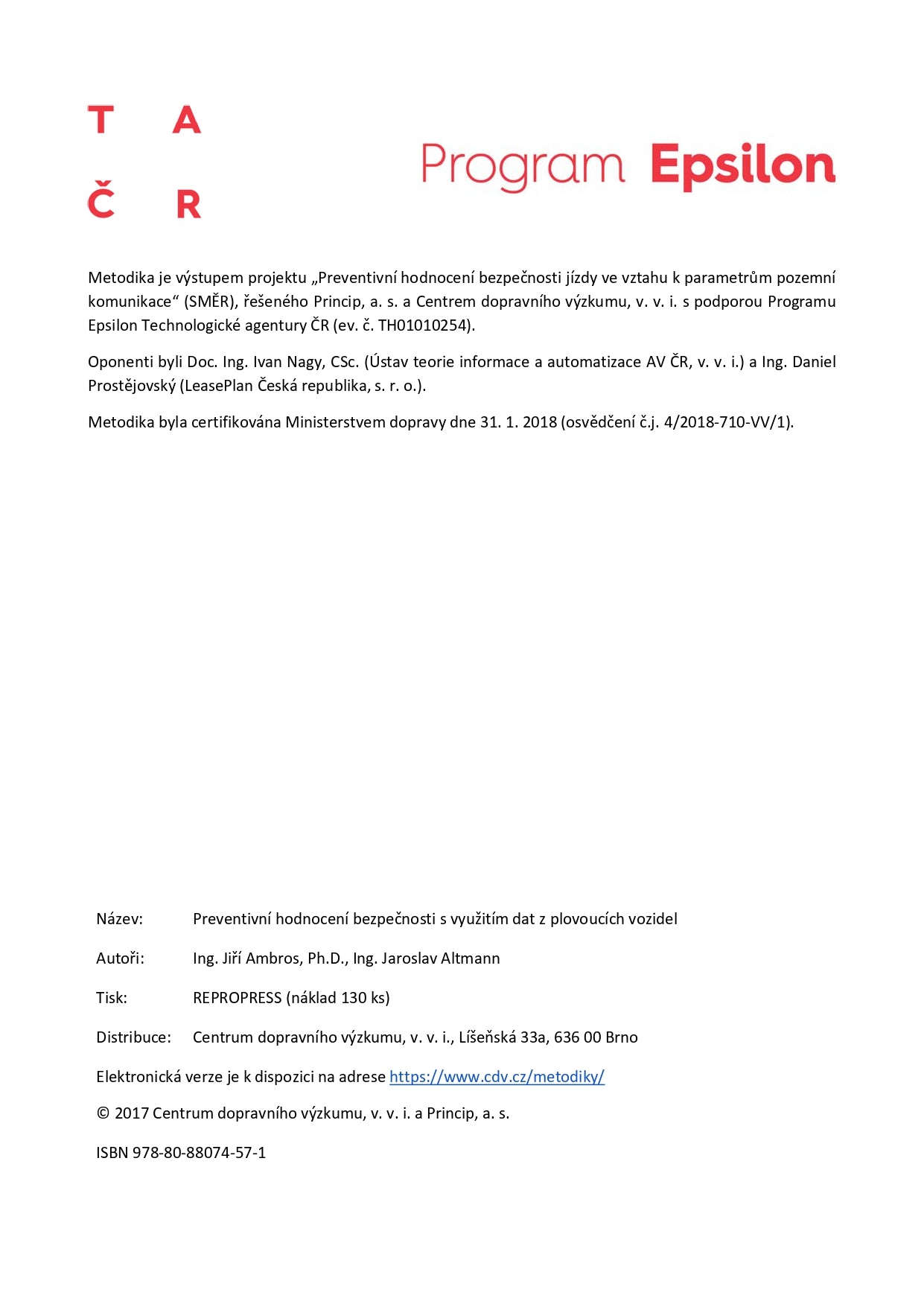 Metodika je výstupem projektu „Preventivní hodnocení bezpečnosti jízdy ve vztahu k parametrům pozemní komunikace“ (SMĚR), řešeného Princip, a. s. a Centrem dopravního výzkumu, v. v.i. s podporou Programu Epsilon Technologické agentury ČR (ev. č. TH01010254).