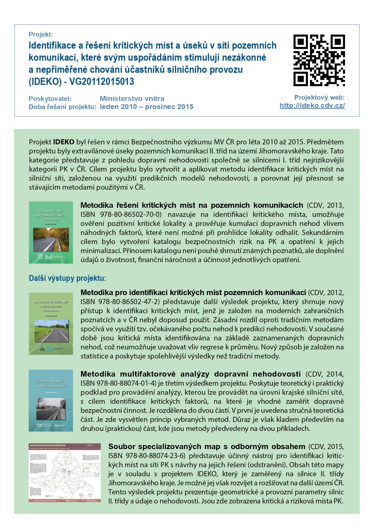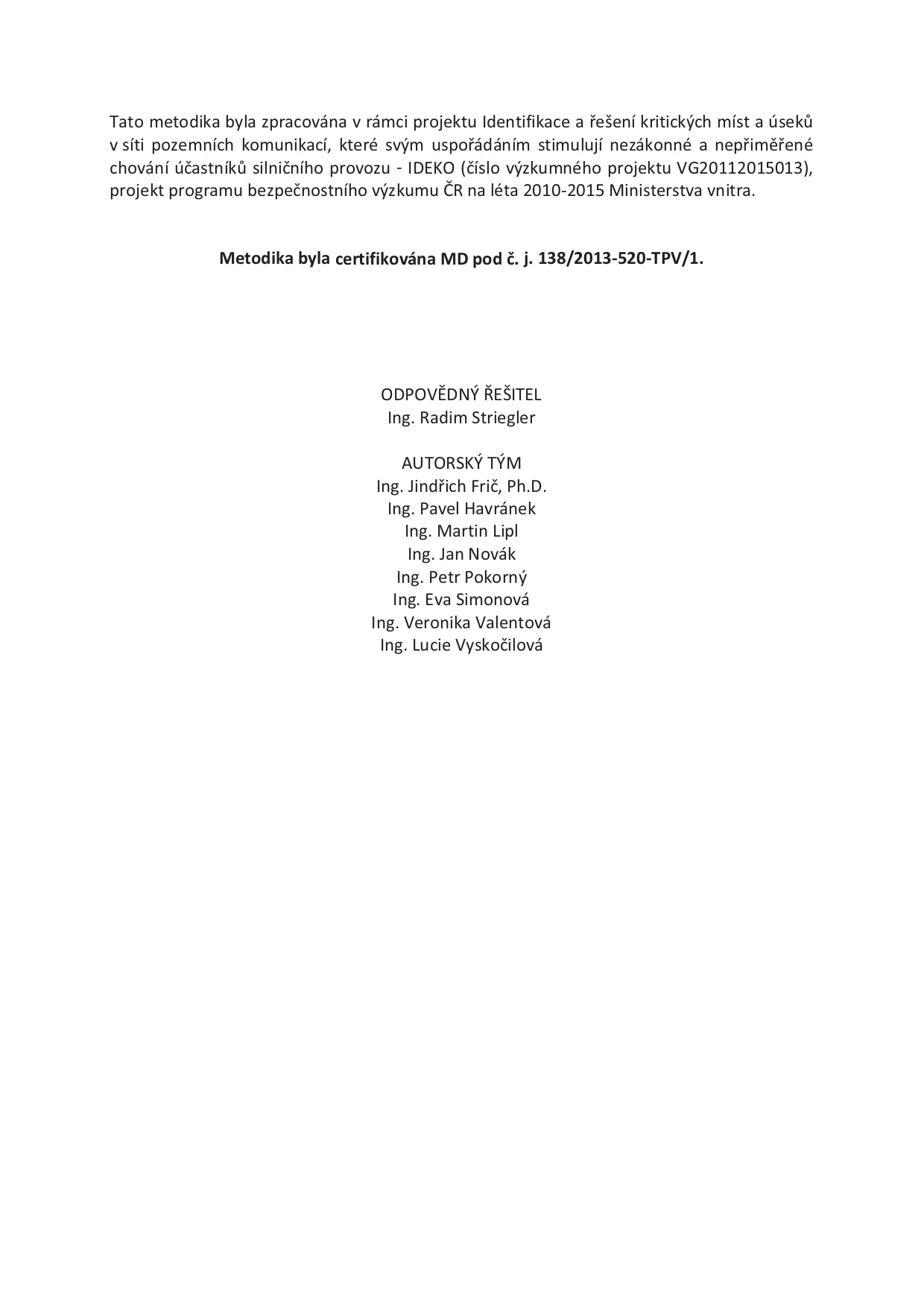 Tato metodika byla zpracována v rámci projektu Identifikace a řešení kritických míst a úseků v síti pozemních komunikací, které svým uspořádáním stimulují nezákonné a nepřiměřené chování účastníků silničního provozu - IDEKO ( VG20112015013), projekt programu bezpečnostního výzkumu ČR na léta 2010-2015 Ministerstva vnitra.