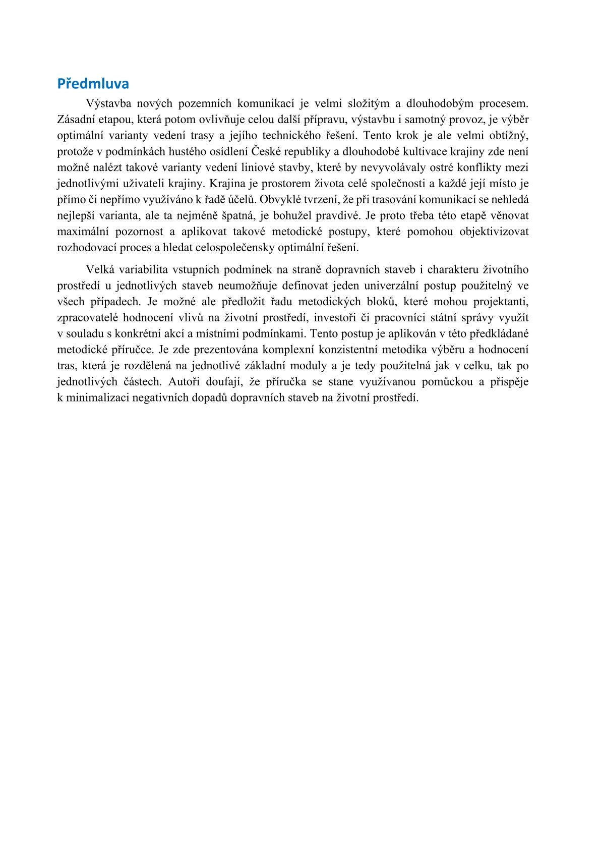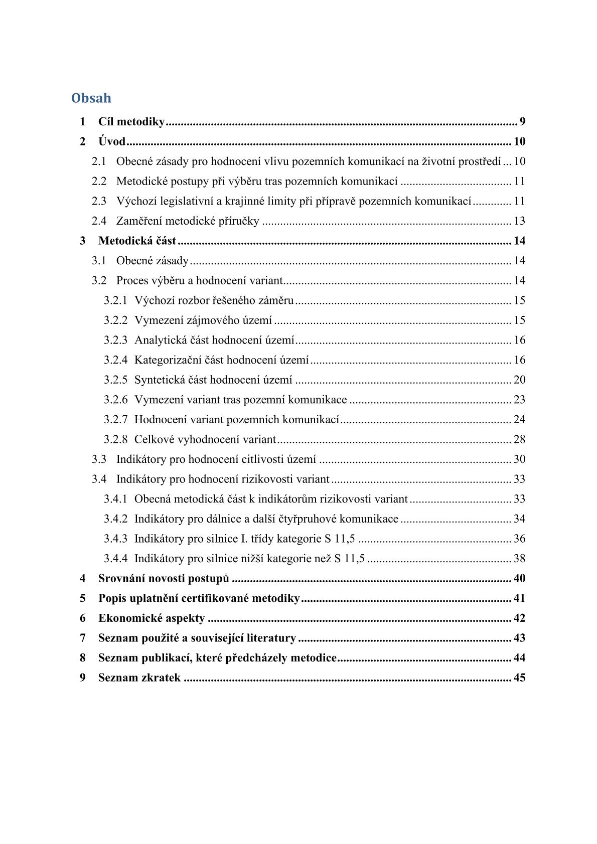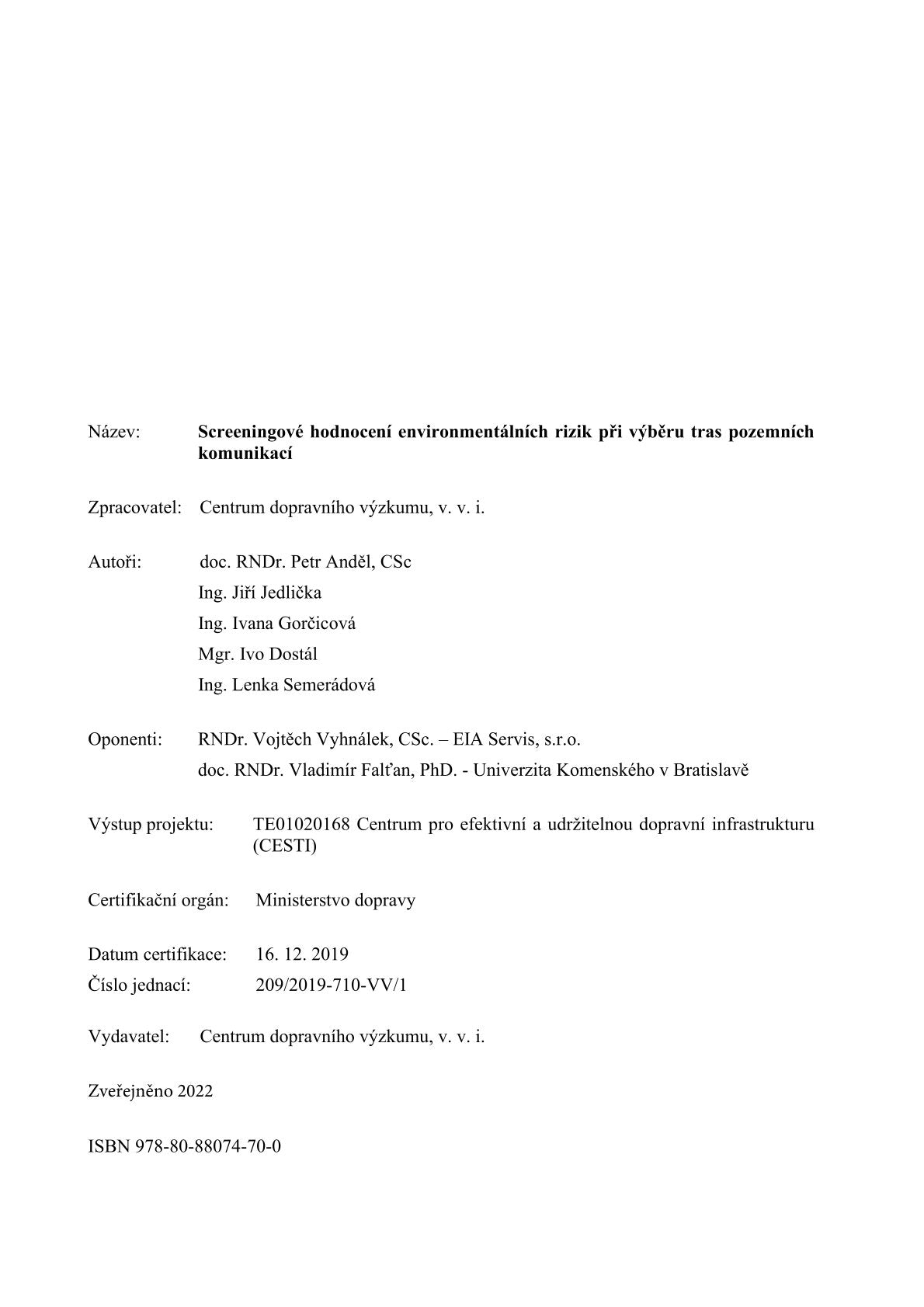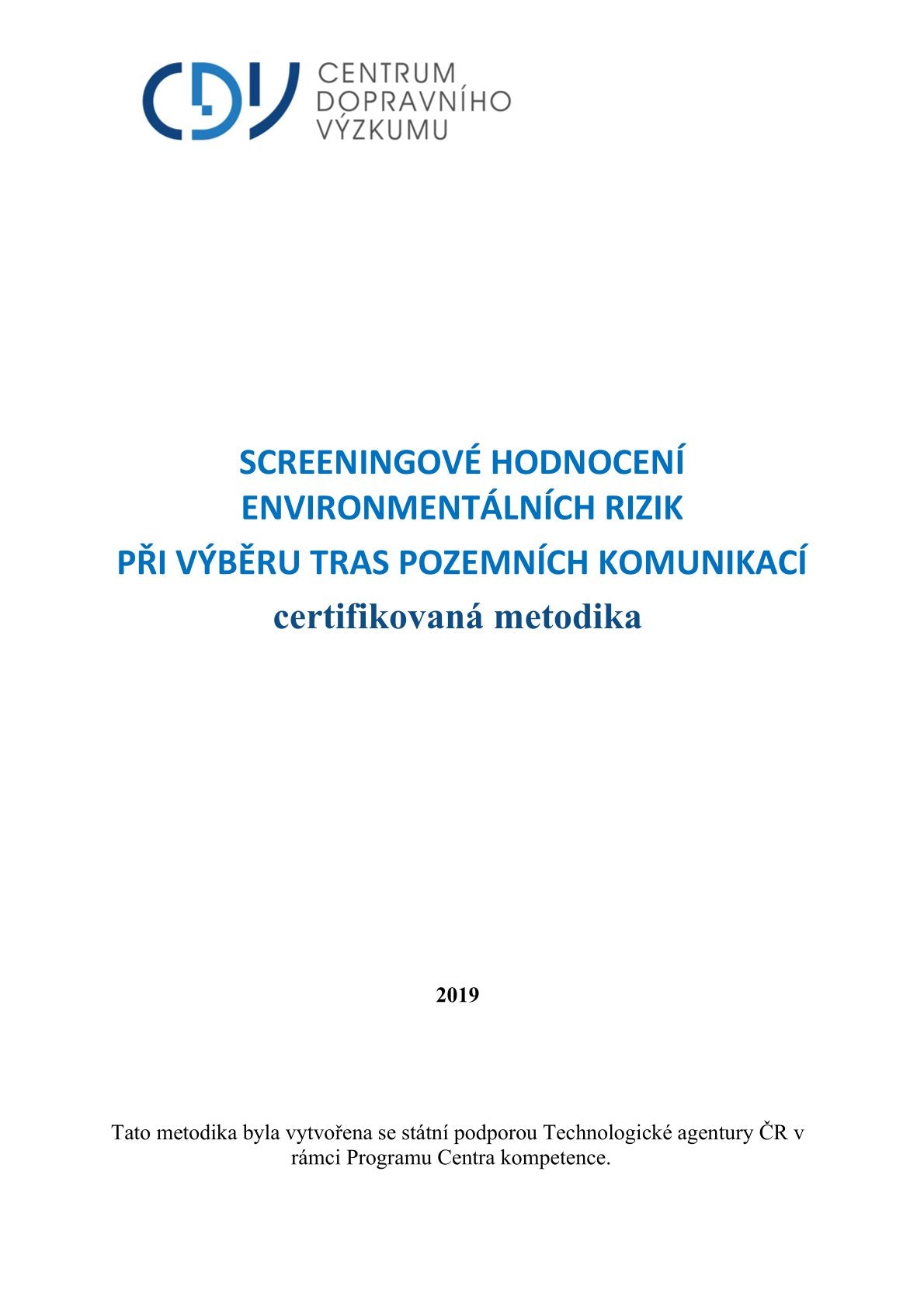 Screeningové hodnocení environmentálních rizik při výběru tras pozemních komunikací Metodika se zabývá včasným stanovením potenciálních environmentálních rizik variant nových pozemních komunikací, a to na samém počátku investiční přípravy. Pomocí formalizovaného postupu v GIS je navržena série podkladových map vhodných pro návrh různých variant tras projektantem a soubor indikátorů pro hodnocení jejich přijatelnosti z hlediska dopadů na životní prostředí. Hodnocení vychází z environmentální legislativy, konkrétní místní situace a ze srovnání v širším kontextu ČR. K tomu byly zpracovány dvě série indikátorů, které umožňují posoudit stavbu v kontextu (a) typů území v ČR a (b) jiných analogických silničních staveb.
