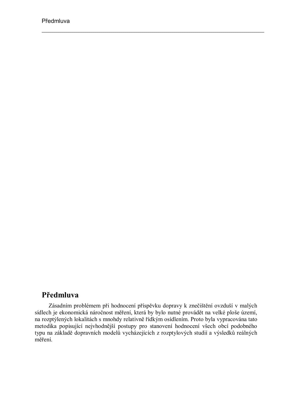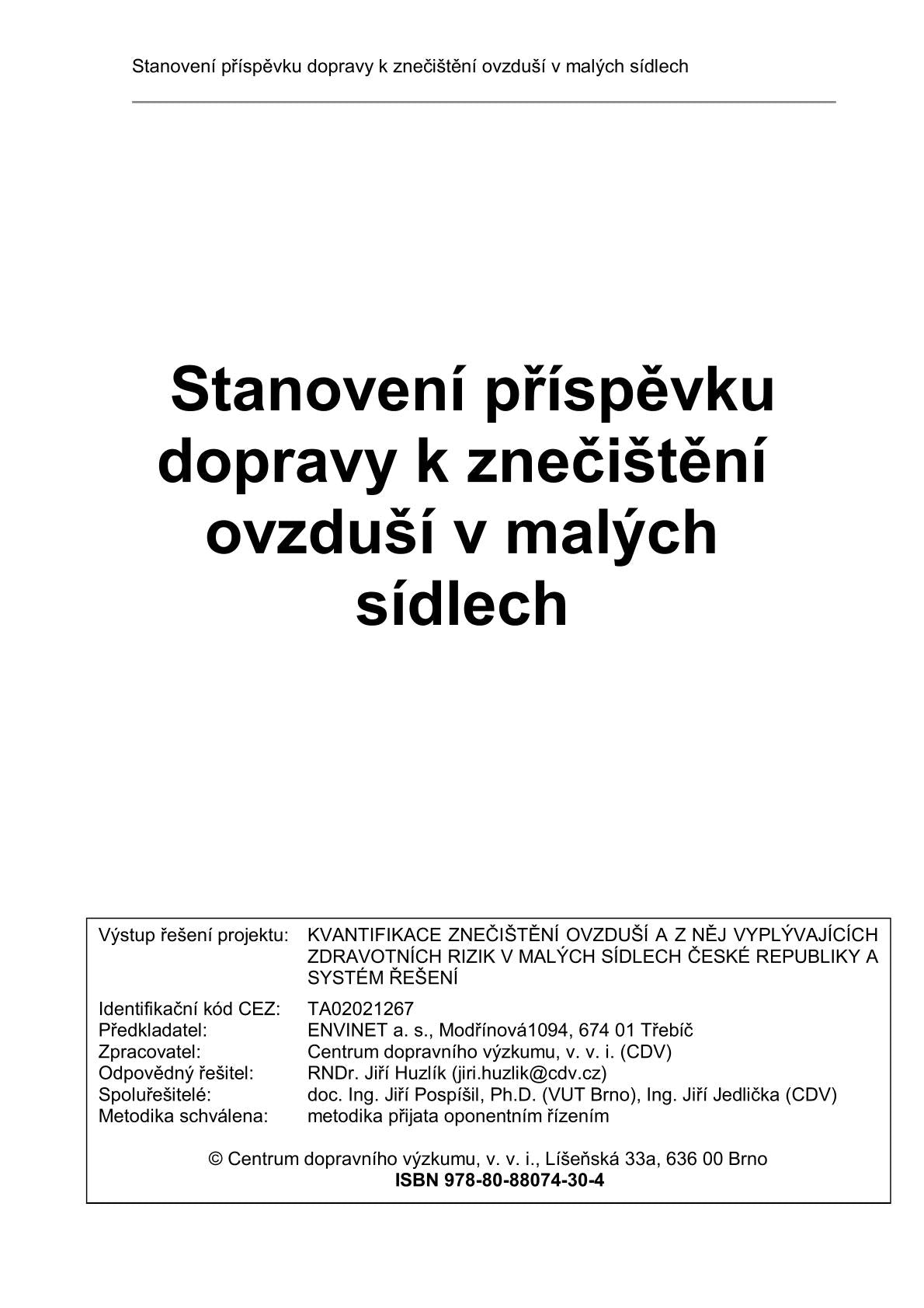 Zásadním problémem při hodnocení příspěvku dopravy k znečištění ovzduší v malých sídlech je ekonomická náročnost měření, která by bylo nutné provádět na velké ploše území, na rozptýlených lokalitách s mnohdy relativně řídkým osídlením. Proto byla vypracována tato metodika popisující nejvhodnější postupy pro stanovení hodnocení všech obcí podobného typu na základě dopravních modelů vycházejících z rozptylových studií a výsledků reálných měření.