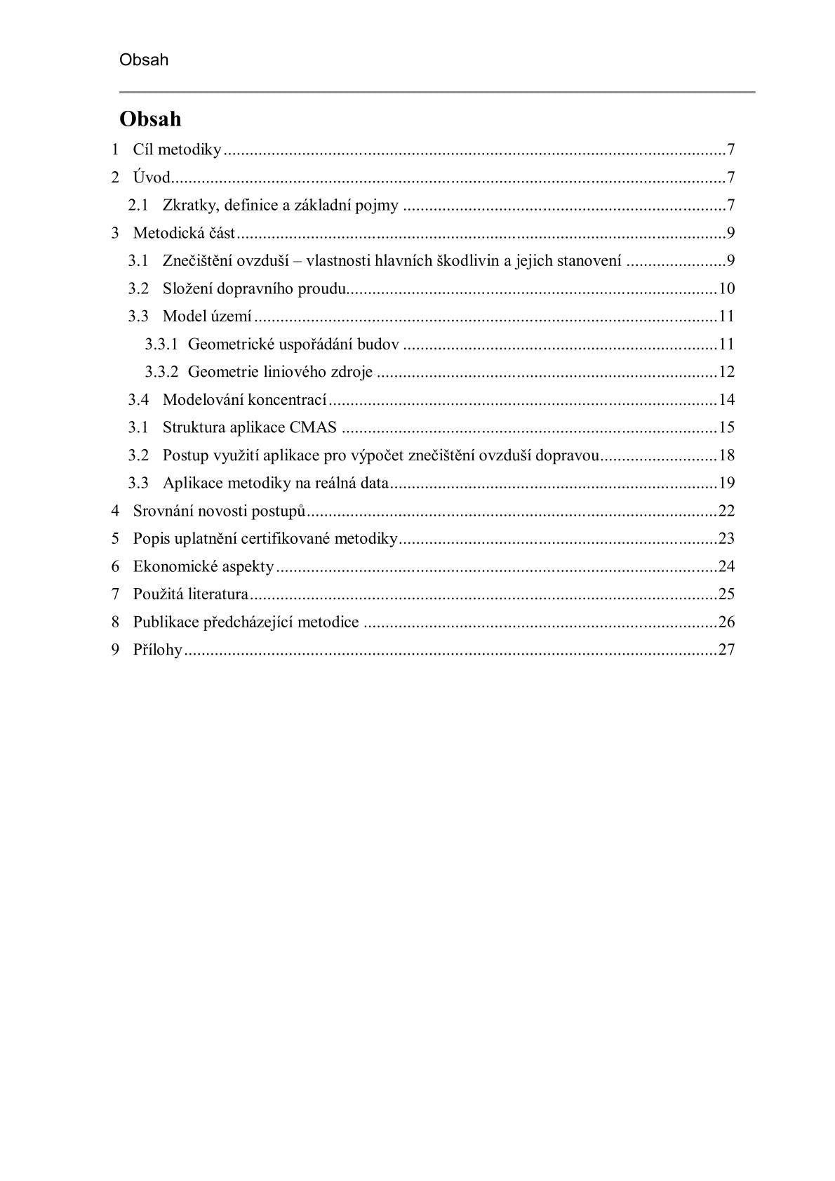 Metodika slouží k využití výsledků měření kvality ovzduší, intenzity dopravy a meteorologické situace k hodnocení všech obcí podobného typu na základě dopravních modelů vycházejících z rozptylových studií a výsledků reálných měření. Výsledný model byl zpracován pro oxidy dusíku (NOx), oxid uhelnatý (CO), polycyklické aromatické uhlovodíky (PAH), benzo[a]pyren (BaP) a pevné částice (PM10, PM2.5) v různých typech zástavby. Je jednoduše rozšiřitelný i pro další škodliviny.