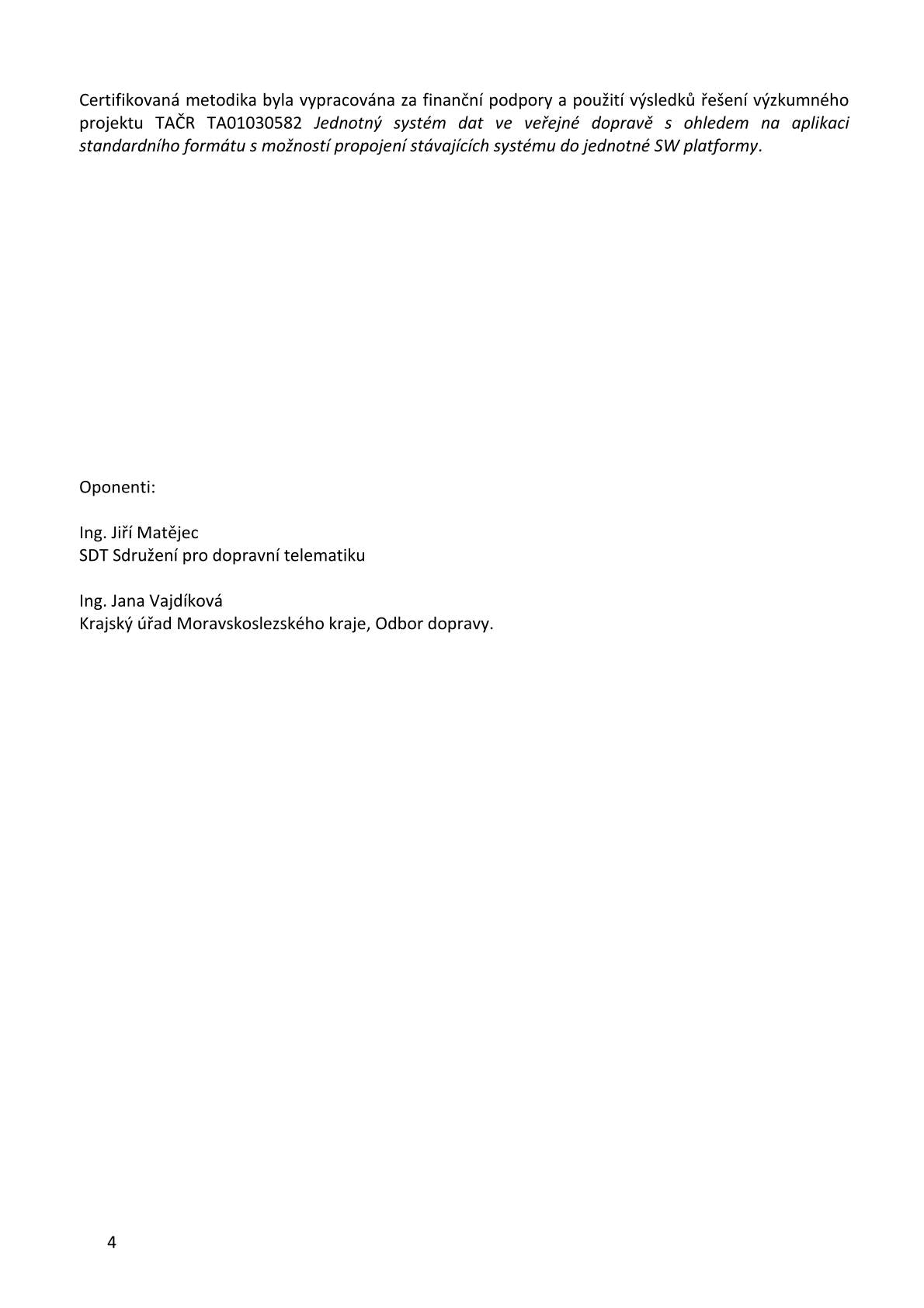 Tato metodika byla vytvořena se státní podporou Technologické agentury ČR v rámci Programu ALFA, v rámci řešení projektu TA01030582 Jednotný systém dat ve veřejné dopravě s ohledem na aplikaci standardního formátu s možností propojení stávajících systému do jednotné SW platformy.