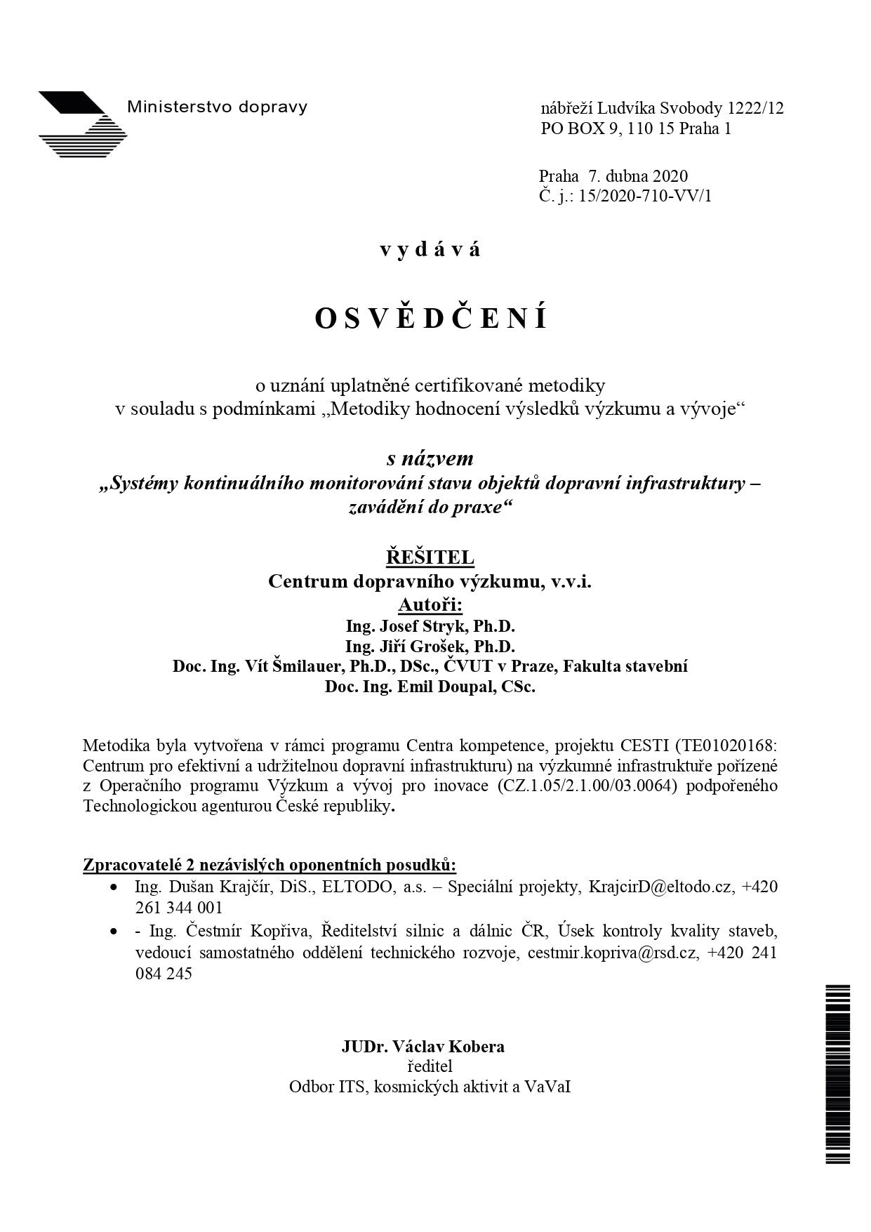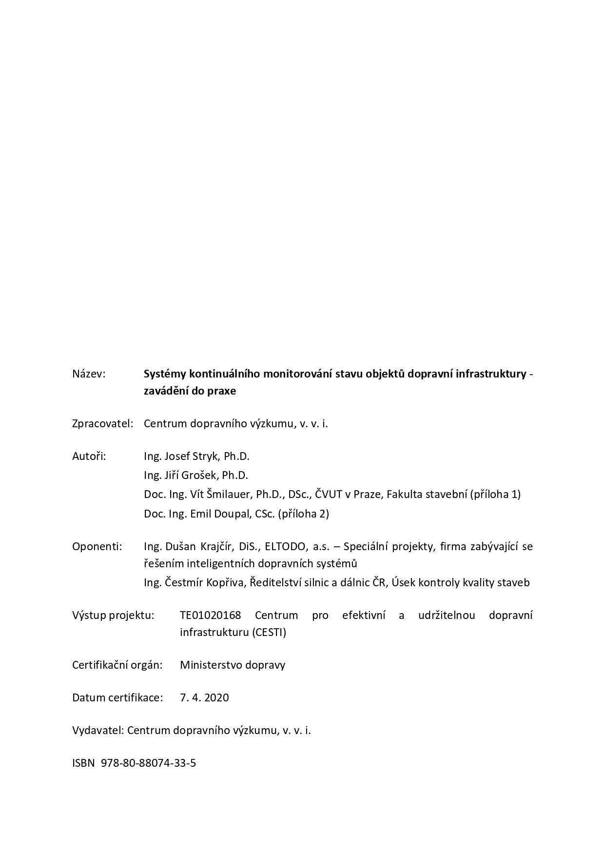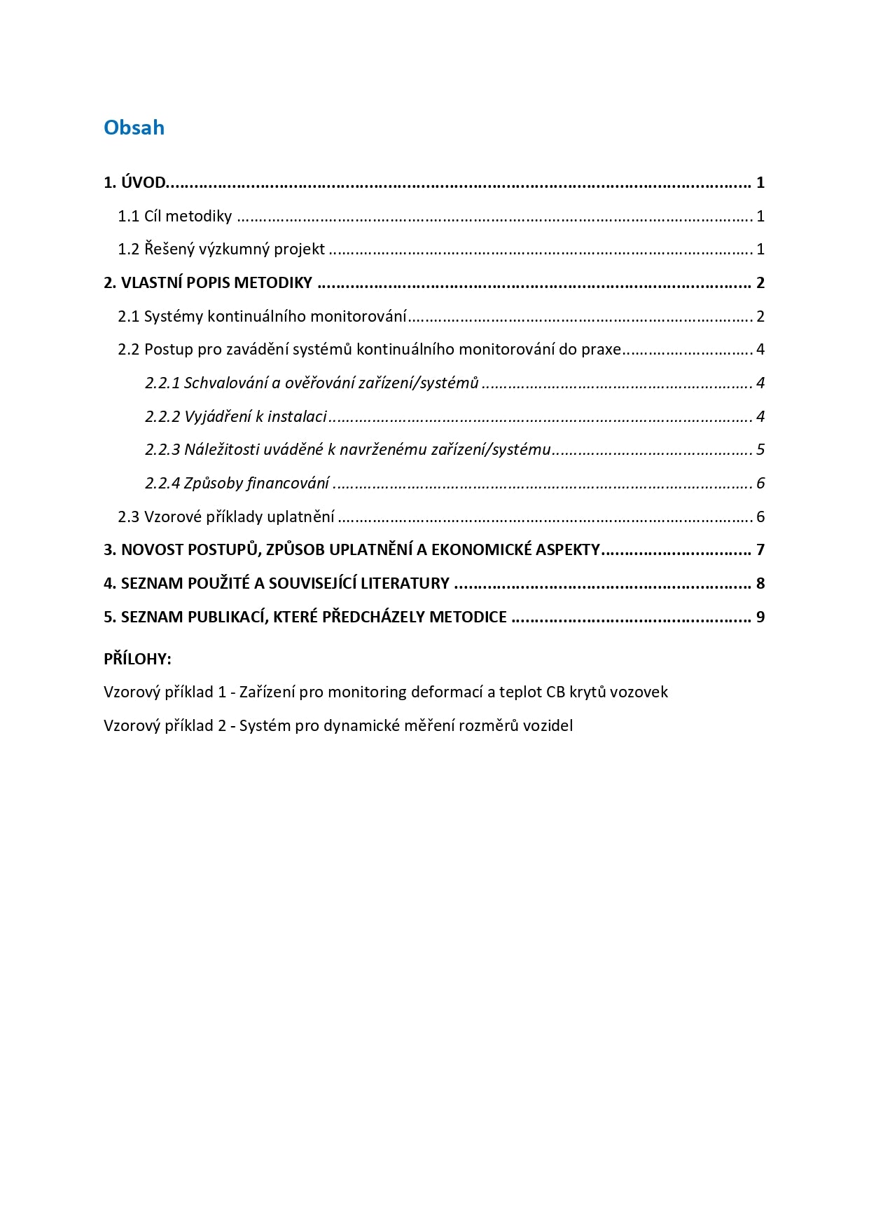 Metodika popisuje systémy, které využívají senzory zabudované do konstrukce vozovky či jiných objektů dopravní infrastruktury a zařízení osazené v jejich blízkosti, určené pro kontinuální monitorování jejich stavu a vlivů, které na ně působí.