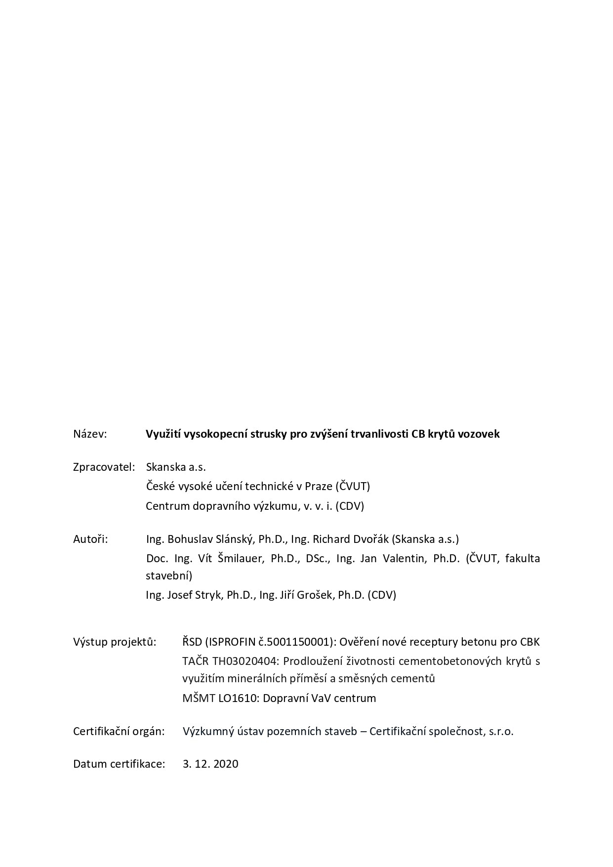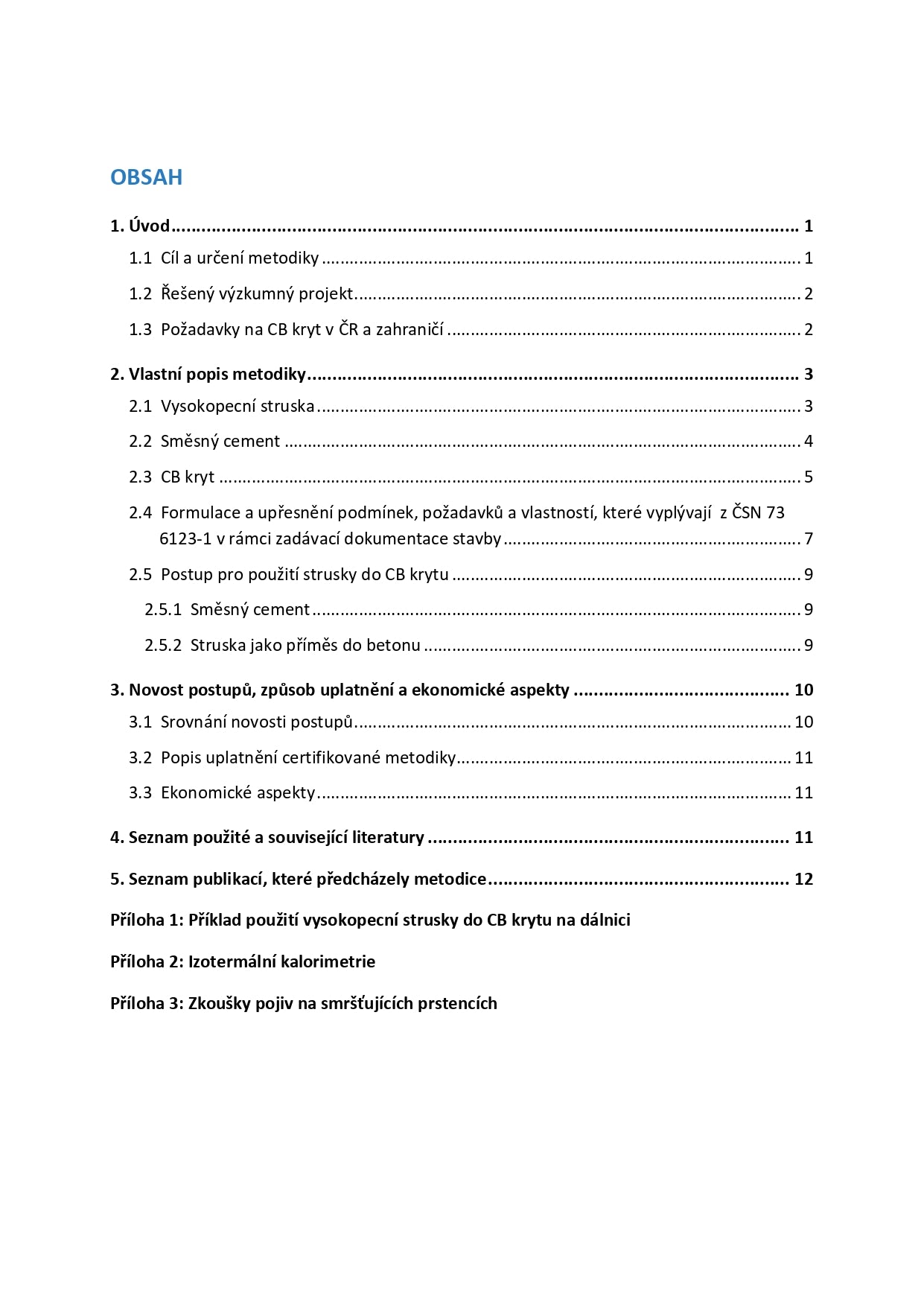 Metodika popisuje jak postupovat při použití mleté granulované vysokopecní strusky (dále jen strusky) do betonu při výstavbě objektů dopravní infrastruktury, se zaměřením na použití do betonu pro cementobetonové kryty dálnic a silnic I. třídy. Struska může vstupovat jako složka cementu (CEM II/A-S a CEM II/B-S) či jako aktivní příměs při výrobě betonu. Metodika popisuje náhradu portlandského slínku struskou do 35 % hm. betonové směsi. Popsány jsou zkušenosti z realizace zkušebního úseku na dálnici D1 v roce 2018 a 2019, kde byly uplatněny postupy uvedené v této metodice.