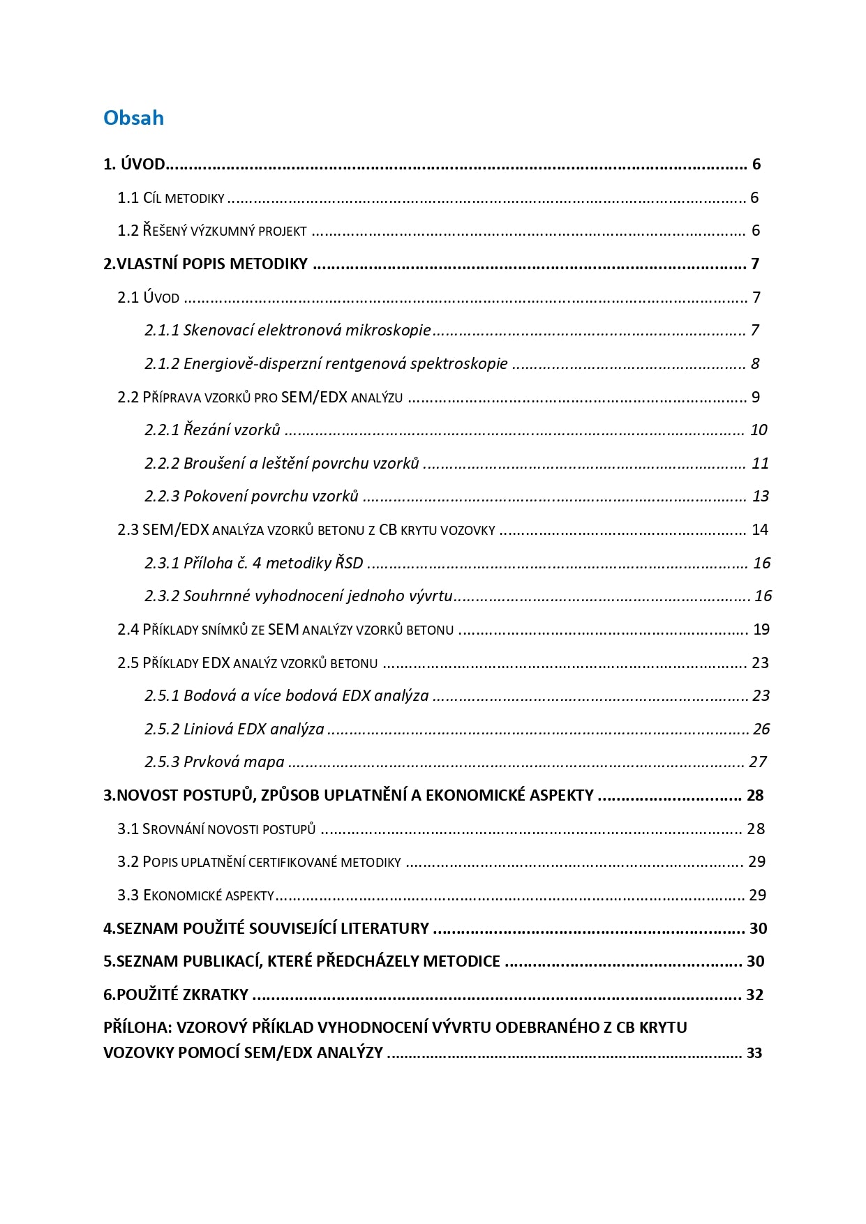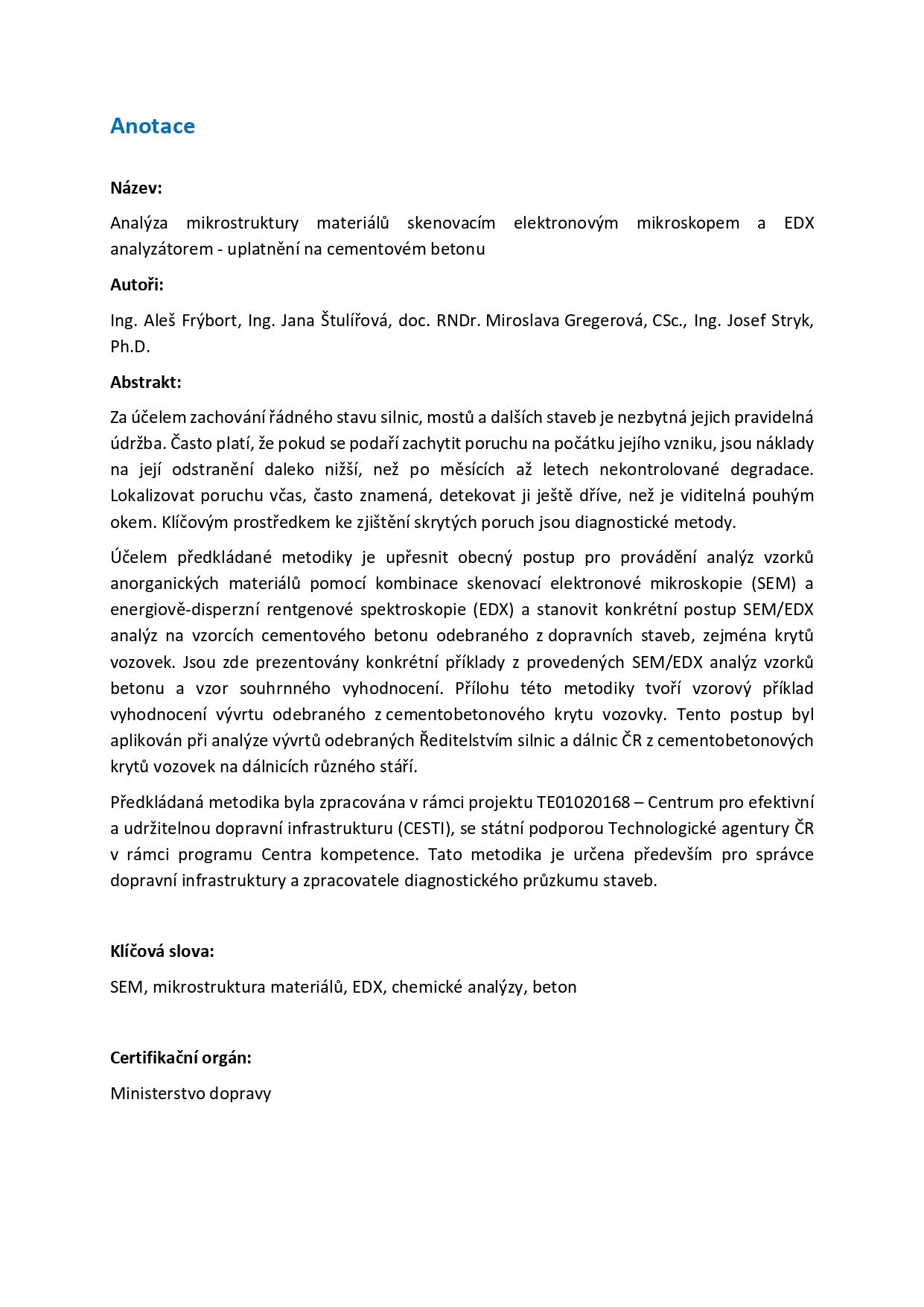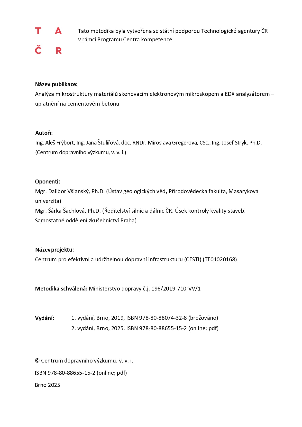 The methodology describes the use of a combination of a scanning electron microscope (SEM - Scanning Electron Microscopy) and an energy-dispersive X-ray analyzer (EDX - Energy Dispersive X-ray spectroscopy) in the analysis of the microstructure and degradation processes of materials used in transport infrastructure, especially concrete.