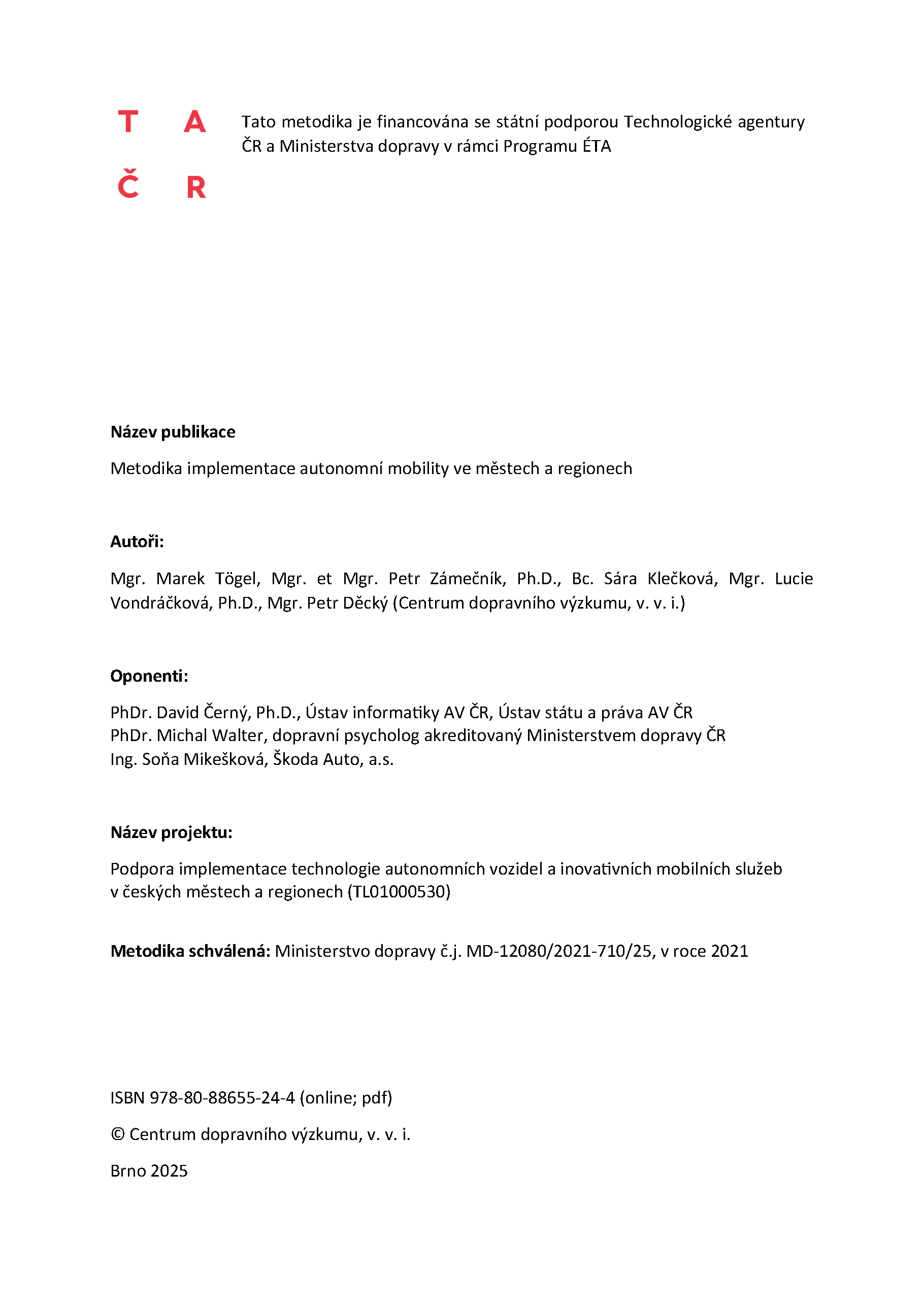 The document further analyzes key technologies (CAD, MaaS, C-ITS, V2X, electromobility) and the vision of shared mobility. Contains rich research and links for deeper study. The methodology is structured and allows the use of only partial parts as needed. It is supplemented by two other documents: Recommendations to support the development of autonomous mobility in the Czech Republic and the monograph Autonomous Mobility of the 21st Century .