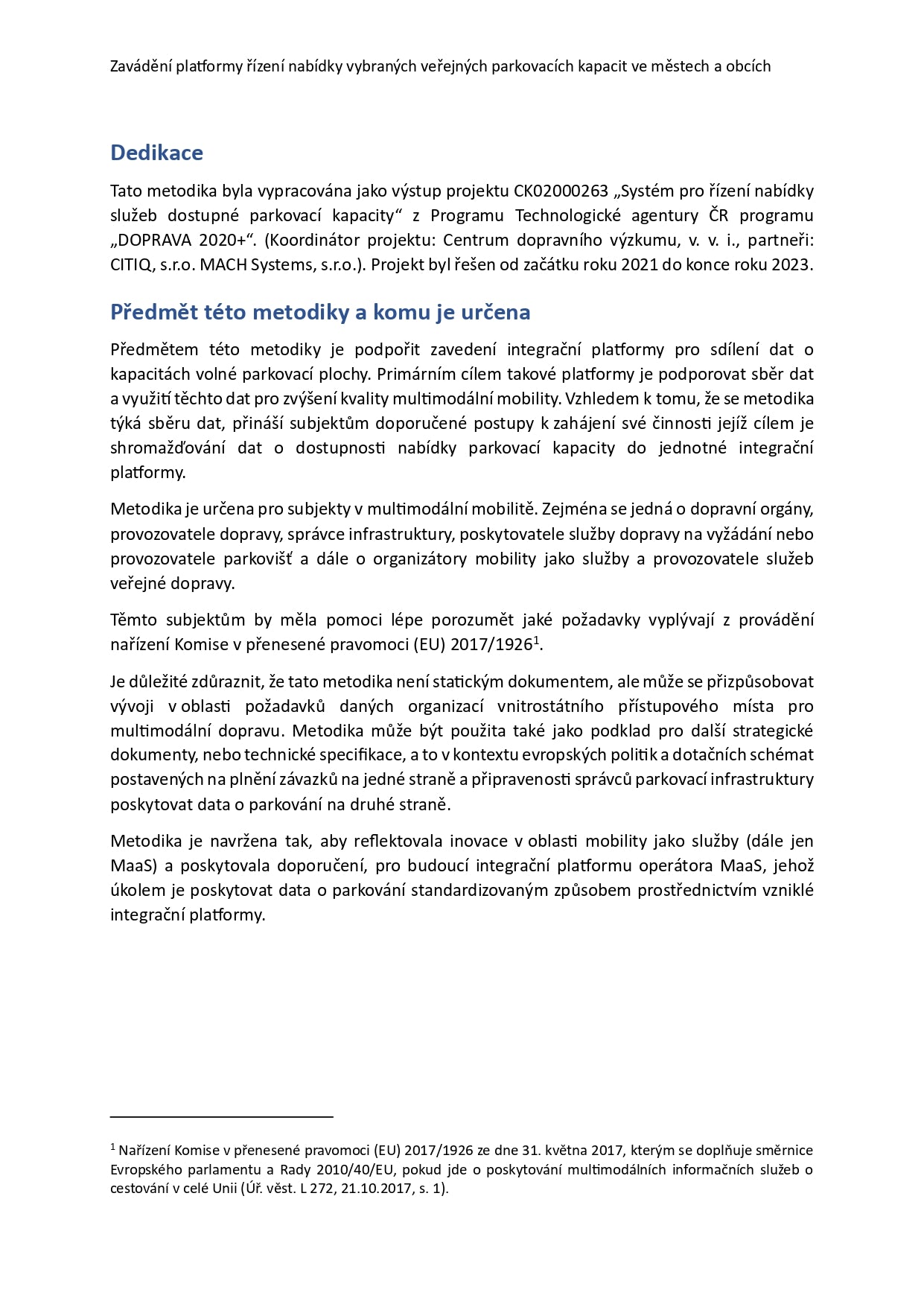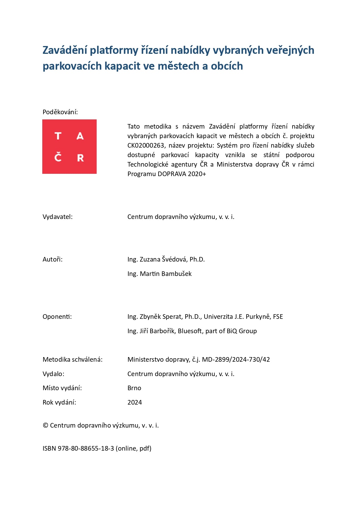 This methodology, entitled Implementation of a platform for managing the supply of selected parking capacities in cities and municipalities, project no. CK02000263, project name: System for managing the supply of available parking capacity services, was created with the state support of the Technology Agency of the Czech Republic and the Ministry of Transport of the Czech Republic as part of the TRANSPORT 2020+ Program