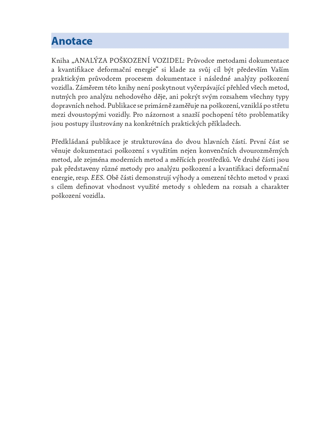 Kniha si klade za cíl být praktickým průvodcem procesem dokumentace a následné analýzy poškození vozidla po nehodě.
