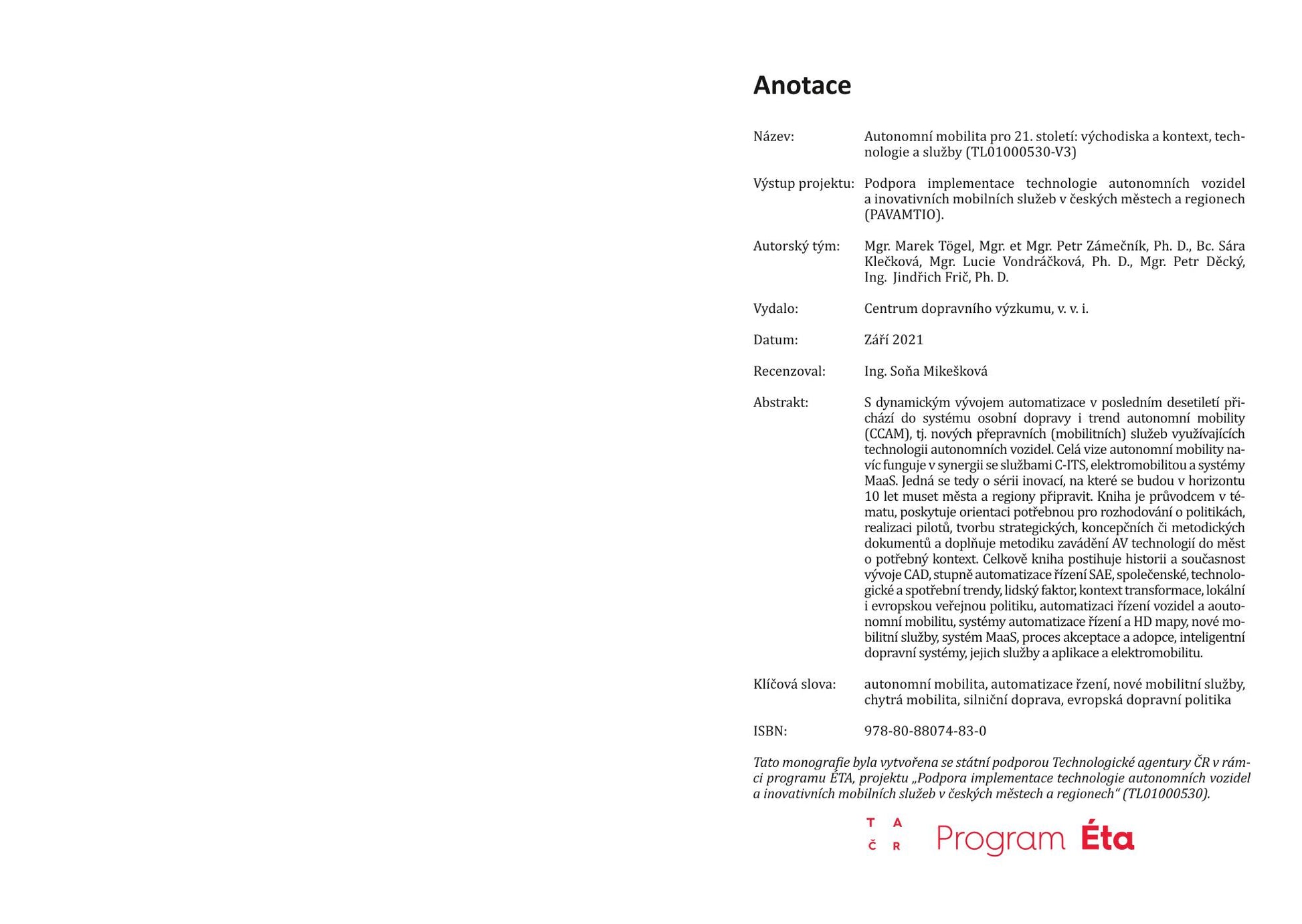 Tato kniha byla spolufinancována se státní podporou Technologické agentury ČR v rámci Programu ÉTA, v rámci řešení projektu TL01000530 Podpora implementace technologie autonomních vozidel a inovativních mobilních služeb v českých městech a regionech.