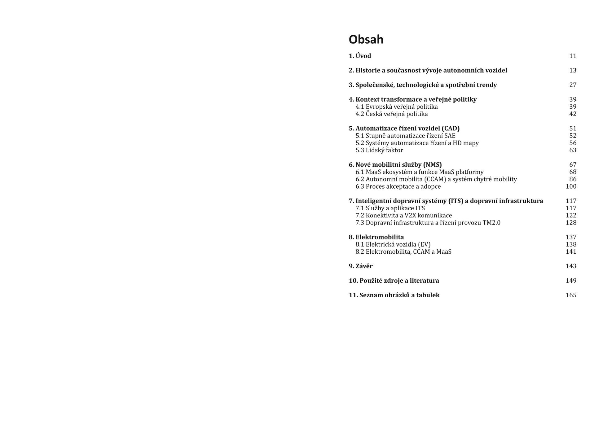 Kniha postihuje historii a současnost vývoje CAD, stupně automatizace řízení SAE, společenské, technologické a spotřební trendy, lidský faktor, kontext transformace, lokální i evropskou veřejnou politiku, automatizaci řízení vozidel a autonomní mobilitu, systémy automatizace řízení a HD mapy, nové mobilitní služby, systém MaaS, proces akceptace a adopce, inteligentní dopravní systémy, jejich služby a aplikace a elektromobilitu.