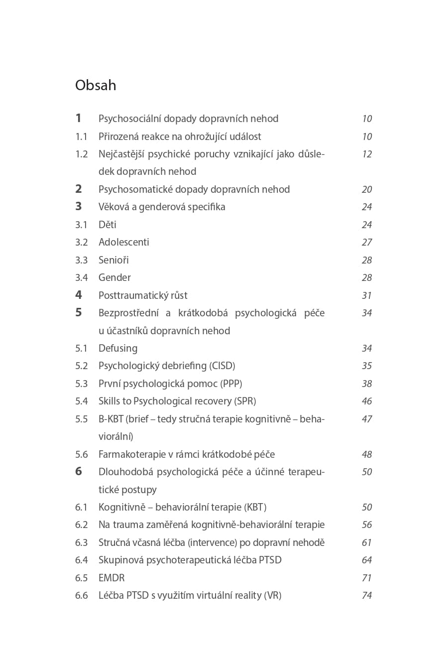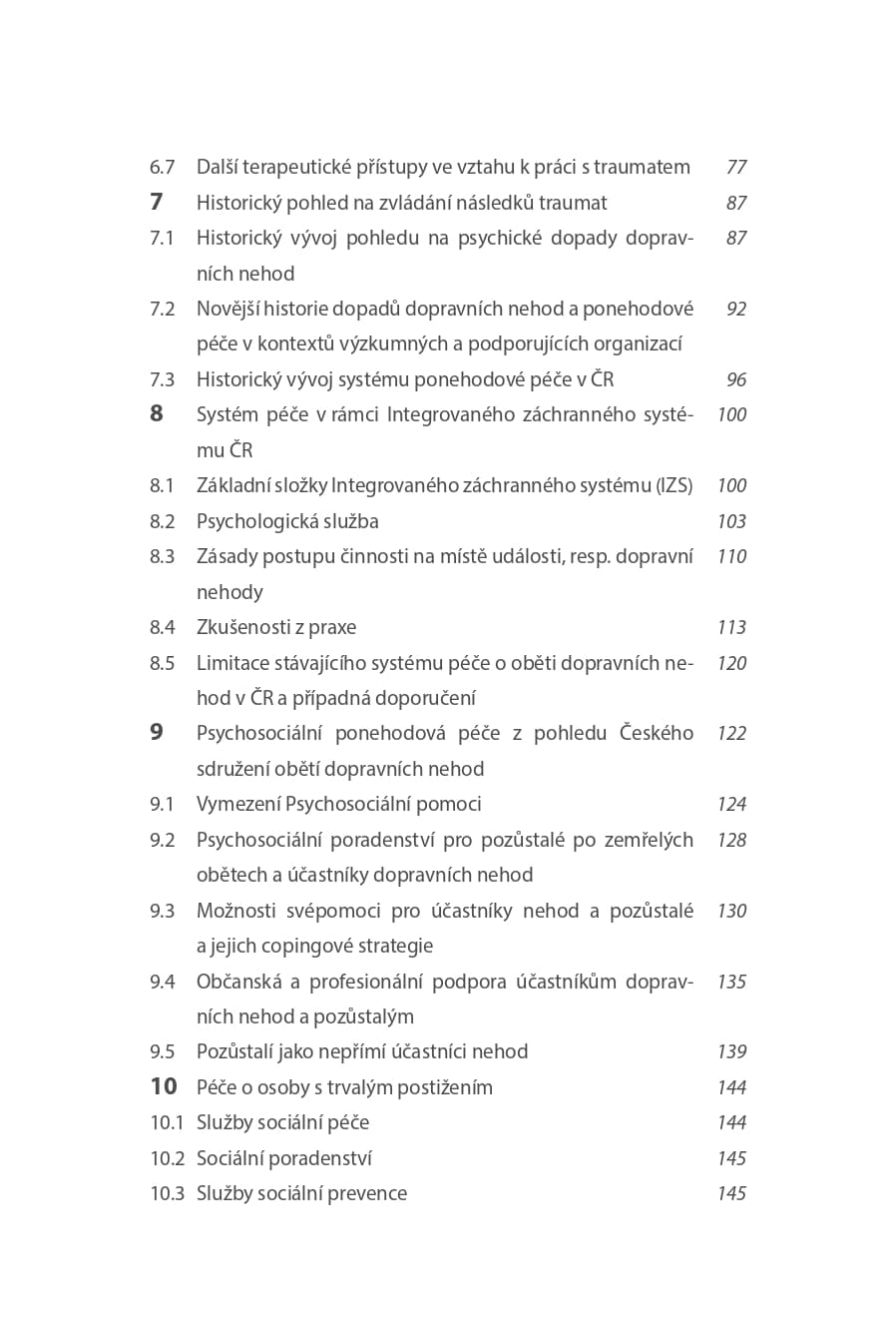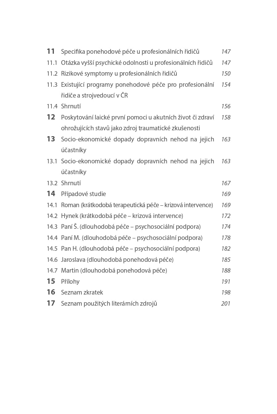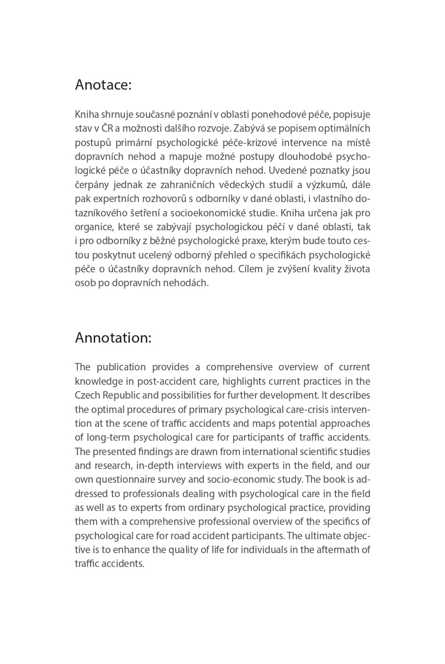 Zabývá se popisem optimálních postupů primární psychologické péče-krizové intervence na místě dopravních nehod a mapuje možné postupy dlouhodobé psychologické péče o účastníky dopravních nehod. Uvedené poznatky jsou čerpány jednak ze zahraničních vědeckých studií a výzkumů, dále pak expertních rozhovorů s odborníky v dané oblasti, i vlastního dotazníkového šetření a socioekonomické studie. Kniha určena jak pro organice, které se zabývají psychologickou péčí v dané oblasti, tak i pro odborníky z běžné psychologické praxe, kterým bude touto cestou poskytnut ucelený odborný přehled o specifikách psychologické péče o účastníky dopravních nehod. Cílem je zvýšení kvality života osob po dopravních nehodách.