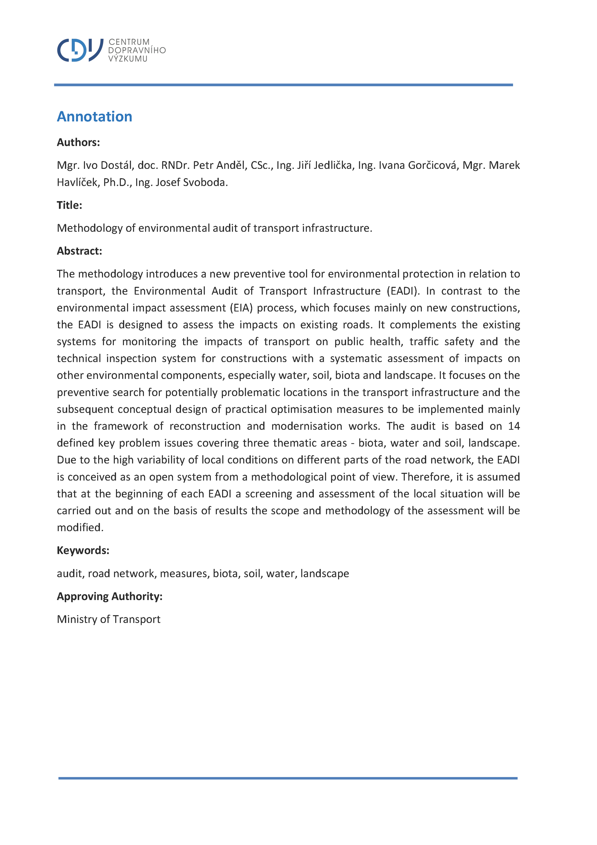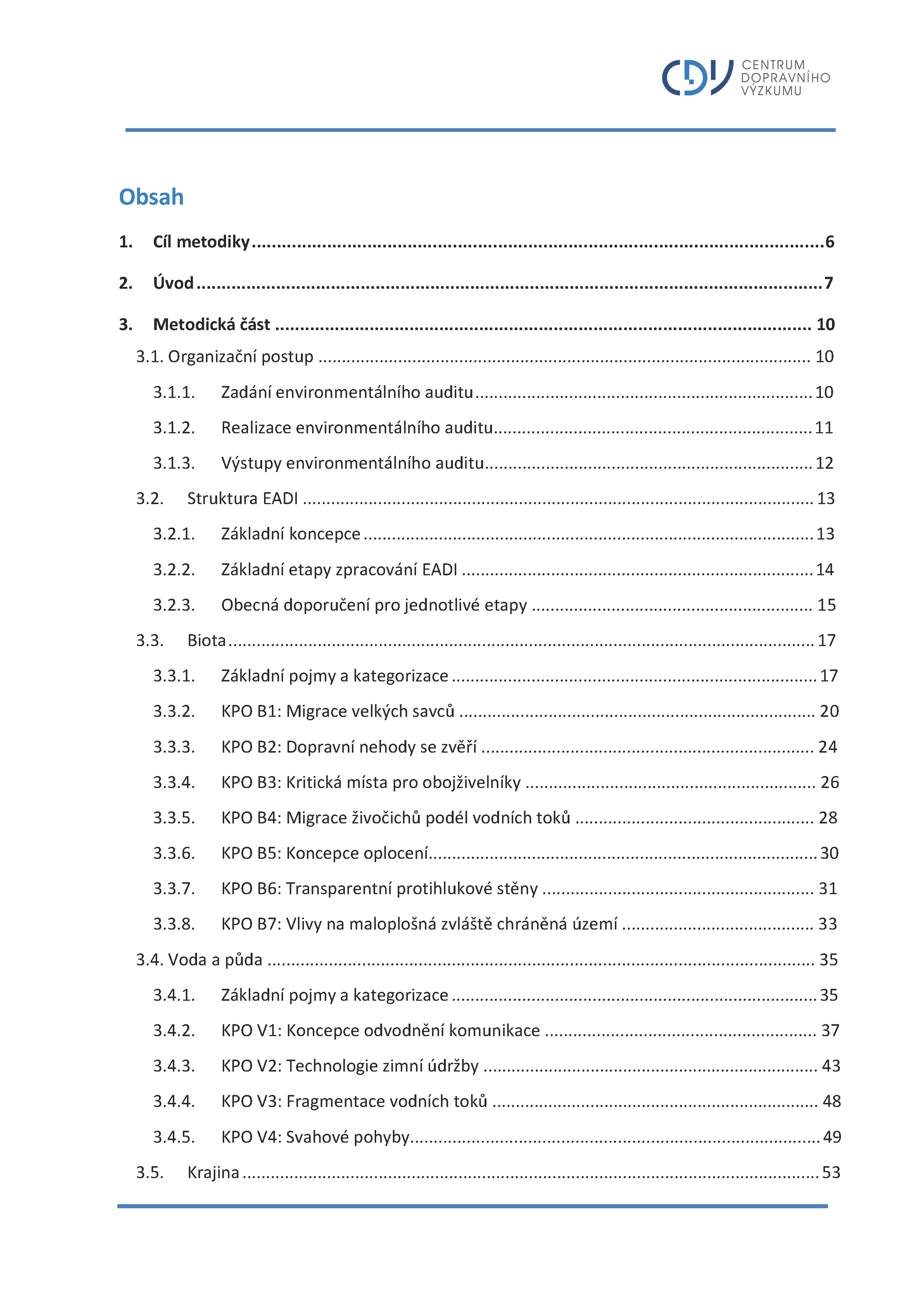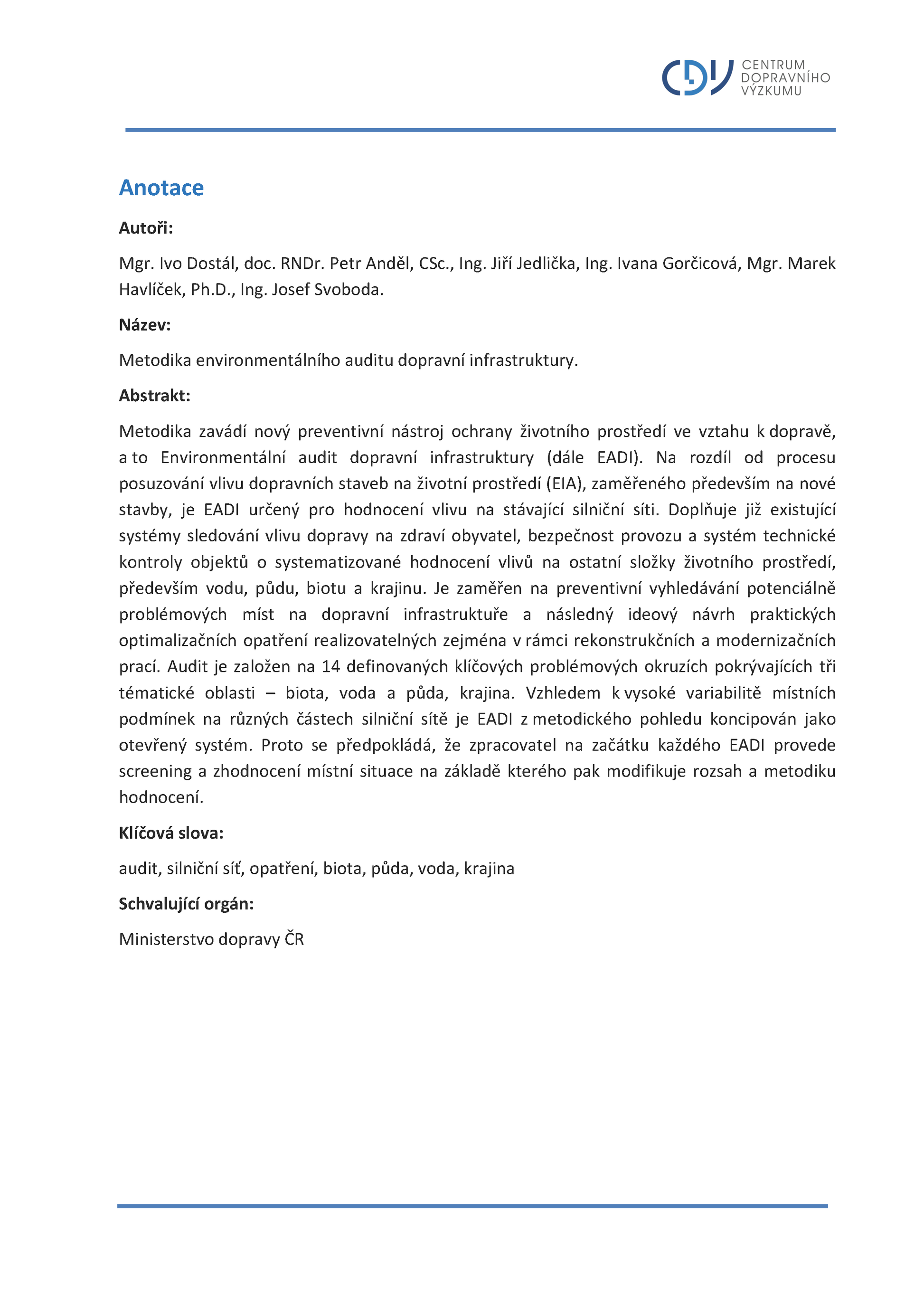 Metodika zavádí nový preventivní nástroj ochrany životního prostředí ve vztahu k dopravě, a to Environmentální audit dopravní infrastruktury (dále EADI). Na rozdíl od procesu posuzování vlivu dopravních staveb na životní prostředí (EIA), zaměřeného především na nové stavby, je EADI určený pro hodnocení vlivu na stávající silniční síti.