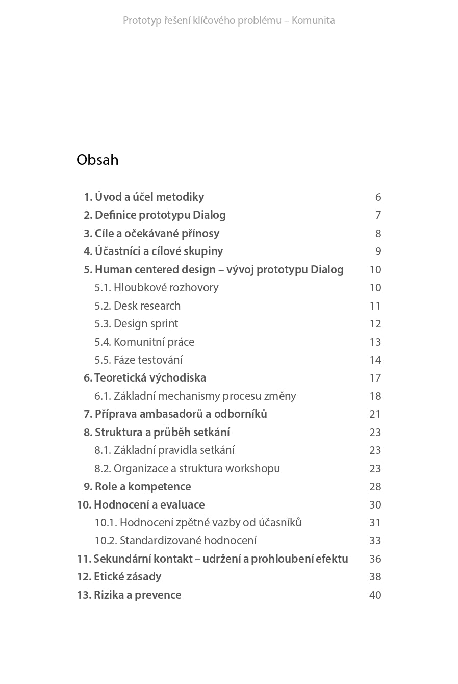 Tento dokument představuje metodický rámec pro realizaci prototypu Dialog, který je jedním z klíčových výstupů projektu Ponehodová péče, zaměřeného na podporu osob zasažených dopravní nehodou a změnu přístupu odborníků z řad pomáhajících profesí. Informace uvedené v publikaci představují shrnutí dat získaných ze série hloubkových rozhovorů, analýzy zahraničních systémů, poznávacích a ideačních workshopů, a nakonec samotné fáze testování tohoto prototypu. Metodika poskytuje jednotný rámec pro přípravu, realizaci a evaluaci těchto setkání a zohledňuje také dvě doplňkové formy podpory – komunitní setkání a osobní konzultace, které posilují účinnost celého prototypu.