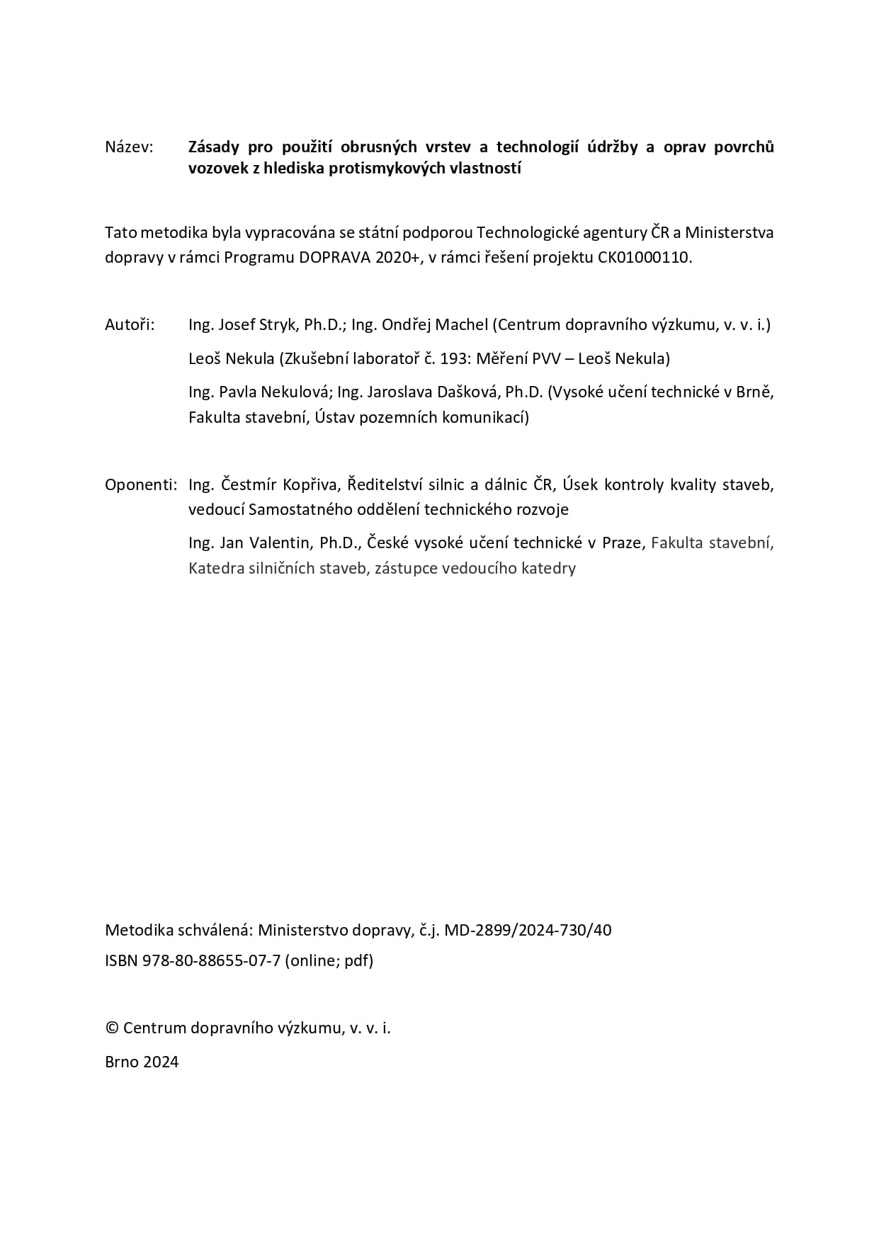 Tato metodika byla vypracována se státní podporou Technologické agentury ČR a Ministerstva dopravy v rámci programu Doprava 2020+, projektu č. CK01000110: Životnost protismykových vlastností povrchů vozovek, její predikce a skutečný vývoj v čase.