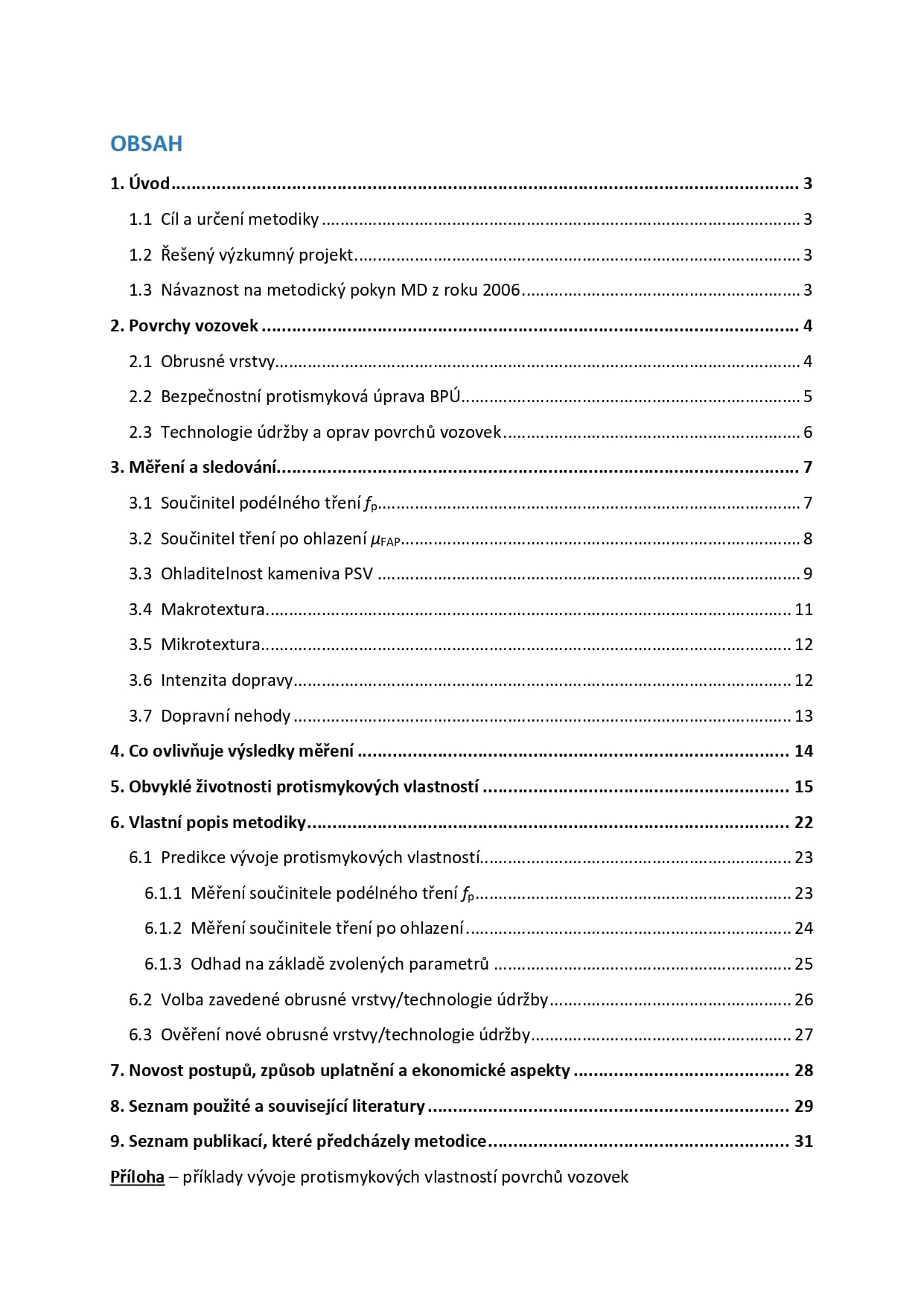 Metodika má sloužit k výběru obrusné vrstvy vozovky nebo technologie údržby a oprav povrchu vozovky, s přihlédnutím k požadovanému hodnocení protismykových vlastností povrchů vozovek. Metodika také upřesňuje, jaké jsou současné možnosti měření protismykových vlastností povrchů vozovek v terénu a v laboratoři, jaké jsou možnosti predikce vývoje tohoto proměnného parametru a uvádí obvyklé životnosti vybraných obrusných vrstev a povrchových úprav vozovek z hlediska protismykových vlastností.